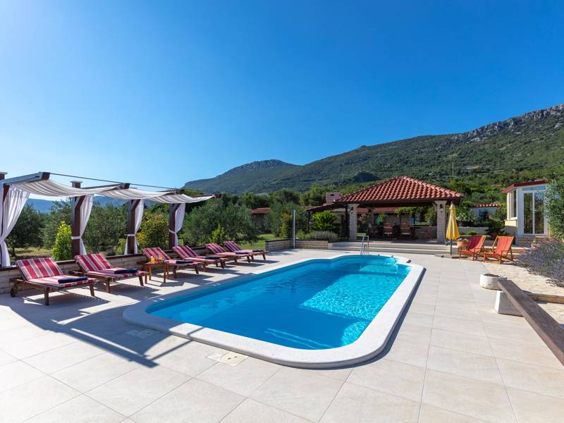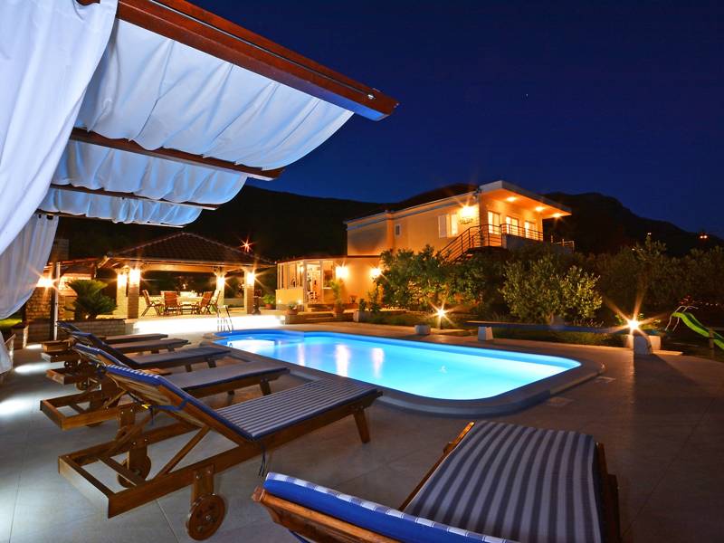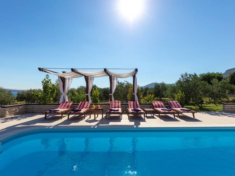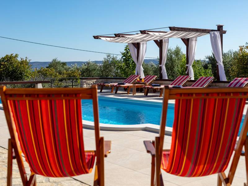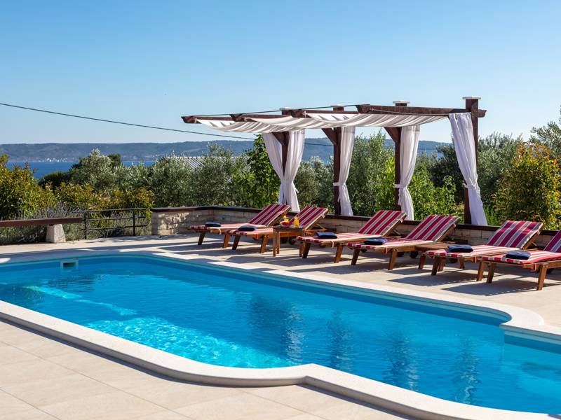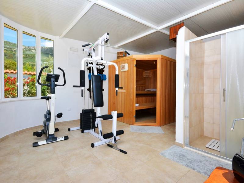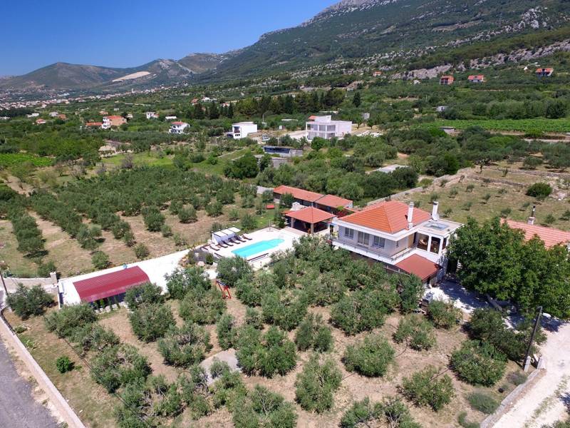 Villa Orhid is a relaxing villa with a heated pool, fitness center and sauna. The accommodation is beautifully located on the slopes of Mount Kozjak, in the upper part of the village of Kaštel Lukšić, one of the seven villages that stretch along the bay between the cities of Split and Trogir, which are under the protection of UNESCO.The villa is located on a large plot, surrounded by olive groves, which gives absolute peace and quiet. For more enjoyment, guests can use the private heated swimming pool, a paved sun terrace with sun loungers, a children's entertainment set, fitness equipment and a sauna.The villa is spread over two floors. On the first floor there are two bedrooms, kitchen, living room / dining room, bathroom and toilet, as well as a covered and open terrace. A double room with a bathroom on the ground floor has its own entrance, while the recreation room is an independent unit next to the main house.Guests can also enjoy the covered part of the yard where there is a barbecue with a large table.Pets are allowed in the villa, the surcharge is EUR 100 per pet/per reservation.Object ID: ctkl340