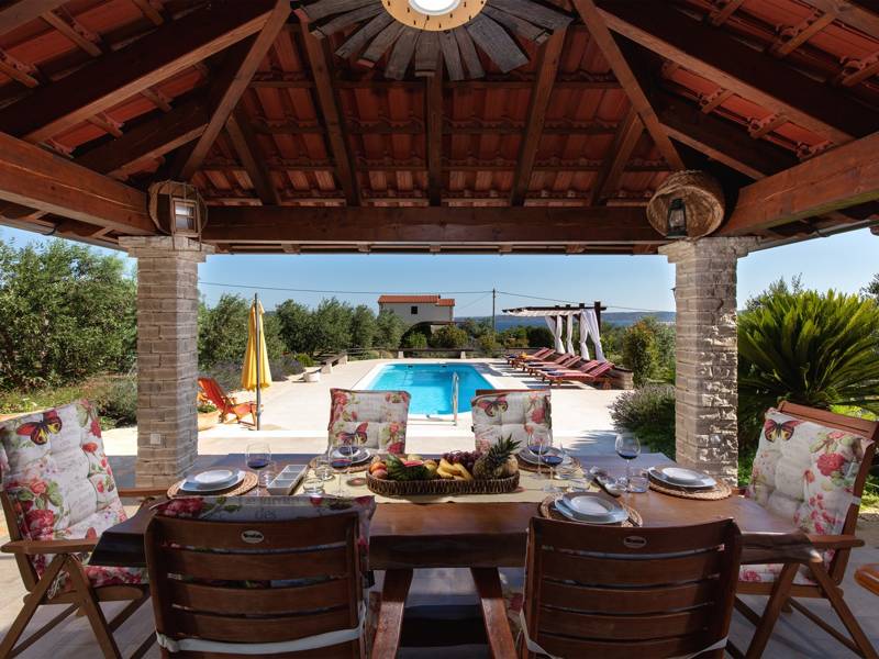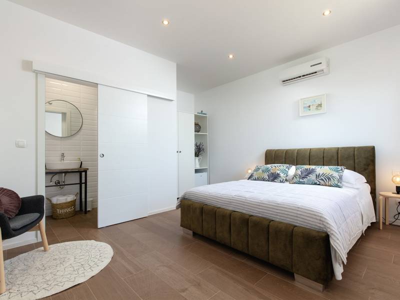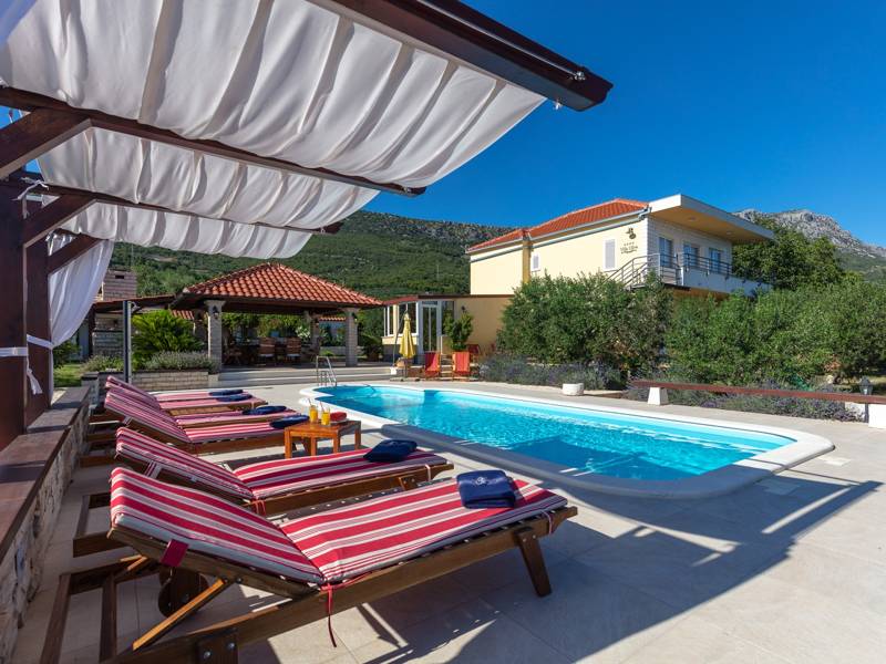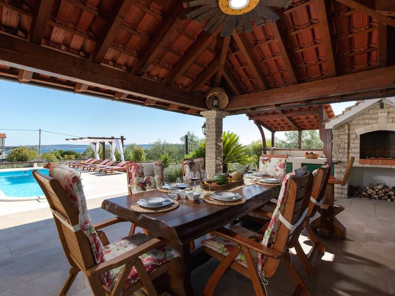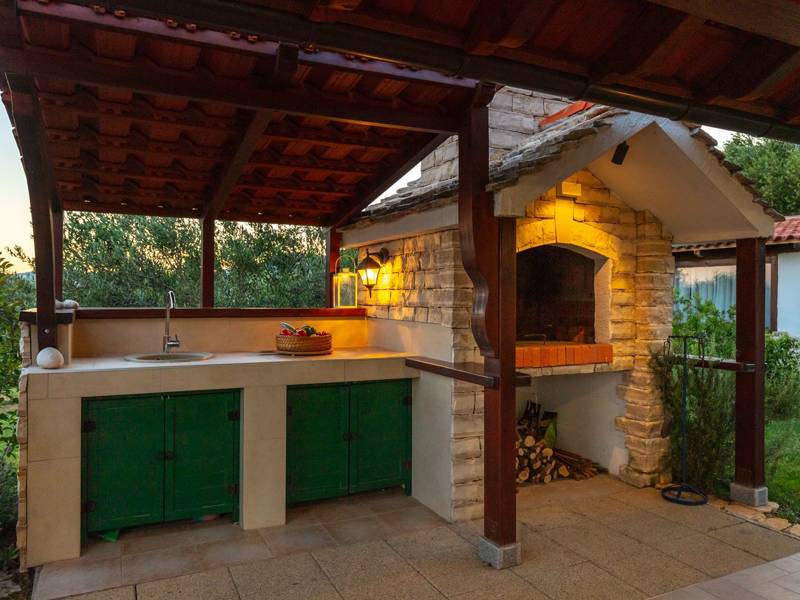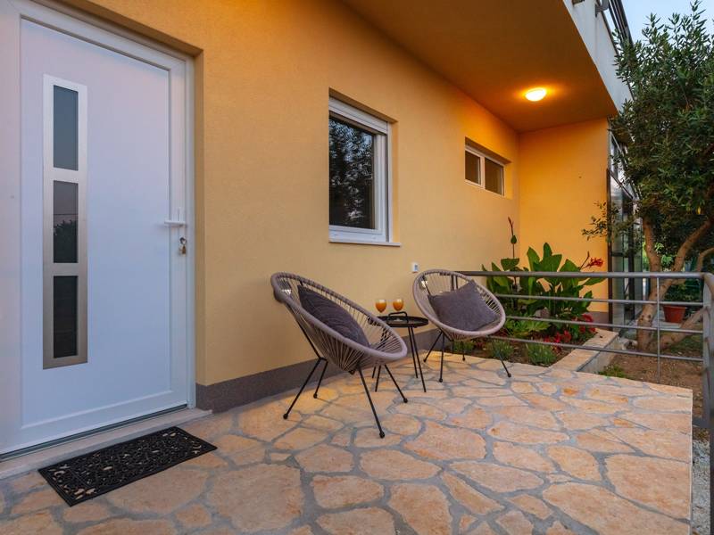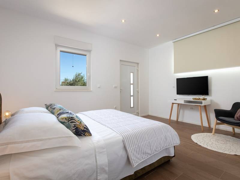 Villa Orhid is a relaxing villa with a heated pool, fitness center and sauna. The accommodation is beautifully located on the slopes of Mount Kozjak, in the upper part of the village of Kaštel Lukšić, one of the seven villages that stretch along the bay between the cities of Split and Trogir, which are under the protection of UNESCO.The villa is located on a large plot, surrounded by olive groves, which gives absolute peace and quiet. For more enjoyment, guests can use the private heated swimming pool, a paved sun terrace with sun loungers, a children's entertainment set, fitness equipment and a sauna.The villa is spread over two floors. On the first floor there are two bedrooms, kitchen, living room / dining room, bathroom and toilet, as well as a covered and open terrace. A double room with a bathroom on the ground floor has its own entrance, while the recreation room is an independent unit next to the main house.Guests can also enjoy the covered part of the yard where there is a barbecue with a large table.Pets are allowed in the villa, the surcharge is EUR 100 per pet/per reservation.Object ID: ctkl340