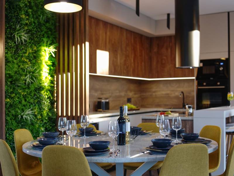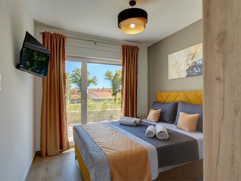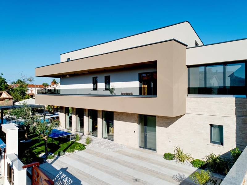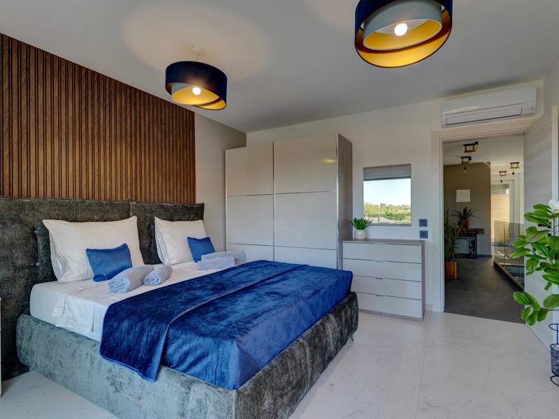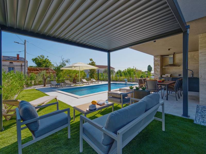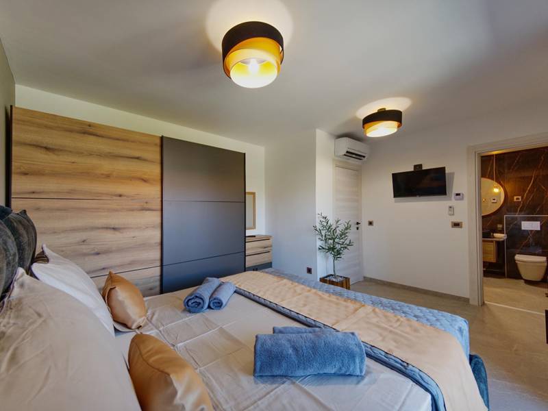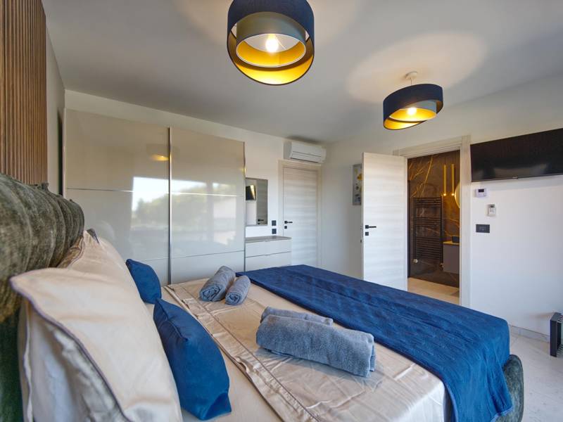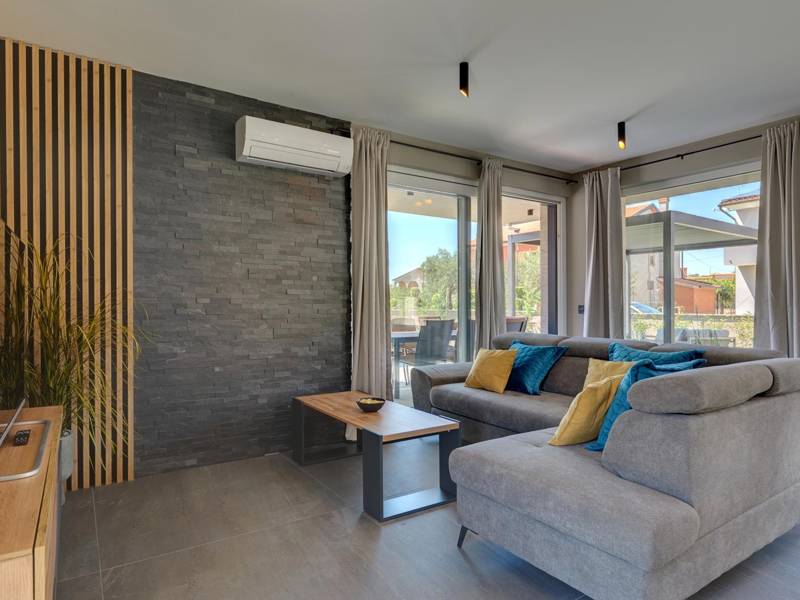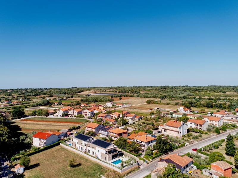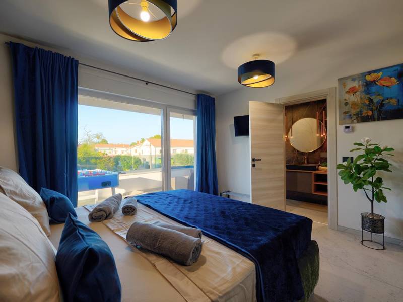 These two modern villas, Villa Bavigo and Villa Pieron, located near Pula, are perfect for a private and comfortable vacation. Connected only by the back wall, they can be rented individually or together, making them ideal for larger families or groups of friends.Both villas offer luxurious accommodation with four bedrooms, four bathrooms, a spacious living room, and a fully equipped kitchen. The outdoor area features a private pool with a waterfall, a cozy dining space, a barbecue, and a summer kitchen. For additional entertainment, there are table tennis and table football.On the first floor of each villa, there is a living room with access to the terrace, one bedroom with a double bed and bathroom, while the second floor includes three more bedrooms, each with a private bathroom and access to the terrace. The wellness area with a hot tub and sauna is also located on this floor, allowing you to relax completely during your stay.Each villa is air-conditioned and suitable for up to eight people, while both villas together can accommodate up to 16 guests. The yard features a private pool, sun loungers, umbrellas, and a covered terrace, perfect for evening gatherings and barbecues. The enclosed yard ensures complete privacy, and there are two private parking spaces available per villa.Book one or both villas and ensure an unforgettable vacation in beautiful Istria. Note: Pets and youth groups are allowed only upon request.