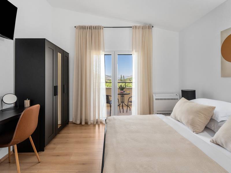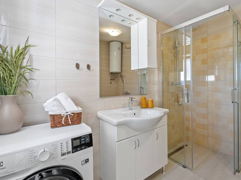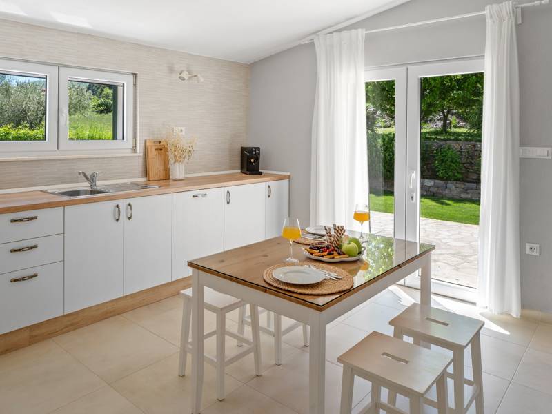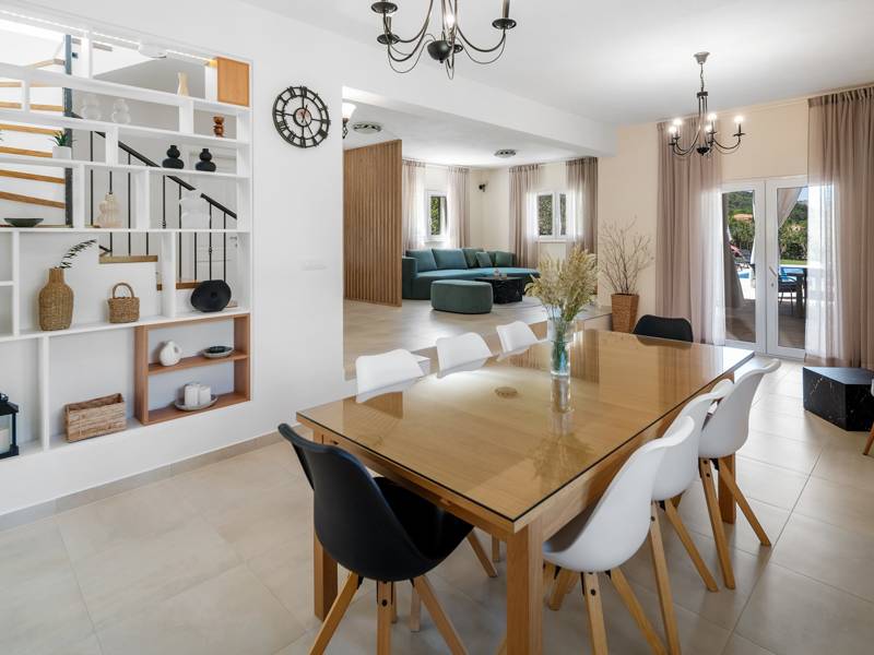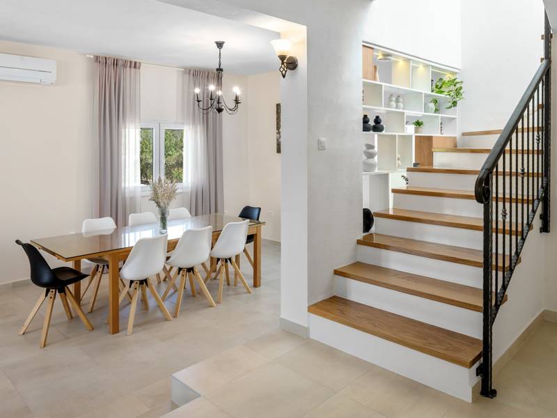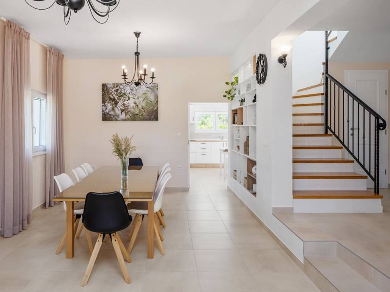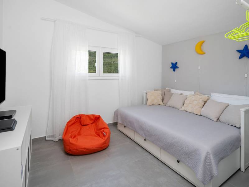 Villa ROKO with 4 bedrooms, 32 sqm heated pool, playground, and great surroundingsVilla Roko is a brand new and modern villa that perfectly fits families and friends for a relaxing holiday in unspoiled surroundings. The villa can accommodate up to 8 people in 4 very comfortable bedrooms with amazing nature views. The location offers absolute privacy in a quiet environment with open views of the valley and hills, with Mediterranean plants in the small village of Tugare. This villa provides a nice getaway from city life. Only 2 km from the minimarket, 3 km to the local restaurant, and 10km from sandy beaches in Omiš, Cetina river with many activities (rafting, zip-line..), and a 20-minute drive to the center of the famous town Split with its great historic attractions.Nicely organized interior (160sqm) on a private plot of 950 sqm offers comfortable 4 bedrooms, 2 family bathrooms, free WiFi, PS4, fully equipped kitchen and two dining areas, living room with TV, and outdoor dining area with the traditional barbecue, table soccer for fun and huge grassplot with trampoline, badminton net, wooden playhouse with a slide, a fun zone for your youngest. The interior is furnished with high-quality, nicely decorated, with carefully selected details, and all a modern guest might need for a very comfortable stay.*The ground floor offers an air-conditioned living room with sofas and a flat-screen TV, free WiFi, a comfy dining area for 8 pax with an exit to the outdoor dining area, a fully equipped kitchen with all you need for a very comfortable stay, microwave, a toaster, kettle, filter and espresso coffee machine, and a table with 4 chairs. Behind the kitchen is bedroom No. 1 which features a queen-size bed (160x200), ideal for kids, and includes a TV with PS4. There is also an exercise bike for your use and a family bathroom with a shower.* The internal staircase takes you to the first floor. It offers Bedroom No2 (A/C), Bedroom No3 (A/C), and Bedroom No 4 (A/C), each with queen-size beds 160cm x 200cm and each with a balcony with beautiful views of the natural environment. There is also a family bathroom with a bathtub, a shower, a bidet, a toilet, and a washing machine. * The outdoors is very spacious and offers so many different fun areas. The private heated swimming pool is 8m x 4m and is not overlooked, with a huge sun deck area with 6 deck chairs and 2 sun umbrellas. The covered outdoor dining area is in front of the living room and offers a wooden table for 8 and table soccer, a traditional barbecue area, an outdoor shower, and a spacious grassplot with several fun zones: a trampoline, a wooden house with a slide, the badminton or volleyball area with a net. The whole property is surrounded by carefully selected Mediterranean plants, flowers, and fruit trees, giving you a very nice, unspoiled, and fulfilling base for perfect and relaxed holidays.
