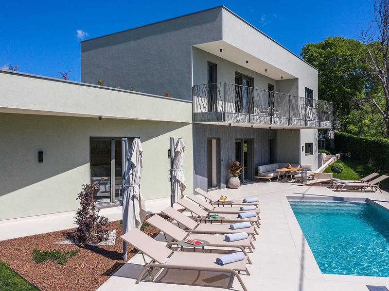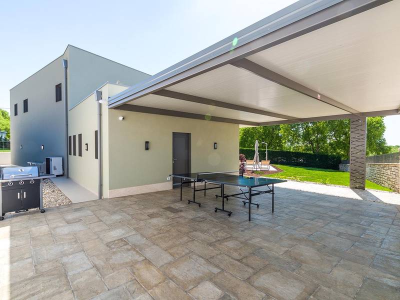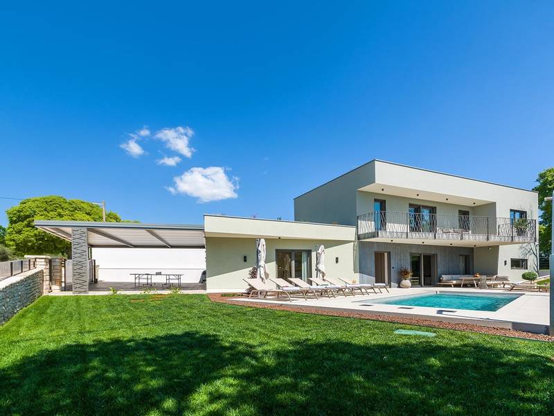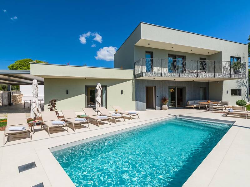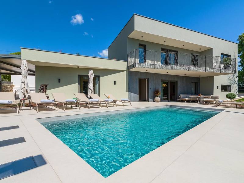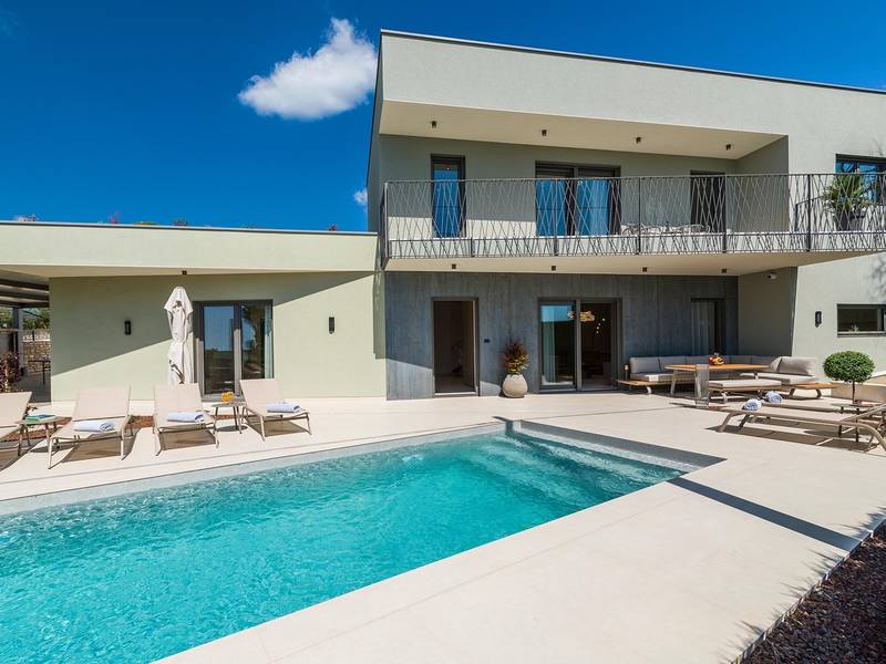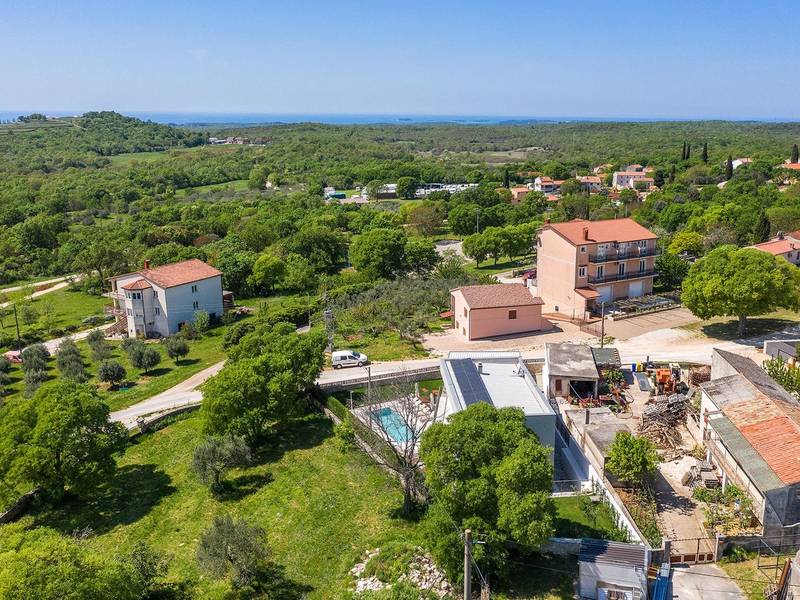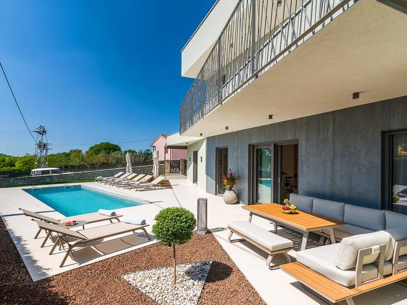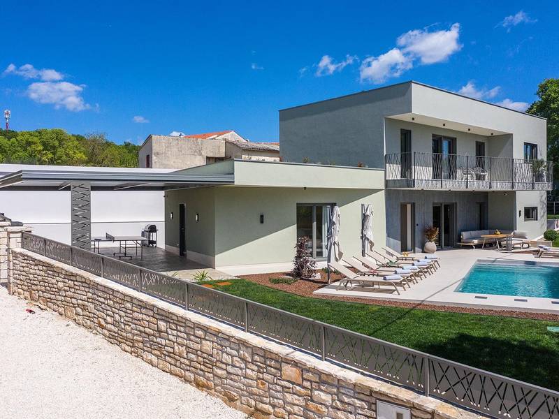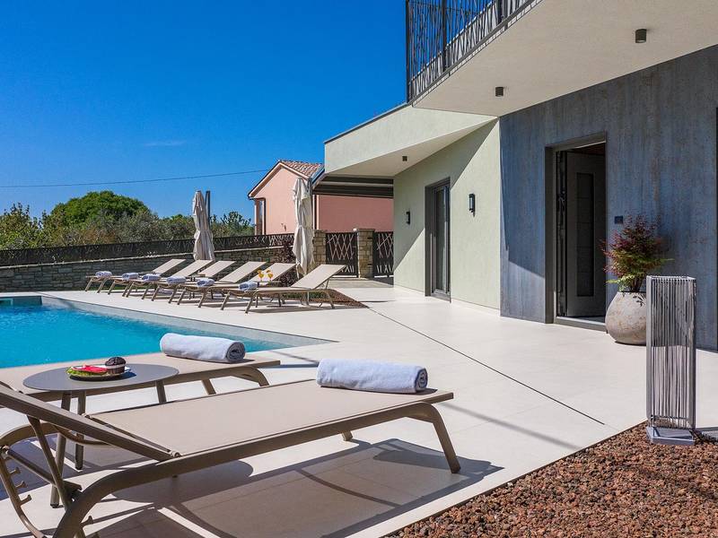 Villa Golden Hill is an exclusive 5-star villa located in the peaceful Istrian village of Golaš, near Bale. Surrounded by nature and greenery, this contemporary villa offers a high level of privacy and discreet luxury, ideal for a relaxing stay in Istria.The villa spans 225 m2 and has been carefully designed to combine functionality and aesthetics. The ground floor features a spacious living area filled with natural light, connected to a modern, fully equipped kitchen and dining area. The open-plan layout creates a welcoming atmosphere, while direct access to the covered terrace ensures a seamless transition between indoor and outdoor living.One bedroom is located on the ground floor with direct access to the pool, while the other two elegantly designed bedrooms are on the upper floor. All bedrooms feature en-suite bathrooms, air conditioning, and TV. Large beds (200x210 cm) provide exceptional comfort, while additional beds allow flexible accommodation for families.The outdoor area offers a complete open-air living experience. The private swimming pool (24 m2) is surrounded by sun loungers and a landscaped garden, while the covered terrace with outdoor dining area invites relaxed meals. A gas barbecue enhances the Mediterranean lifestyle experience.The property is fully fenced and arranged as a green area, ensuring privacy and peace. Guests have access to private shaded parking.Villa Golden Hill is equipped with underfloor heating and air conditioning, ensuring comfort throughout the year. WiFi, a safe, washing machine, dryer, and all essential household amenities are available for a carefree stay.Located in a quiet setting, the villa is still well connected – a restaurant is just 200 meters away, while shops in Bale are only a short drive. The sea and beaches are approximately 12 km away, and Pula Airport is 25 km away.Villa Golden Hill offers a perfect balance of modern comfort, privacy, and natural surroundings – an ideal place for a truly relaxing stay in Istria.The house is not suitable for youth groups.Pets are not allowed.Smoking is not permitted indoors.