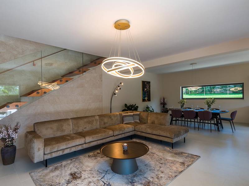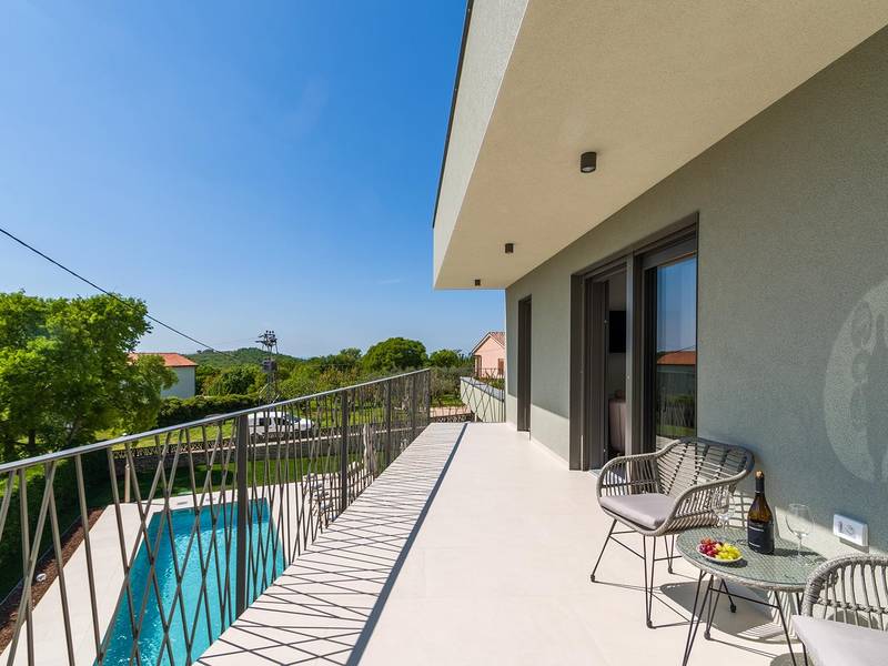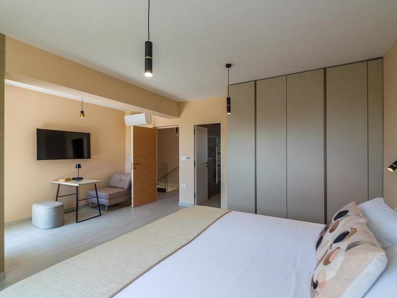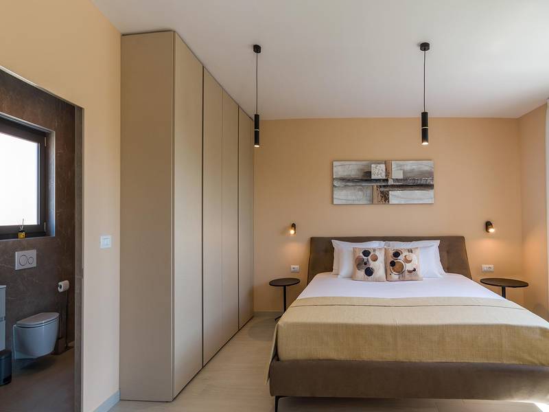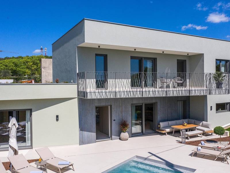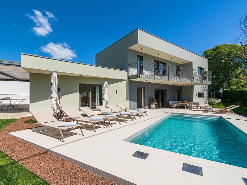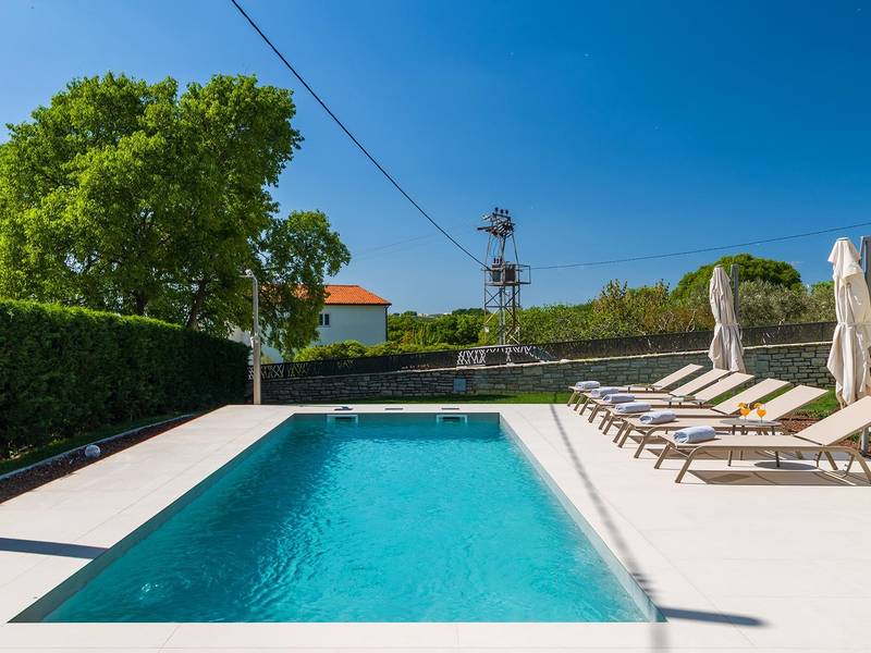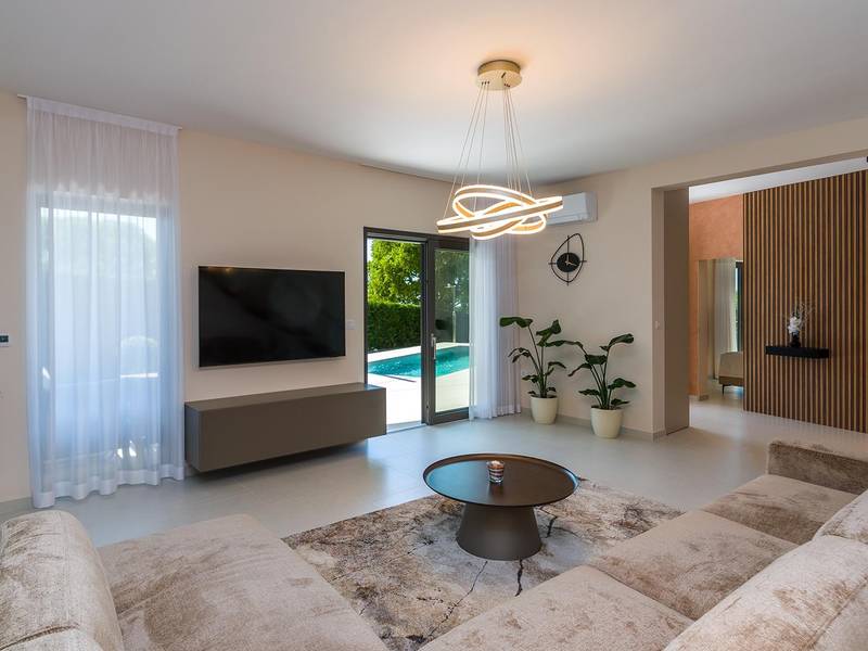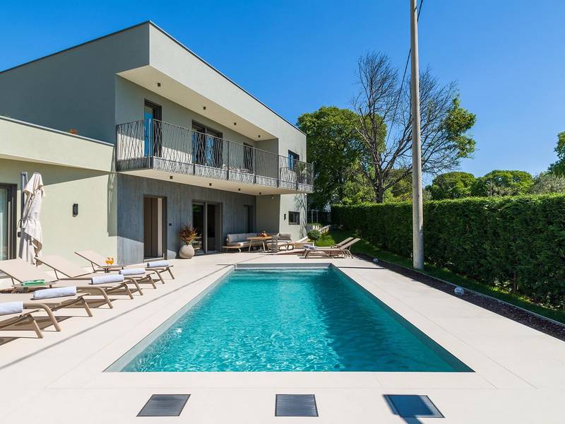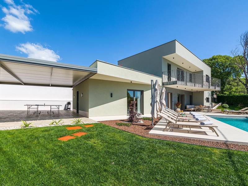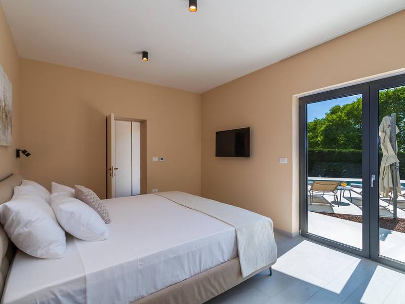 Villa Golden Hill is an exclusive 5-star villa located in the peaceful Istrian village of Golaš, near Bale. Surrounded by nature and greenery, this contemporary villa offers a high level of privacy and discreet luxury, ideal for a relaxing stay in Istria.The villa spans 225 m2 and has been carefully designed to combine functionality and aesthetics. The ground floor features a spacious living area filled with natural light, connected to a modern, fully equipped kitchen and dining area. The open-plan layout creates a welcoming atmosphere, while direct access to the covered terrace ensures a seamless transition between indoor and outdoor living.One bedroom is located on the ground floor with direct access to the pool, while the other two elegantly designed bedrooms are on the upper floor. All bedrooms feature en-suite bathrooms, air conditioning, and TV. Large beds (200x210 cm) provide exceptional comfort, while additional beds allow flexible accommodation for families.The outdoor area offers a complete open-air living experience. The private swimming pool (24 m2) is surrounded by sun loungers and a landscaped garden, while the covered terrace with outdoor dining area invites relaxed meals. A gas barbecue enhances the Mediterranean lifestyle experience.The property is fully fenced and arranged as a green area, ensuring privacy and peace. Guests have access to private shaded parking.Villa Golden Hill is equipped with underfloor heating and air conditioning, ensuring comfort throughout the year. WiFi, a safe, washing machine, dryer, and all essential household amenities are available for a carefree stay.Located in a quiet setting, the villa is still well connected – a restaurant is just 200 meters away, while shops in Bale are only a short drive. The sea and beaches are approximately 12 km away, and Pula Airport is 25 km away.Villa Golden Hill offers a perfect balance of modern comfort, privacy, and natural surroundings – an ideal place for a truly relaxing stay in Istria.The house is not suitable for youth groups.Pets are not allowed.Smoking is not permitted indoors.