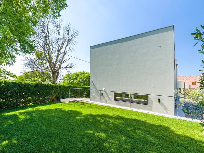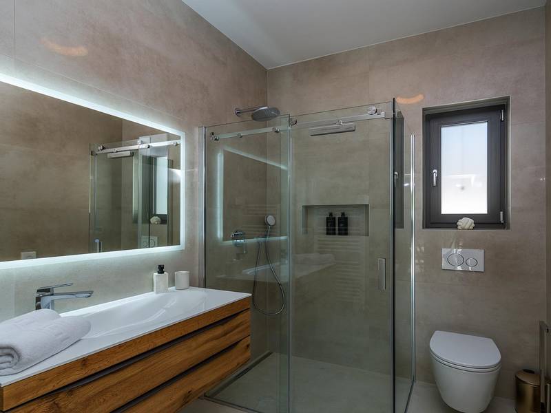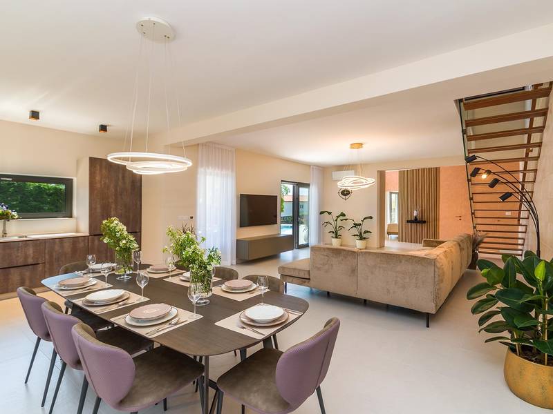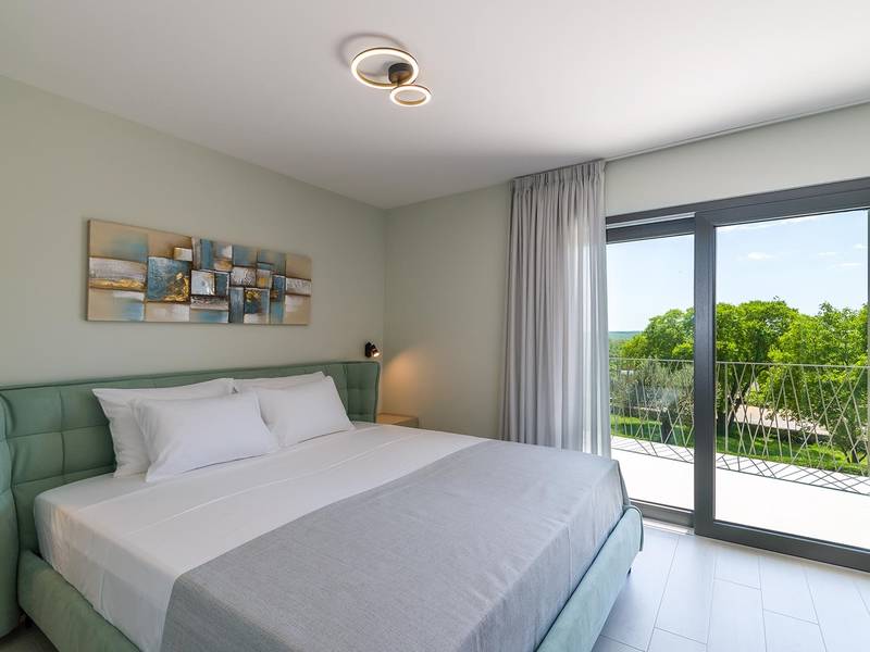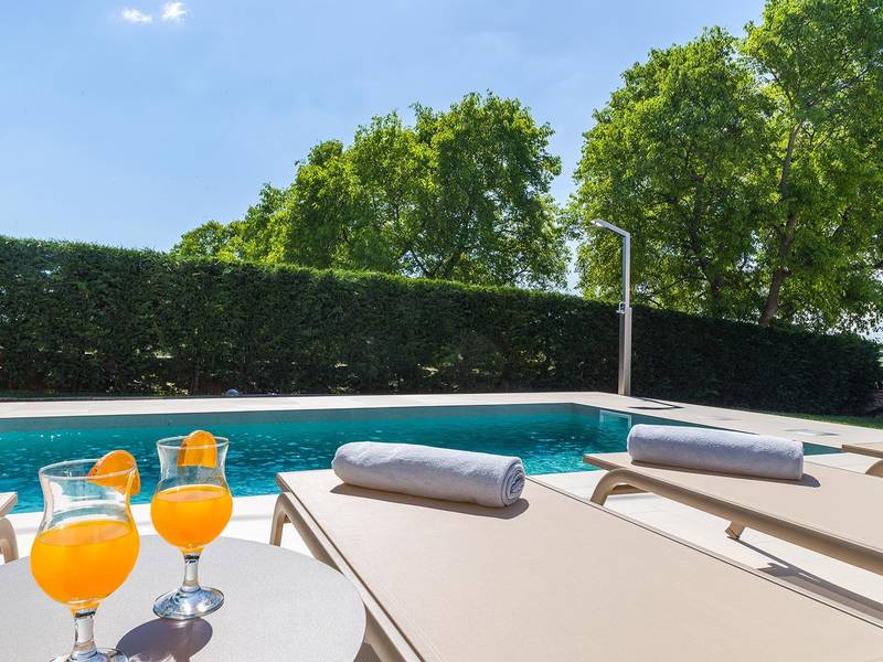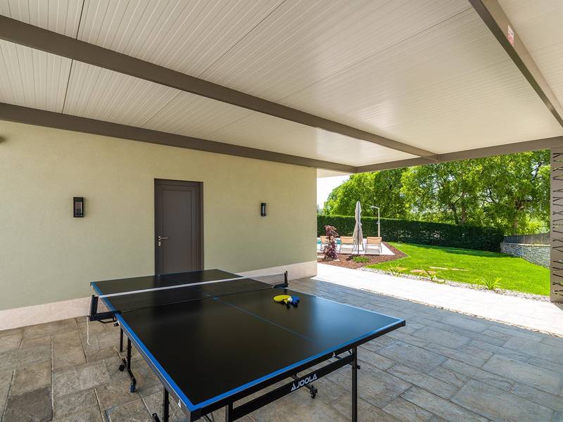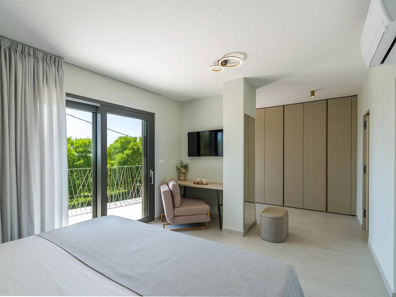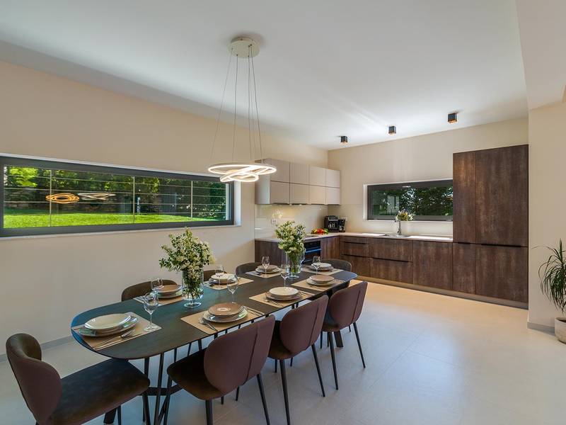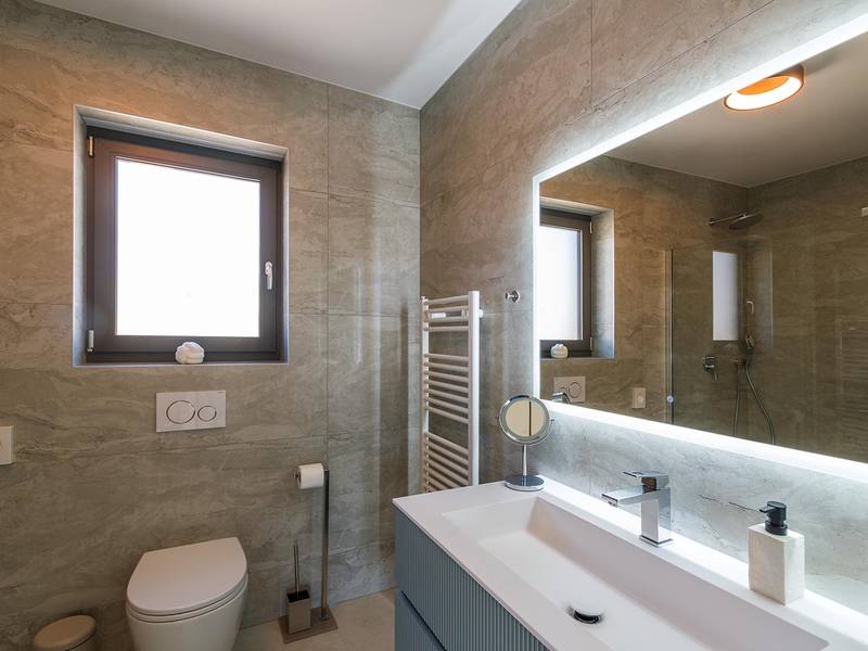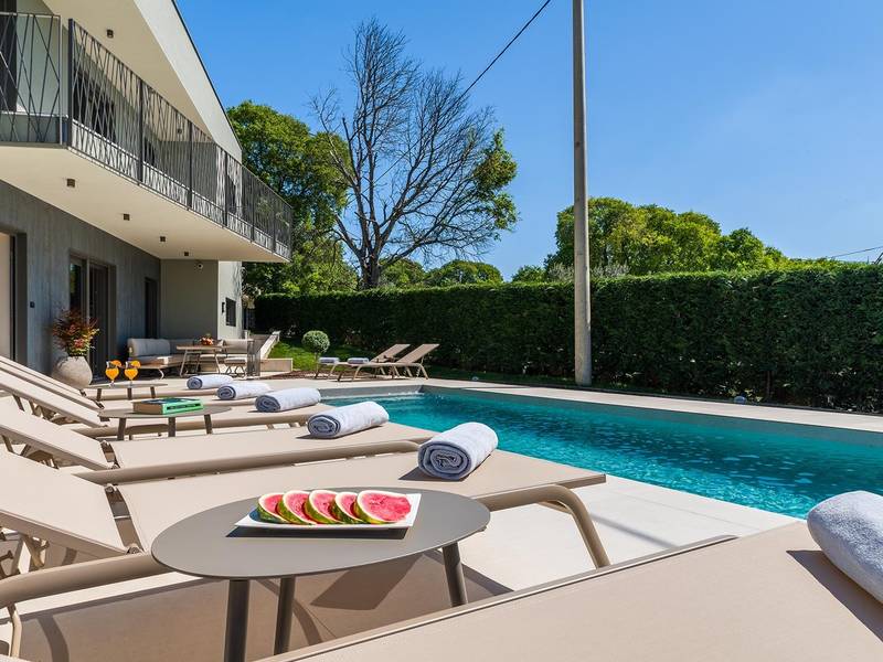 Villa Golden Hill is an exclusive 5-star villa located in the peaceful Istrian village of Golaš, near Bale. Surrounded by nature and greenery, this contemporary villa offers a high level of privacy and discreet luxury, ideal for a relaxing stay in Istria.The villa spans 225 m2 and has been carefully designed to combine functionality and aesthetics. The ground floor features a spacious living area filled with natural light, connected to a modern, fully equipped kitchen and dining area. The open-plan layout creates a welcoming atmosphere, while direct access to the covered terrace ensures a seamless transition between indoor and outdoor living.One bedroom is located on the ground floor with direct access to the pool, while the other two elegantly designed bedrooms are on the upper floor. All bedrooms feature en-suite bathrooms, air conditioning, and TV. Large beds (200x210 cm) provide exceptional comfort, while additional beds allow flexible accommodation for families.The outdoor area offers a complete open-air living experience. The private swimming pool (24 m2) is surrounded by sun loungers and a landscaped garden, while the covered terrace with outdoor dining area invites relaxed meals. A gas barbecue enhances the Mediterranean lifestyle experience.The property is fully fenced and arranged as a green area, ensuring privacy and peace. Guests have access to private shaded parking.Villa Golden Hill is equipped with underfloor heating and air conditioning, ensuring comfort throughout the year. WiFi, a safe, washing machine, dryer, and all essential household amenities are available for a carefree stay.Located in a quiet setting, the villa is still well connected – a restaurant is just 200 meters away, while shops in Bale are only a short drive. The sea and beaches are approximately 12 km away, and Pula Airport is 25 km away.Villa Golden Hill offers a perfect balance of modern comfort, privacy, and natural surroundings – an ideal place for a truly relaxing stay in Istria.The house is not suitable for youth groups.Pets are not allowed.Smoking is not permitted indoors.