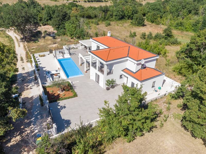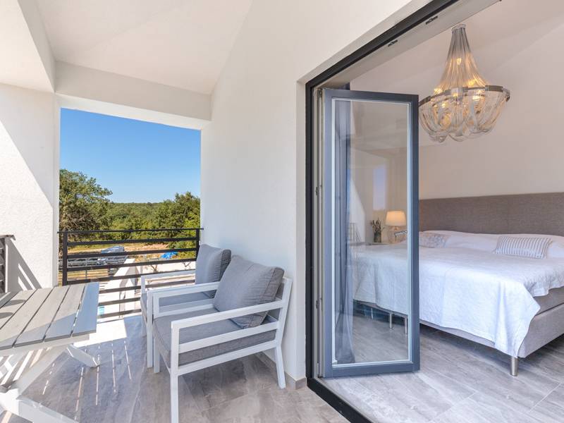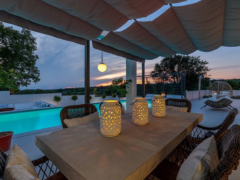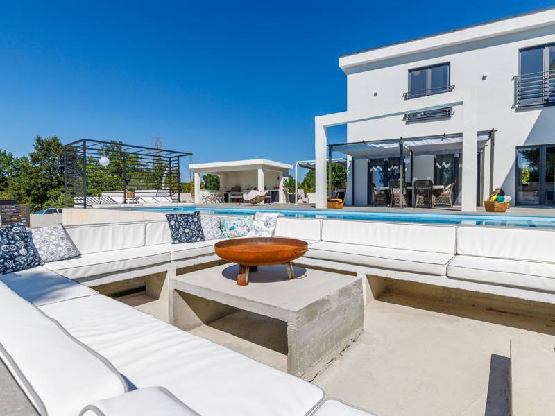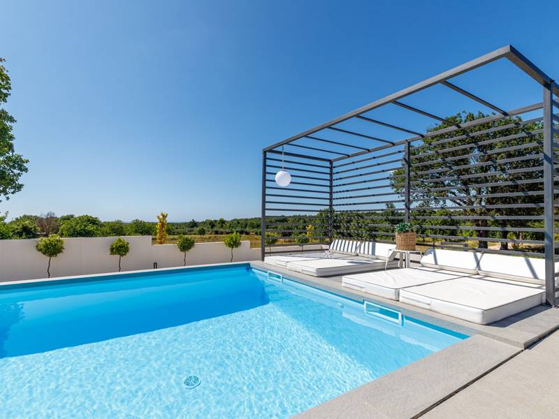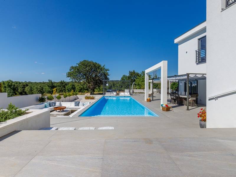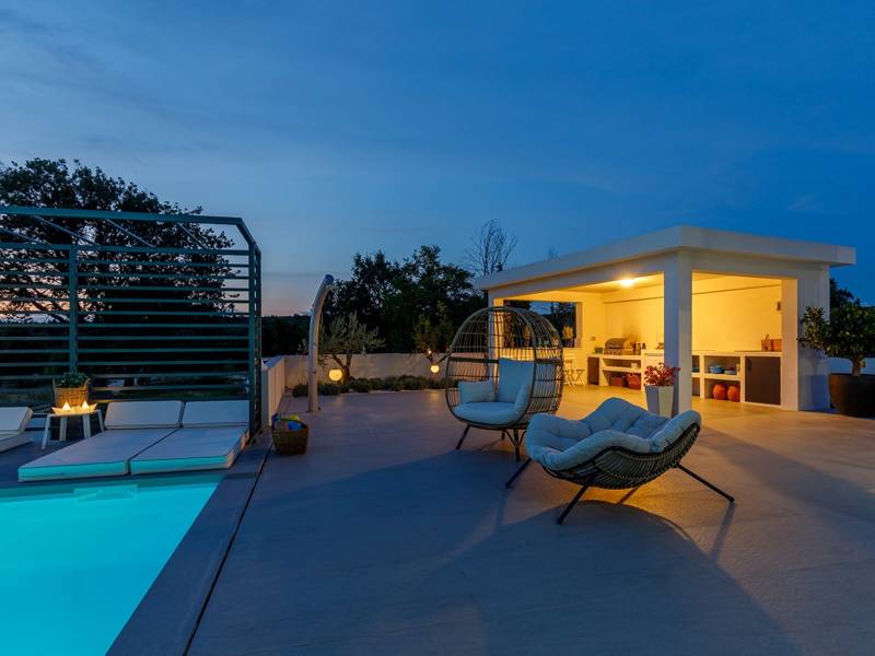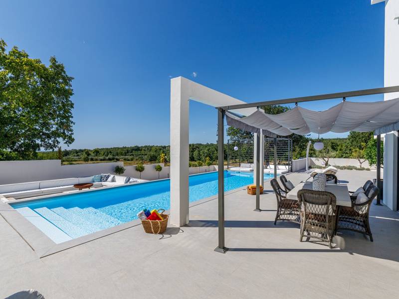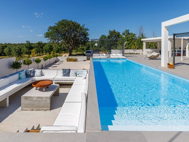 Luxury Villa Valhalla is the ideal accommodation for up to 8 guests. It is located in an idyllic surrounding of central Istria, in a small village called Barat, near Kanfanar.The villa consists of 4 spacious air-conditioned bedrooms with kingsize beds, each with its own private bathroom. One of the bedrooms has an exit to the balcony. An additional separate WC can be found near the living room. On the ground floor, you can find a tastefully decorated living room that combines modern and local elements. The living room is connected to the fully equipped kitchen with all necessary cooking appliances and a dining area. Outdoors, you can enjoy swimming in the pool (55m2) or relax on sunbeds located right next to the pool. In the evenings, you can gather your family on the terrace or preparing meals in the fully equipped summer kitchen with BBQ grill, which can be found on the property. Also, there's a separate seating lounge next to the pool. There is also a jacuzzi on offer, where you can enjoy a relaxing evening. We invite you to join us under the summer sun in Istria and enjoy this beautiful location.Youth groups are not allowed...