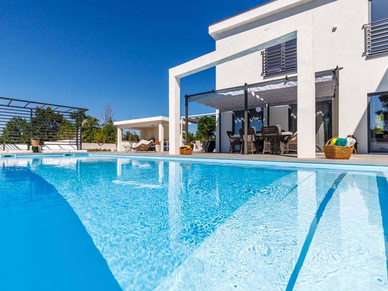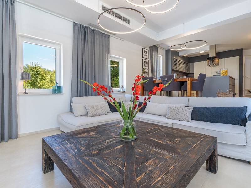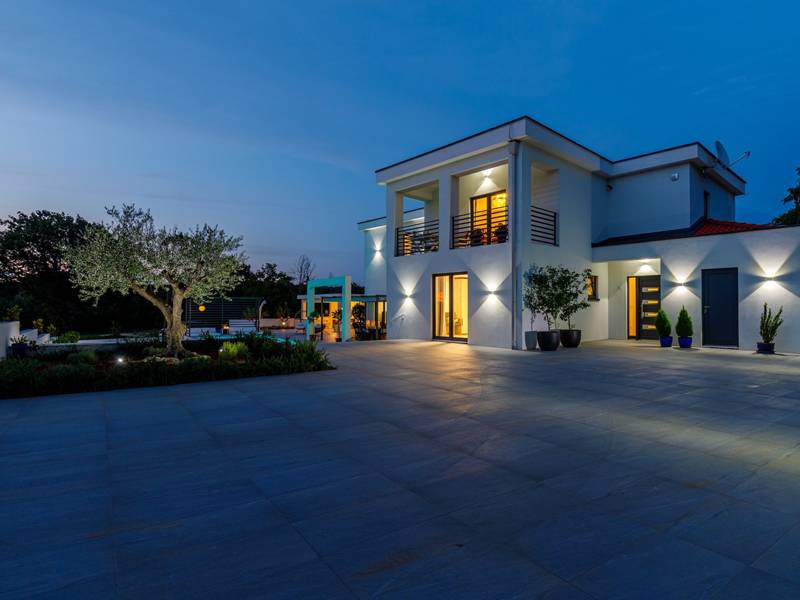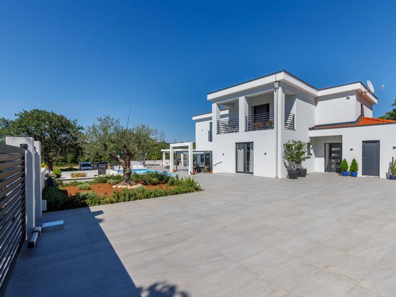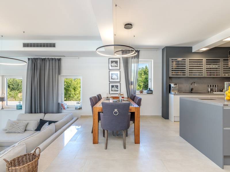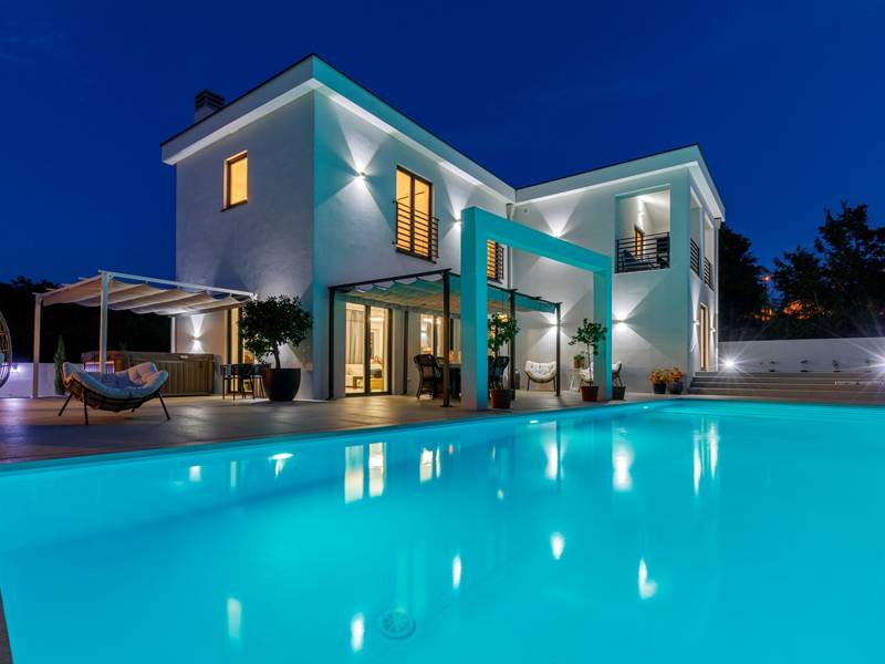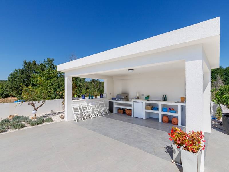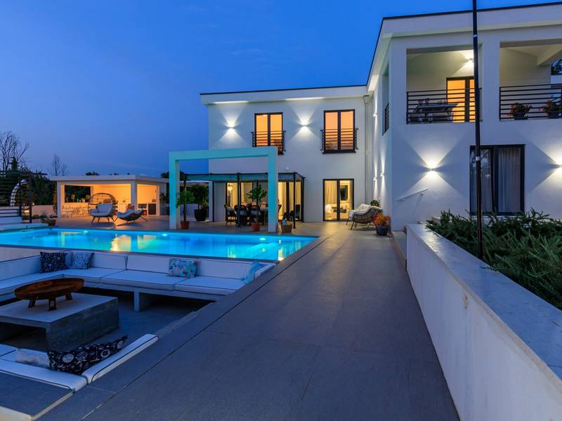 Luxury Villa Valhalla is the ideal accommodation for up to 8 guests. It is located in an idyllic surrounding of central Istria, in a small village called Barat, near Kanfanar.The villa consists of 4 spacious air-conditioned bedrooms with kingsize beds, each with its own private bathroom. One of the bedrooms has an exit to the balcony. An additional separate WC can be found near the living room. On the ground floor, you can find a tastefully decorated living room that combines modern and local elements. The living room is connected to the fully equipped kitchen with all necessary cooking appliances and a dining area. Outdoors, you can enjoy swimming in the pool (55m2) or relax on sunbeds located right next to the pool. In the evenings, you can gather your family on the terrace or preparing meals in the fully equipped summer kitchen with BBQ grill, which can be found on the property. Also, there's a separate seating lounge next to the pool. There is also a jacuzzi on offer, where you can enjoy a relaxing evening. We invite you to join us under the summer sun in Istria and enjoy this beautiful location.Youth groups are not allowed...