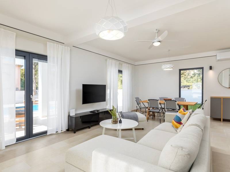 This amazing modern villa is located in the village of Betiga, only 800 meters from the nearest beach, 18 km from the largest Istrian city - the beautiful city of Pula, and 20 km from the famous tourist destination - the city of Rovinj. Offering 3 bedrooms with double beds, and a sofa bed in the living room, this tastefully furnished and fully air-conditioned villa can accommodate up to 8 people. The ground floor of the villa consists of a fully equipped kitchen, dining area, spacious living room, and a bathroom with a shower and a washing machine. On the first floor, there are 2 bathrooms with showers and three bedrooms with exits to a balcony overlooking the garden. In addition to the 32 sqm swimming pool in the 500 sqm garden, sun loungers, and barbecue area, the guests can also have fun on the children's playground including a swing set, a seesaw, and a slide. There are also 3 private parking spots provided inside the fenced garden. This villa is the perfect spot for a relaxing vacation with your family or friends.
