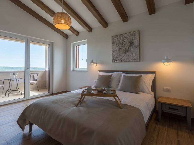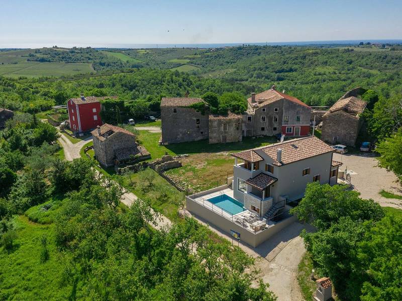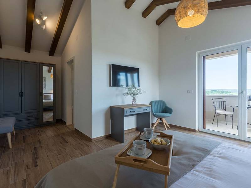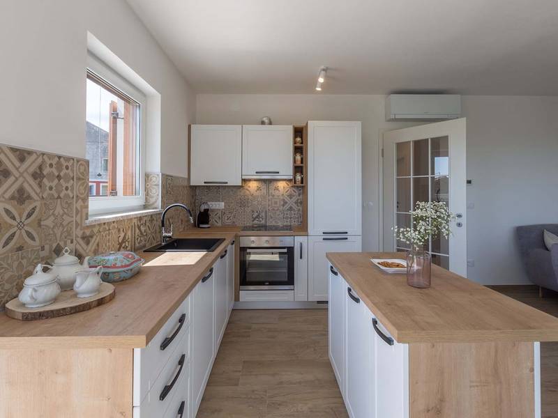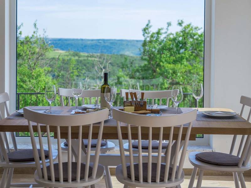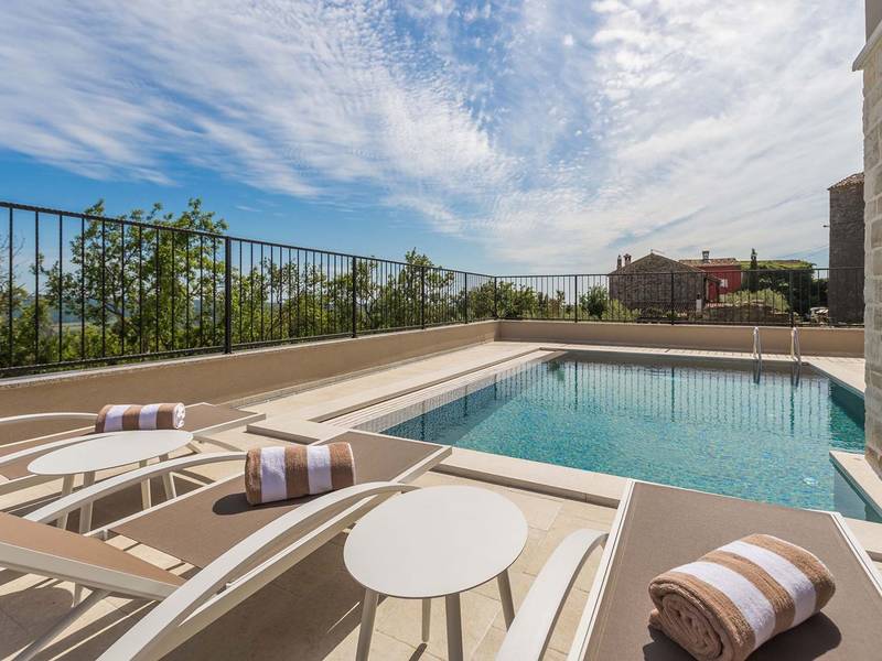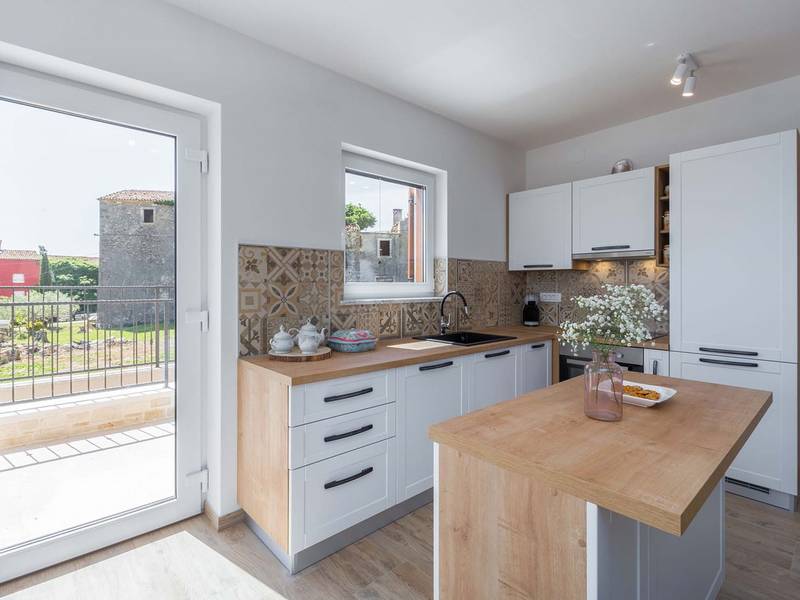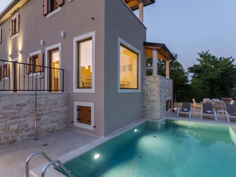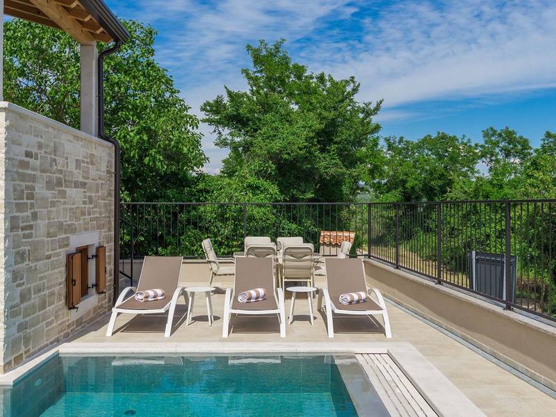 Villa Skarline is located in a place named Baredine, near Istrian town Buje famous for winemaking. The most dominating feature of this vacation house for 6-8 people is its beautiful view of the Istrian landscape. The pastel nuances of the luminous interior give this house a calming and relaxing effect. Several vintage elements (such as teapot with cups, coffee grinder, antique kitchen tiles etc.) evoke the old romantic times. The villa is surrounded by old houses with the original Istrian architecture. The house is consisted of two floors that contain three bedrooms with bathrooms, a living room and a dining room with kitchen. The exterior of the place offers a 27 m2 large pool with a sun deck, summer kitchen and lots of greenery. Some of the properties don’t allow youth groups. If you are booking an accommodation facility as a group of young individuals, contact our agency before making the reservation in order to check whether the requested property allows your stay.