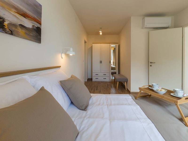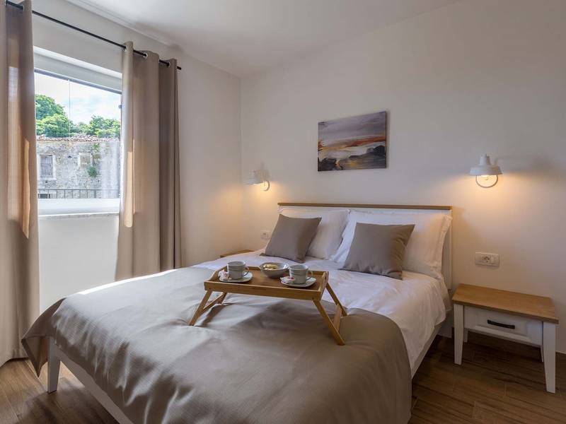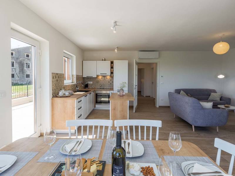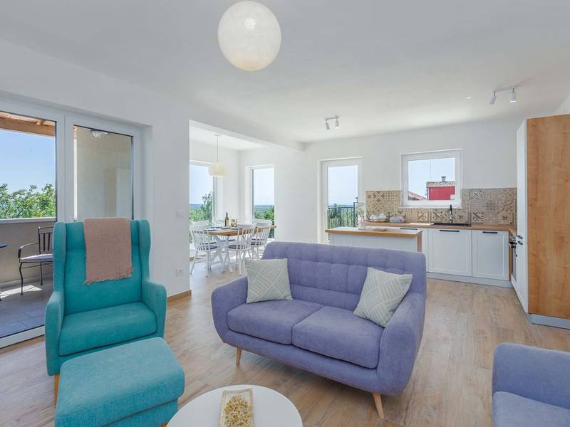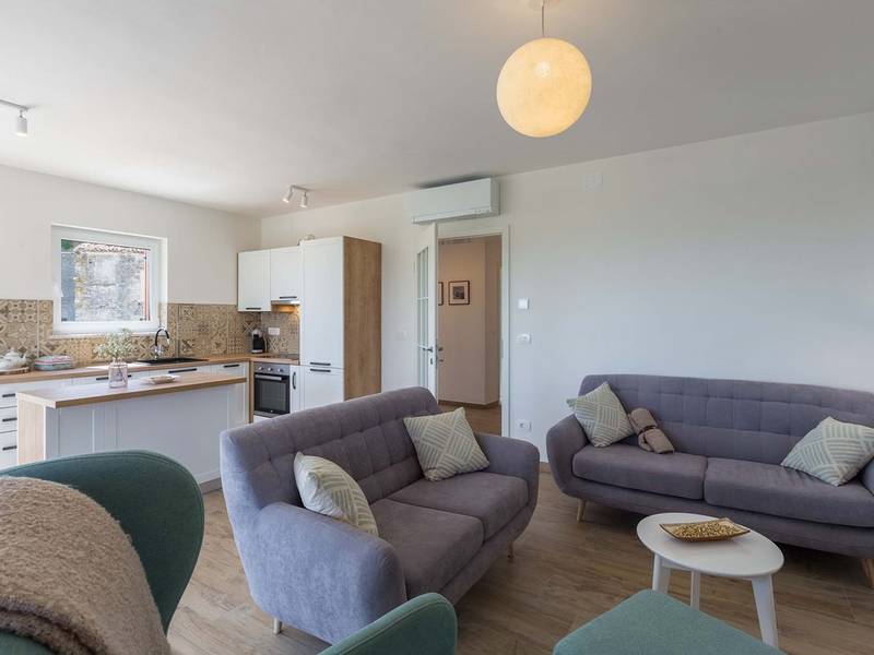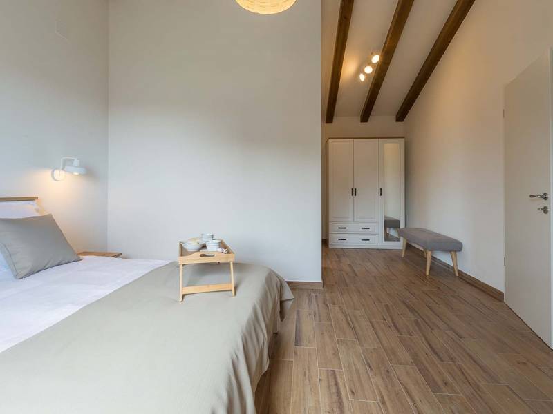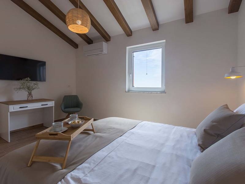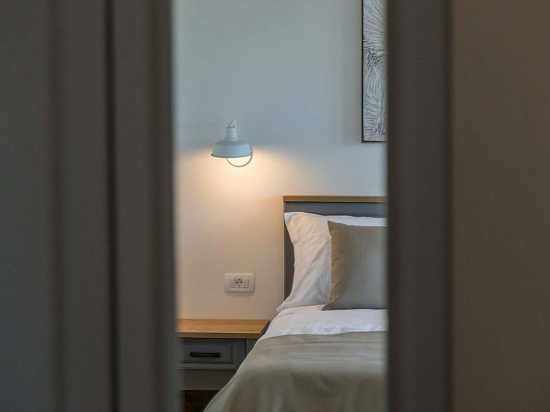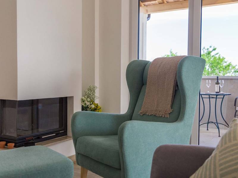 Villa Skarline is located in a place named Baredine, near Istrian town Buje famous for winemaking. The most dominating feature of this vacation house for 6-8 people is its beautiful view of the Istrian landscape. The pastel nuances of the luminous interior give this house a calming and relaxing effect. Several vintage elements (such as teapot with cups, coffee grinder, antique kitchen tiles etc.) evoke the old romantic times. The villa is surrounded by old houses with the original Istrian architecture. The house is consisted of two floors that contain three bedrooms with bathrooms, a living room and a dining room with kitchen. The exterior of the place offers a 27 m2 large pool with a sun deck, summer kitchen and lots of greenery. Some of the properties don’t allow youth groups. If you are booking an accommodation facility as a group of young individuals, contact our agency before making the reservation in order to check whether the requested property allows your stay.