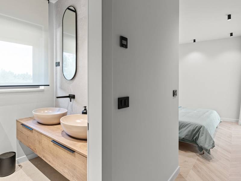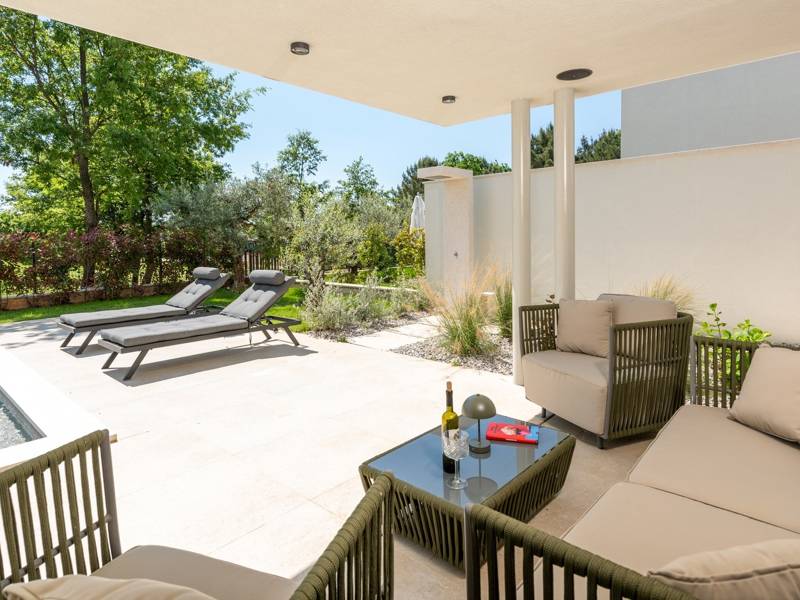 Treat yourself and your loved ones to a perfect vacation by staying in the beautiful Villa Tranquilla, located in the greenery of northern Istria. This exceptional villa can accommodate up to 6 people, making it the perfect choice for a larger family or a group of friends looking for an escape from the everyday life. The modern, fully air-conditioned villa offers all the luxury of a contemporary home. Three spacious bedrooms with double beds are at your disposal located on the first floor of the house with access to the terrace. Each bedroom has its own bathroom, two of which have a walk-in shower while one has a free-standing bathtub. On the ground floor of the house there is a fully equipped modern kitchen with a kitchen island, as well as a dining table for 6 people. There is also a spacious living room with direct access to the courtyard, for pleasant moments spent in the company of loved ones. In the perfectly landscaped yard, the first thing you will notice is the swimming pool with its sunbeds, for all-day enjoyment in the warm Mediterranean sun. There is also a covered outdoor kitchen for preparing delicious meals that you can serve on the outdoor dining table, a lounge for relaxing you’re your favorite morning drink, and a sauna. A detail of this villa that will delight you is the rooftop terrace with a jacuzzi, a bioclimatic pergola and an outdoor kitchen, a space tailored for pleasant evening gatherings.