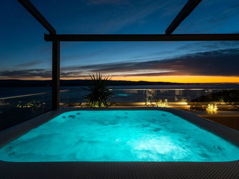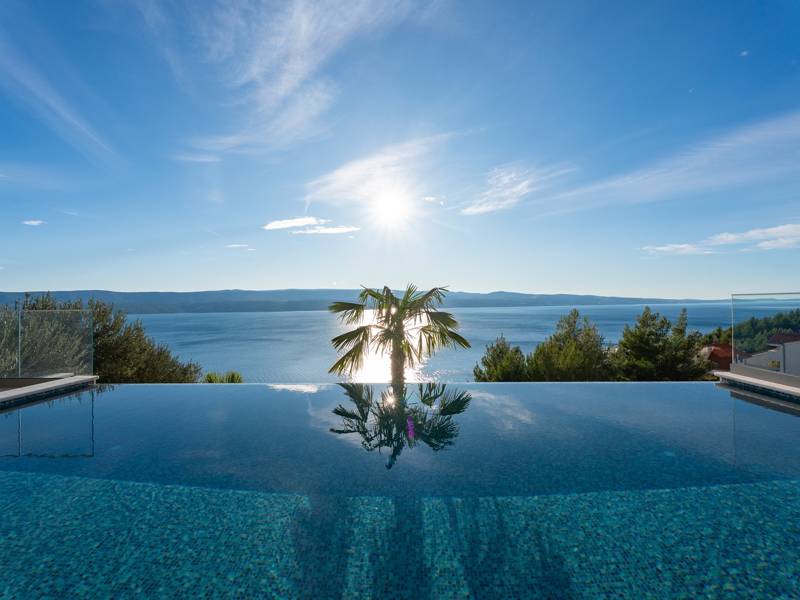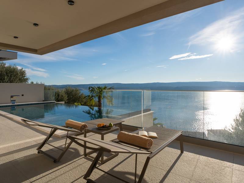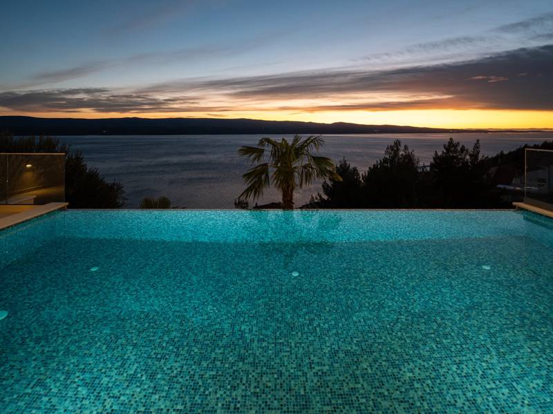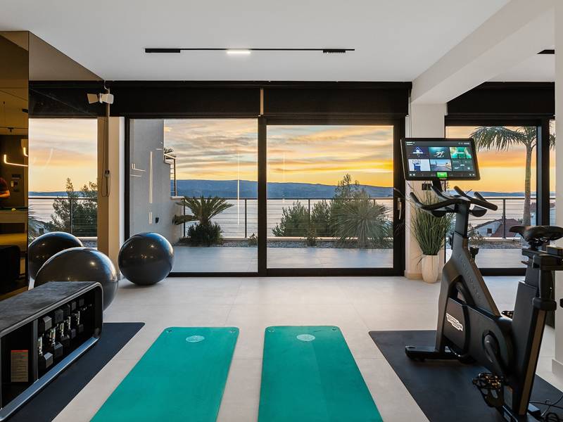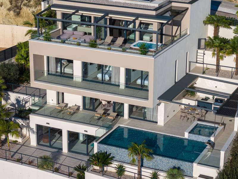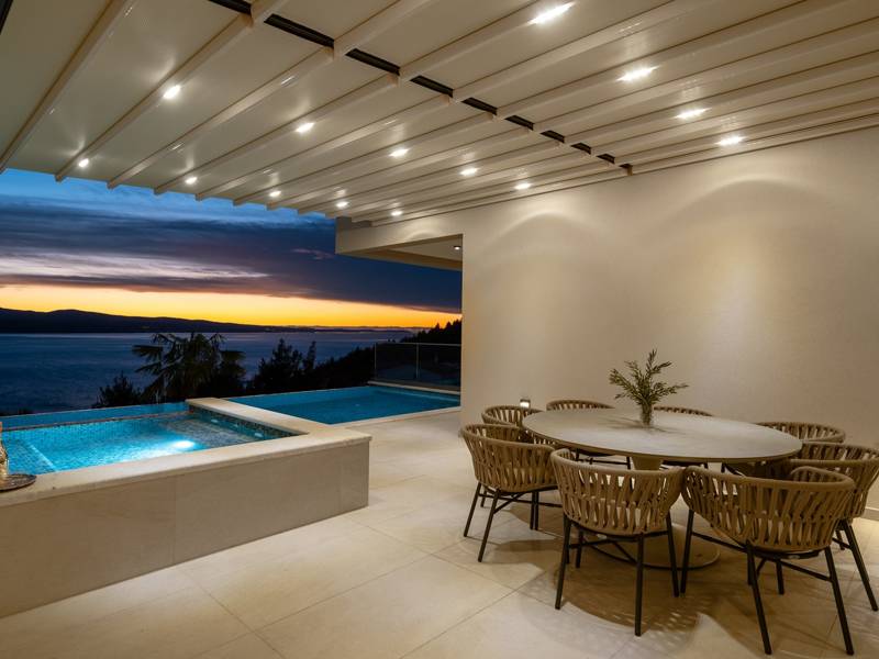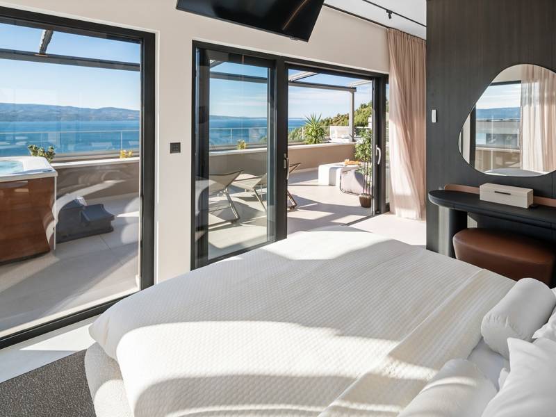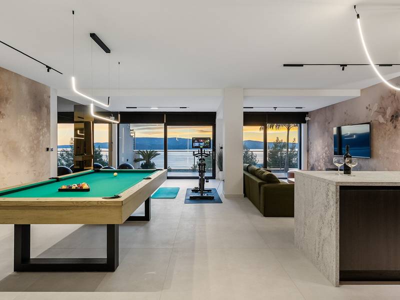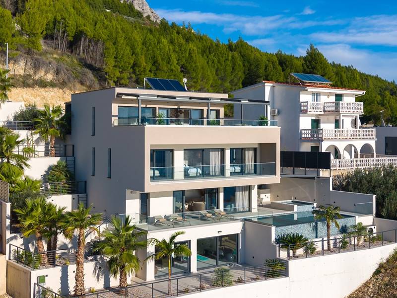 Experience unparalleled comfort, private amenities, and breathtaking Dalmatian coast vistas in this stunning luxury retreatDiscover the stunning and truly luxurious 5-bedroom Villa Million Dreams, which offers a heated infinity pool of 40 sqm with an attached hydromassage area, a Jacuzzi (Whirlpool) on the upper terrace, a fully equipped gym, Finnish sauna, billiard table, and high-end furnishings. This villa boasts spectacular sea views from every room. It is furnished exactly as the name suggests—exceptionally organised rooms, very comfortable beds, top-quality furnishings, and equipped with all modern amenities for a very comfortable stay, including free WiFi, full air conditioning, and a surround sound system.The villa is organised over four levels, with 500 sqm of interior space perched on a slope, providing breathtaking sea views from every room. It is a private, fenced property covering 650 sqm. - From the main parking area, the main entrance leads into the villa, where on the top level, you find the master bedroom, No.1, with a terrace that features a hot tub (whirlpool), two deck chairs, a lounge corner, and spectacular sea views. The master bedroom itself is 30 sqm and includes a king-size bed (180cm x 200cm), a TV, air conditioning, and a glass sliding door opening onto the jacuzzi terrace. The en-suite bathroom features a freestanding bathtub, a shower, double sinks, and a toilet. The terrace can be shaded for privacy and comfort.- One level below the parking area are four additional bedrooms, each with en-suite bathrooms and sea views. Bedroom No.2 is 21 sqm, with a queen-size bed (160cm x 200cm), TV, A/C, and a terrace overlooking the sea. Bedroom No.3 is 19 sqm, with two single beds (90cm x 200cm) that can be connected into a king-size, a TV, A/C, and a sea-view terrace. Bedroom No.4 measures 20 sqm, with a queen-size bed (160cm x 200cm), TV, A/C, and en-suite shower, along with sea views. Bedroom No.5 is 24 sqm, with a king-size bed (180cm x 200cm), TV, A/C, en-suite shower, and sea views.- The indoor living and dining area, spanning 65 sqm at pool level, features a fully equipped kitchen with all necessary appliances, including an ice maker, a large freezer, fridge, washing machine, DeLonghi espresso machine, microwave, toaster, kettle, and more. There is a kitchen island and a stylish dining table. The living room is furnished with comfortable sofas, a TV with satellite channels, and large floor-to-ceiling glass sliding doors that connect to the outdoor spaces. A separate guest toilet is also available.- An indoor staircase leads down to the spa and fun zone, which covers 77 sqm and is accessible via both indoor and outdoor staircases. This area includes a kitchenette with a small fridge, freezer, dishwasher, sink, glasses, and dishes, as well as a kitchen island. The indoor entertainment zone features a billiard table, a cosy sofa with a TV, and a gym area equipped with a multifunctional machine, exercise bike, weights, Pilates ball, and yoga mats. Wellness amenities include a Finnish sauna with a walk-in shower and a separate toilet. There is also a laundry room with a washing machine, dryer, ironing board, and iron.- The outdoor area offers a private, heated infinity pool measuring 8m x 4m, with a healthy electrolysed filtration system, a counter-current swimming program, a waterfall, and an attached hydromassage area. The pool is located on the third level, just below the living and kitchen spaces, and is surrounded by a sun deck with eight deck chairs and palm trees, complemented by an outdoor shower. The outdoor dining area, covered for shade, features a gas barbecue and seats ten people, all with spectacular sea views.For added security, the villa has video monitoring at the entrance and parking for up to six cars—two in the garage and four outside. Enhance your stay with personalised services offered through Feriehome, including grocery delivery, private chefs for culinary experiences, relaxing in-villa massages from professional masseuses, sailing adventures with a skipper along the Adriatic coast, and guided boat tours to explore the beautiful islands of Middle Dalmatia.At Villa Million Dreams, every detail has been curated to ensure an unforgettable escape where luxury meets comfort amidst magnificent views. Your dream vacation starts here. Welcome to Villa Million Dreams!