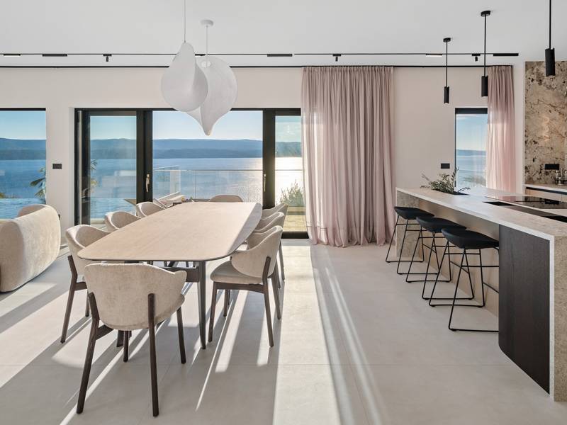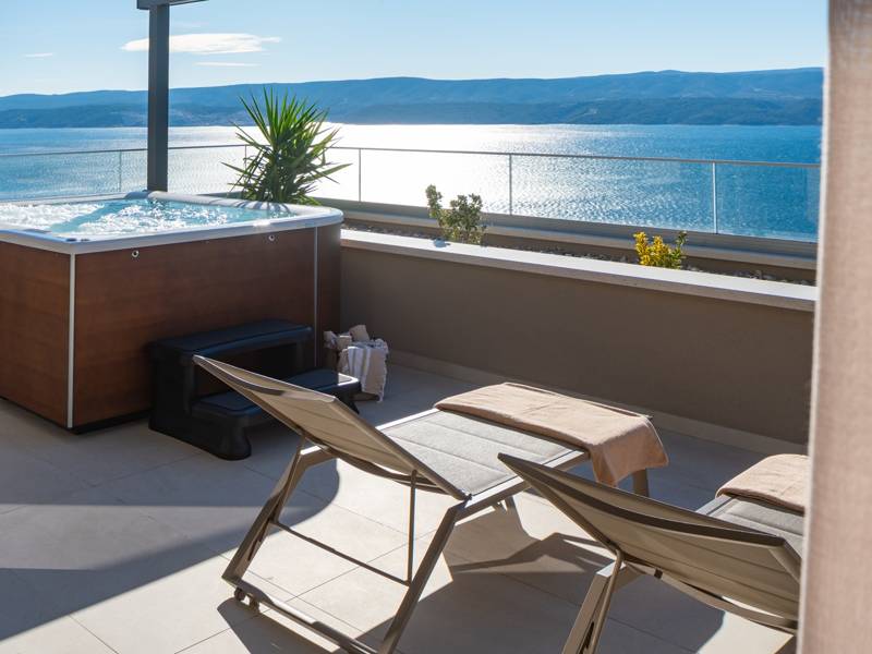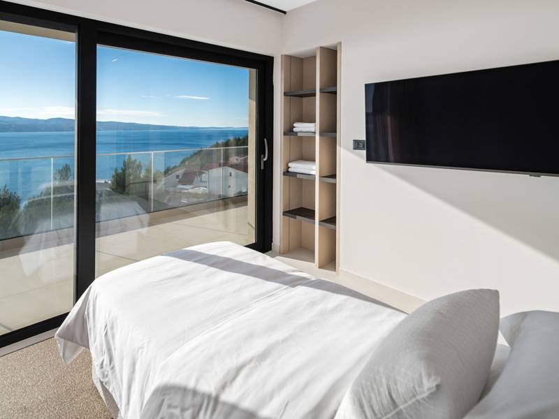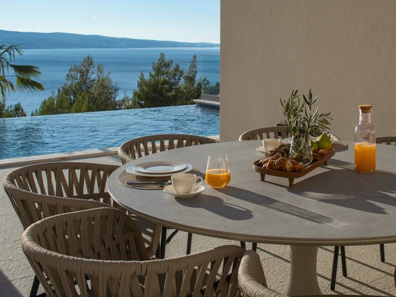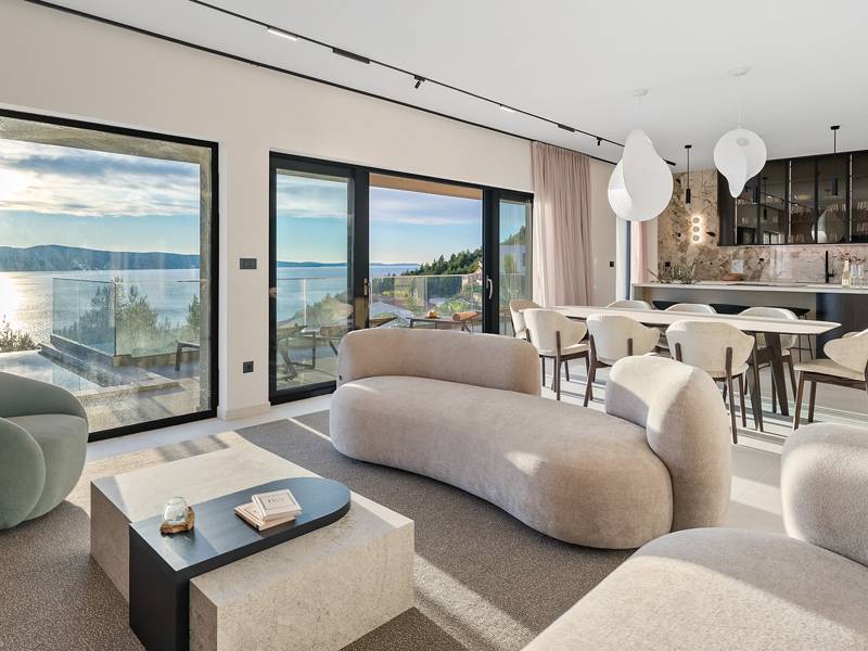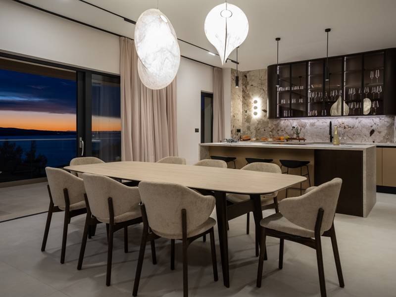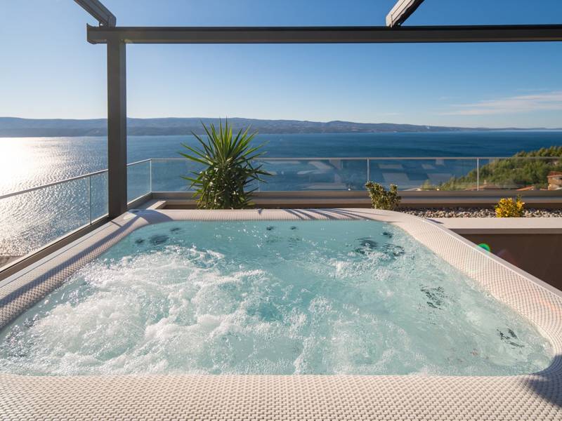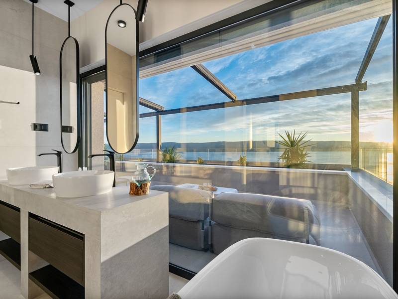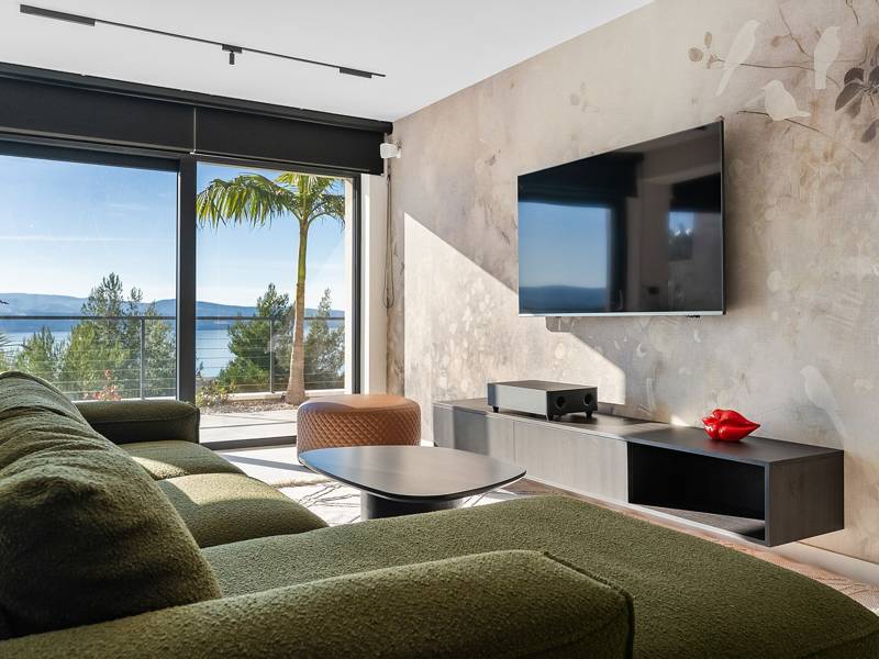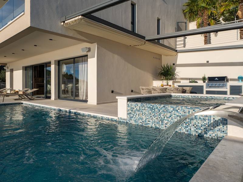 Experience unparalleled comfort, private amenities, and breathtaking Dalmatian coast vistas in this stunning luxury retreatDiscover the stunning and truly luxurious 5-bedroom Villa Million Dreams, which offers a heated infinity pool of 40 sqm with an attached hydromassage area, a Jacuzzi (Whirlpool) on the upper terrace, a fully equipped gym, Finnish sauna, billiard table, and high-end furnishings. This villa boasts spectacular sea views from every room. It is furnished exactly as the name suggests—exceptionally organised rooms, very comfortable beds, top-quality furnishings, and equipped with all modern amenities for a very comfortable stay, including free WiFi, full air conditioning, and a surround sound system.The villa is organised over four levels, with 500 sqm of interior space perched on a slope, providing breathtaking sea views from every room. It is a private, fenced property covering 650 sqm. - From the main parking area, the main entrance leads into the villa, where on the top level, you find the master bedroom, No.1, with a terrace that features a hot tub (whirlpool), two deck chairs, a lounge corner, and spectacular sea views. The master bedroom itself is 30 sqm and includes a king-size bed (180cm x 200cm), a TV, air conditioning, and a glass sliding door opening onto the jacuzzi terrace. The en-suite bathroom features a freestanding bathtub, a shower, double sinks, and a toilet. The terrace can be shaded for privacy and comfort.- One level below the parking area are four additional bedrooms, each with en-suite bathrooms and sea views. Bedroom No.2 is 21 sqm, with a queen-size bed (160cm x 200cm), TV, A/C, and a terrace overlooking the sea. Bedroom No.3 is 19 sqm, with two single beds (90cm x 200cm) that can be connected into a king-size, a TV, A/C, and a sea-view terrace. Bedroom No.4 measures 20 sqm, with a queen-size bed (160cm x 200cm), TV, A/C, and en-suite shower, along with sea views. Bedroom No.5 is 24 sqm, with a king-size bed (180cm x 200cm), TV, A/C, en-suite shower, and sea views.- The indoor living and dining area, spanning 65 sqm at pool level, features a fully equipped kitchen with all necessary appliances, including an ice maker, a large freezer, fridge, washing machine, DeLonghi espresso machine, microwave, toaster, kettle, and more. There is a kitchen island and a stylish dining table. The living room is furnished with comfortable sofas, a TV with satellite channels, and large floor-to-ceiling glass sliding doors that connect to the outdoor spaces. A separate guest toilet is also available.- An indoor staircase leads down to the spa and fun zone, which covers 77 sqm and is accessible via both indoor and outdoor staircases. This area includes a kitchenette with a small fridge, freezer, dishwasher, sink, glasses, and dishes, as well as a kitchen island. The indoor entertainment zone features a billiard table, a cosy sofa with a TV, and a gym area equipped with a multifunctional machine, exercise bike, weights, Pilates ball, and yoga mats. Wellness amenities include a Finnish sauna with a walk-in shower and a separate toilet. There is also a laundry room with a washing machine, dryer, ironing board, and iron.- The outdoor area offers a private, heated infinity pool measuring 8m x 4m, with a healthy electrolysed filtration system, a counter-current swimming program, a waterfall, and an attached hydromassage area. The pool is located on the third level, just below the living and kitchen spaces, and is surrounded by a sun deck with eight deck chairs and palm trees, complemented by an outdoor shower. The outdoor dining area, covered for shade, features a gas barbecue and seats ten people, all with spectacular sea views.For added security, the villa has video monitoring at the entrance and parking for up to six cars—two in the garage and four outside. Enhance your stay with personalised services offered through Feriehome, including grocery delivery, private chefs for culinary experiences, relaxing in-villa massages from professional masseuses, sailing adventures with a skipper along the Adriatic coast, and guided boat tours to explore the beautiful islands of Middle Dalmatia.At Villa Million Dreams, every detail has been curated to ensure an unforgettable escape where luxury meets comfort amidst magnificent views. Your dream vacation starts here. Welcome to Villa Million Dreams!