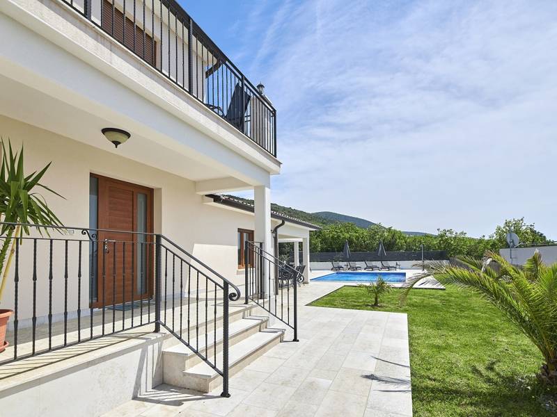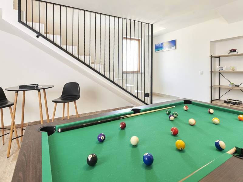 Share wonderful holiday moments with your nearest and dearest in the villa Vanda in a quiet area near Labin, Istria! An excellent choice for a large family or a group of up to 8 people, the villa provides a great place to relax with the full comforts of a contemporary home. The air-conditioned villa has three levels and features 4 bedrooms and 4 bathrooms with showers. The bedroom on the top floor has a balcony with a spectacular view of the landscape and the sea, while the one on the bottom floor is next to the playroom with a pool table. The remaining two bedrooms are located on the ground floor, which also includes a modern kitchen, dining room, and a cozy living room, all with direct access to the outdoor area. The private garden is dominated by a swimming pool surrounded by a tiled sundeck, where you can soak in the sun and relax on the loungers. There is also an outdoor grill at your disposal, which you can use to prepare delicious meals, then share them with your family and friends out in the open. Villa Vanda is set in beautiful surroundings in a hamlet called Diminići, not far from Labin in eastern Istria. The nearest beach is just a couple of kilometers away. For arrivals by air, fly to Pula Airport located only 44 km from the villa. Entering Croatia from Slovenia at the Rupa border crossing, it takes a bit more than an hour to reach your destination (80 km).