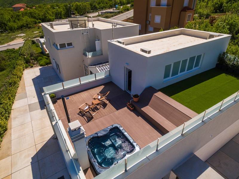 On its own large estate (1100m2), Villa Wisdom has its own large swimming pool, (30m2 ), that is set within the peaceful countryside, nestled between quiet idyllic green hills which offer a chance to relax and connect with nature. The villa itself has a two wings separated with a summer kitchen, each wing is completely independent, fully air conditioned, completely equipped with all amenities you might need during your holiday, and can accommodate 11 people. The summer kitchen is ideal for BBQ dinners Al fresco and large family gatherings. The ground floor of the right wing of the villa has a bathroom, a kitchen dining living area with direct access to the terrace by the pool furnished with lounge furniture. On the first floor there are 2 double bedrooms, each one with balcony and one bedroom for 3 persons. The ground floor in the left wing has a kitchen, living area with double sofa bed, one bathroom and one double en suite bedroom, ideal for disabled people. There is also a little gym and outdoor basketball playground. On the first floor there is a bedroom with two single beds, and a playroom with amusement games ( PlayStation, table football, darts ). From the play room you have access to the two terraces, one with wooden floor and jacuzzi and one that is ideal for sunbathing and enjoying sunset views and idyllic green hills. Each space on the property is positioned to share a unique view of the pool and nature sights. There is a large parking space with a capacity for over 8 sites.Object ID ctdg273 4