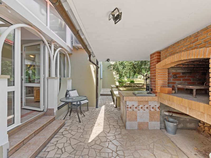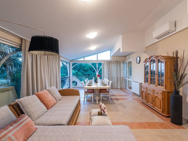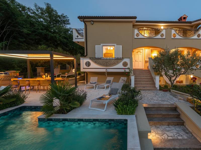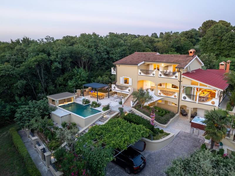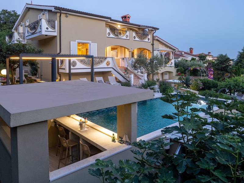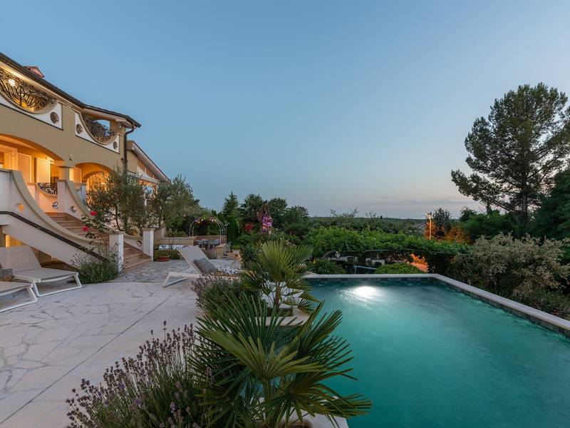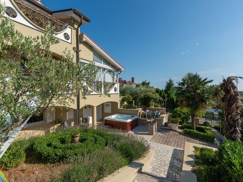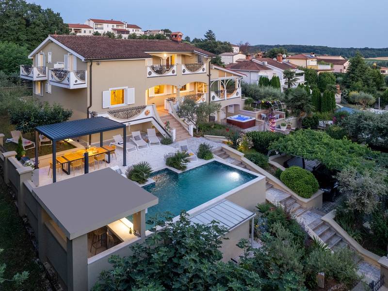 Welcome to our beautiful holiday home located in picturesque Fuškulin, Istria. This unique villa stands out for its beautifully landscaped Mediterranean garden, which is abundant with diverse plants and creates the atmosphere of an arboretum. The garden surrounds the pool and the entire environment of the house, providing peace and privacy. Villa Santa Sofia has five spacious bedrooms, each with its own balcony, giving guests a private corner to relax. Two large living rooms offer enough space for shared moments and socializing, while the closed terrace offers a beautiful view of the sea. For added luxury, there is also a large roof terrace with a panoramic sea view, ideal for sunbathing or evening cocktails.The yard of the house is completely fenced, ensuring safety and privacy for all guests. This villa is the perfect place for families or groups of friends looking for a relaxing holiday in the heart of Istria, with an emphasis on natural beauty and luxury. Book your stay and enjoy the charms of the Mediterranean garden and the beautiful view of the sea. Beaches are 5 km away, shops 1 km, restaurants 1 km, and the city of Poreč 8 km. Book your stay in this wonderful house and experience an unforgettable vacation in the heart of Istria.