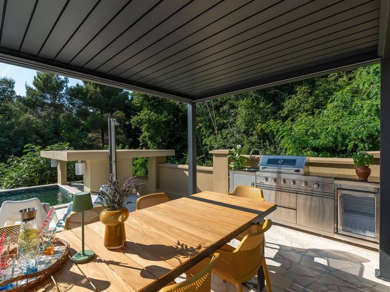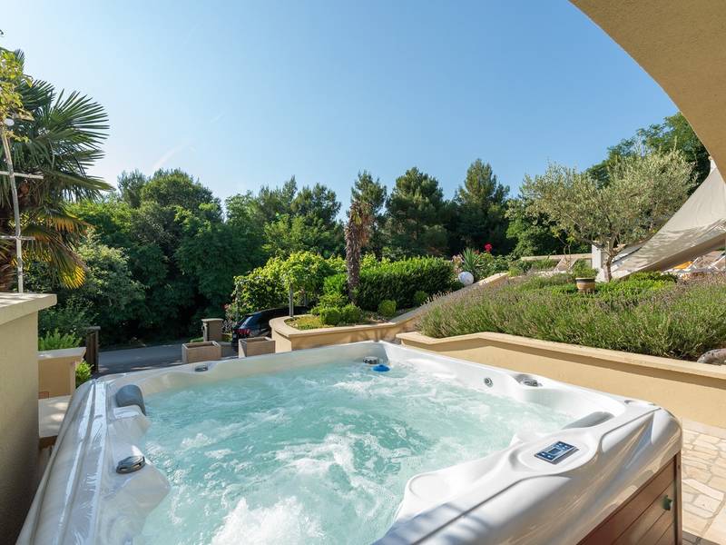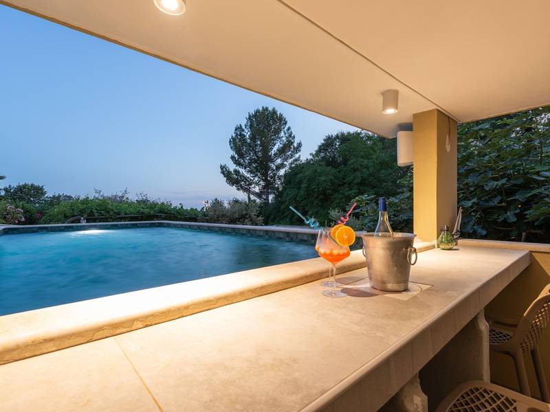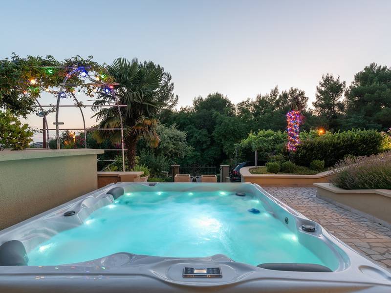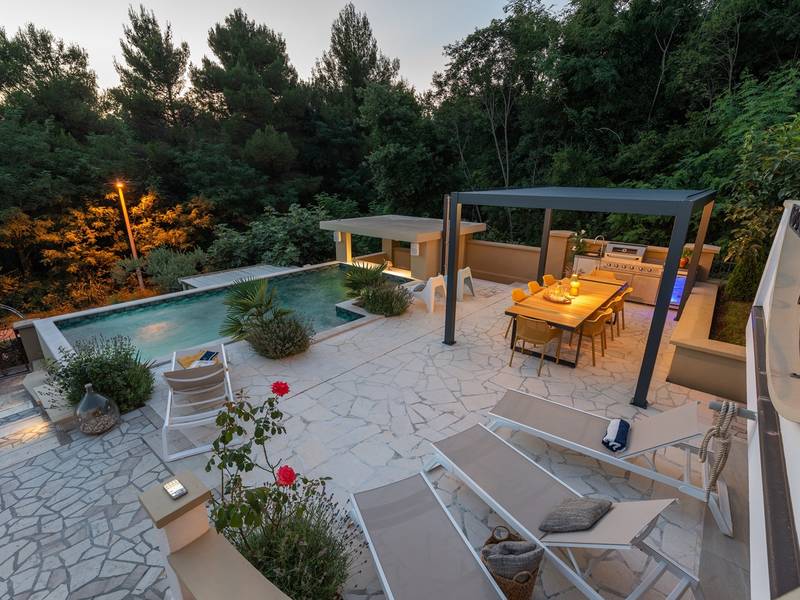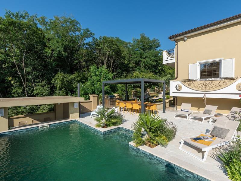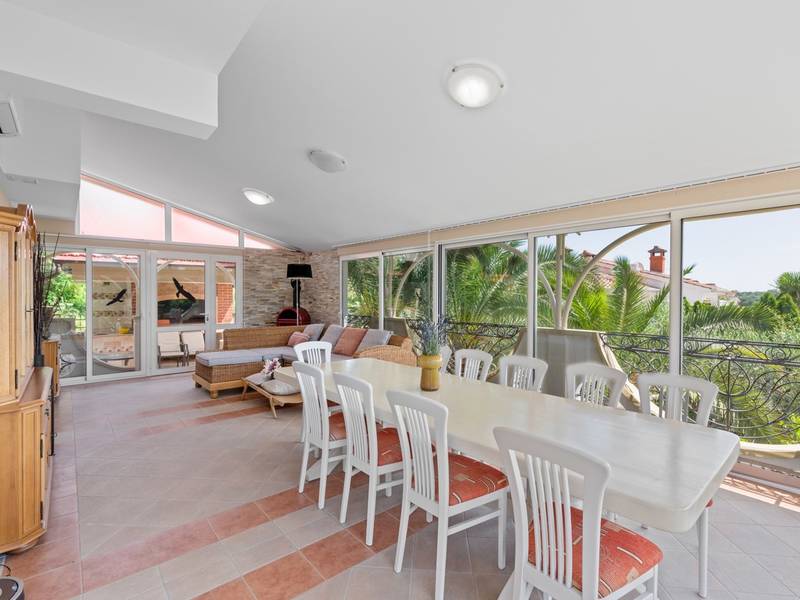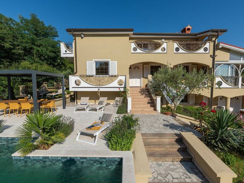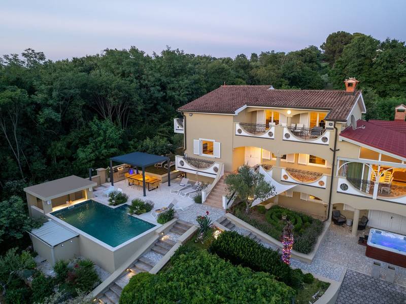Welcome to our beautiful holiday home located in picturesque Fuškulin, Istria. This unique villa stands out for its beautifully landscaped Mediterranean garden, which is abundant with diverse plants and creates the atmosphere of an arboretum. The garden surrounds the pool and the entire environment of the house, providing peace and privacy. Villa Santa Sofia has five spacious bedrooms, each with its own balcony, giving guests a private corner to relax. Two large living rooms offer enough space for shared moments and socializing, while the closed terrace offers a beautiful view of the sea. For added luxury, there is also a large roof terrace with a panoramic sea view, ideal for sunbathing or evening cocktails.The yard of the house is completely fenced, ensuring safety and privacy for all guests. This villa is the perfect place for families or groups of friends looking for a relaxing holiday in the heart of Istria, with an emphasis on natural beauty and luxury. Book your stay and enjoy the charms of the Mediterranean garden and the beautiful view of the sea. Beaches are 5 km away, shops 1 km, restaurants 1 km, and the city of Poreč 8 km. Book your stay in this wonderful house and experience an unforgettable vacation in the heart of Istria.