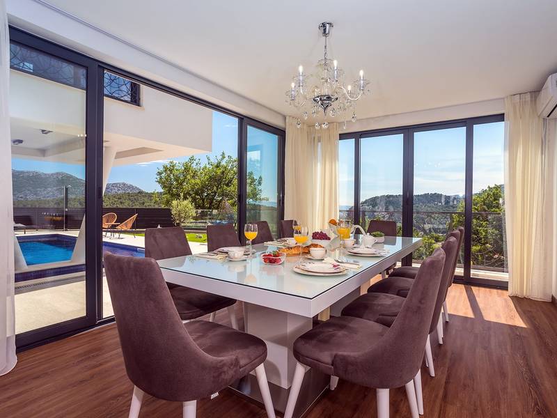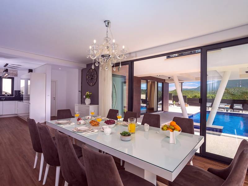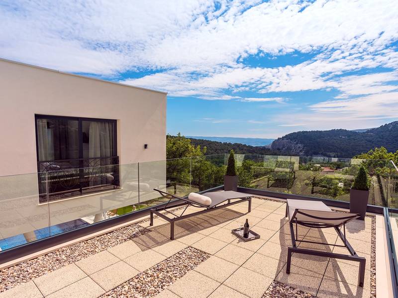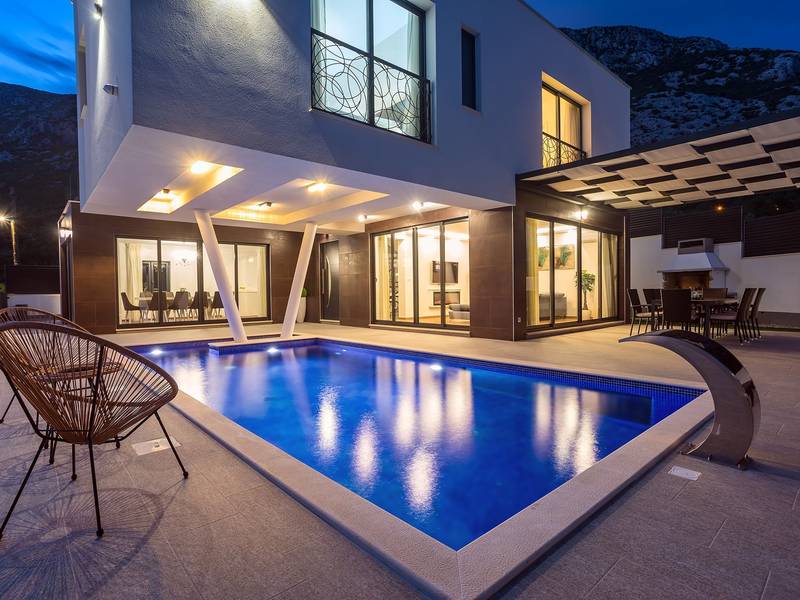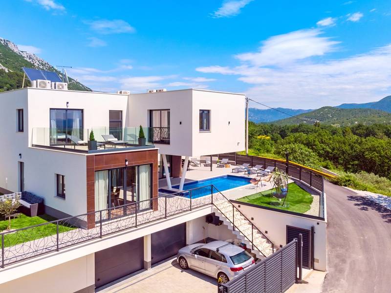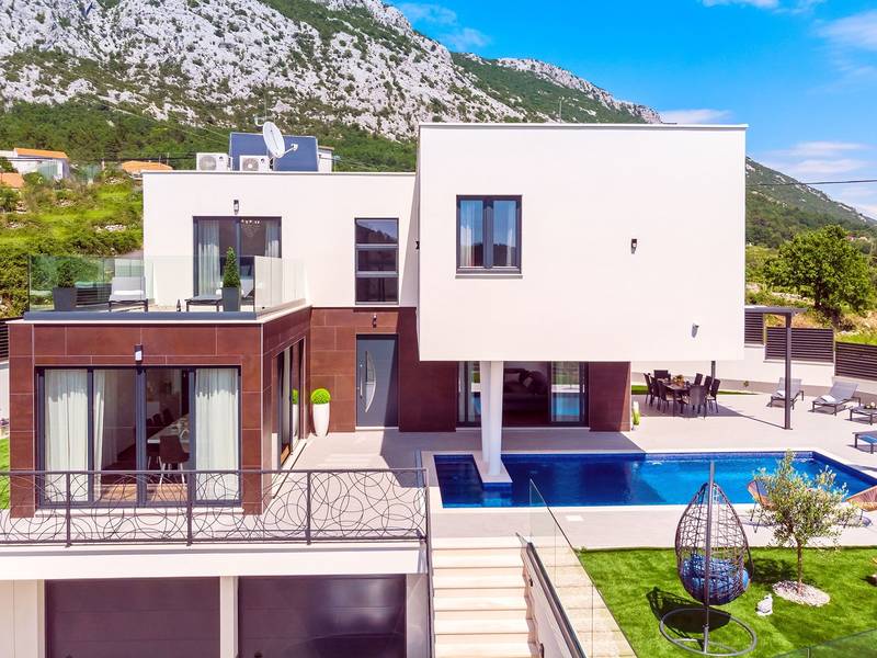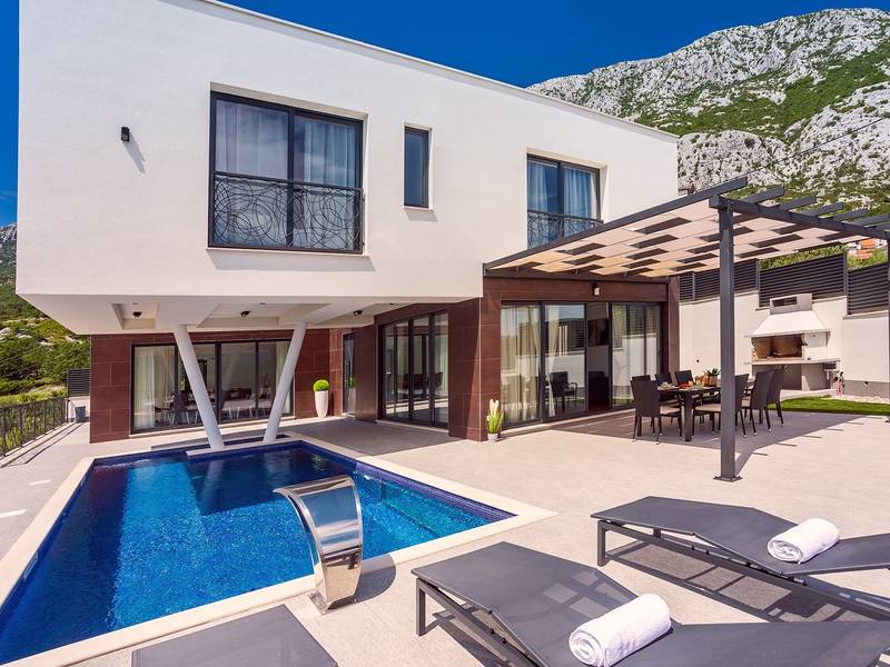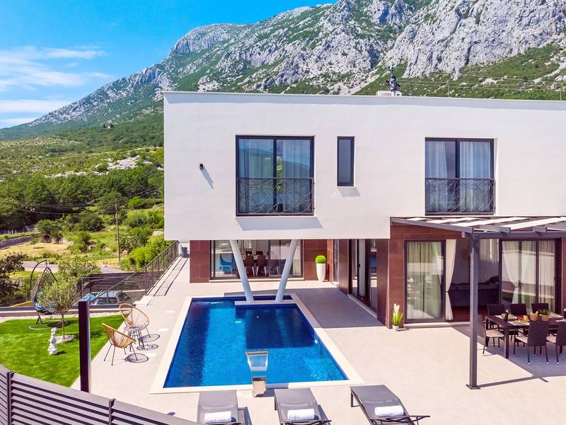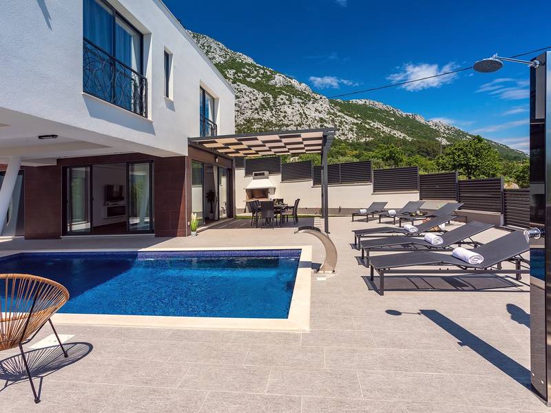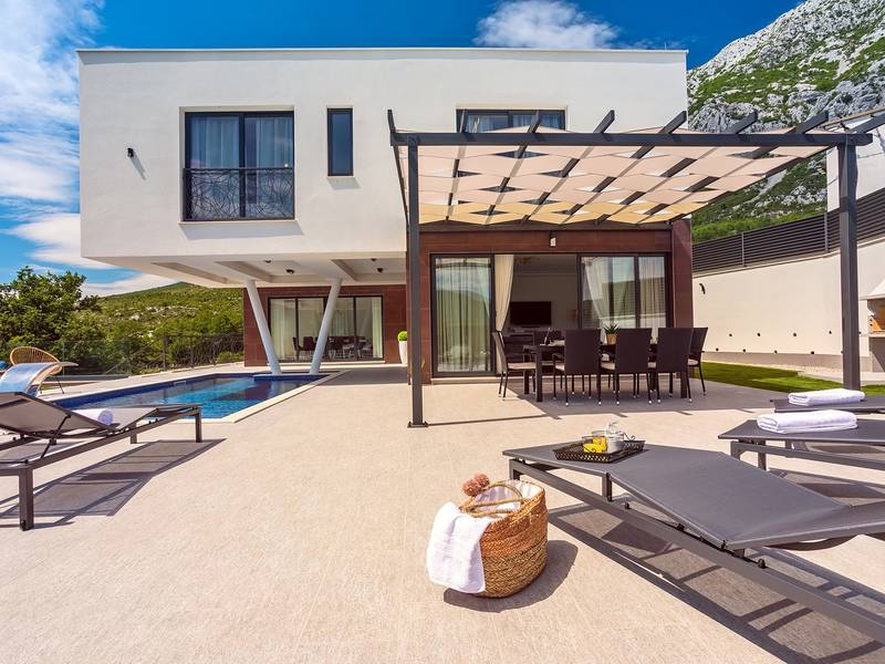 Villa Bruna is a newly built and very modern property that offers comfortable accommodation for 6+2 people. Furnished with high-quality materials, fully airconditioned with free WiFi, and equipped with all the modern guest needs. It offers a private, heated 8m Villa Bruna is located in the small village of Gata, in a very unspoiled and quiet area, only 6km to the sandy beach and town Omiš, 250 m to a minimarket, and 13km to a highway. The view is open and you can see the surroundings with typical Mediterranean plants and a mountain view.The villa has 260 sqm and is settled on the 750 sqm property that is fully fenced and has 2 garages and 2 outdoor parking places.* The outdoor offers a private and heated Swimming pool 8m x 4m, 8 deck chairs, an outdoor shower, an outdoor dining area with the traditional barbecue, a lounge corner next to it. The outdoor area is fenced and not overlooked, and you can only hear the sound of birds and crickets.* The ground floor is fully air-conditioned and consists of a fully equipped kitchen with all the amenities and appliances you need for a comfortable stay and family dining. A dining table for 8 with a direct approach to the pool area and a lounge corner on the other side. There is a living room with a flat-screen TV and direct approach to the pool and outdoor dining area. A separate toilet.* The basement offers a media room with a flat-screen TV, A/C, PS4, billiard table, Bluetooth speakers, a multifunctional machine, exercise bike, a glass wall, and view into the pool. On the other side are a Finnish sauna, a Bathroom No1 with a shower, a separate toilet and a laundry with washing machine and a dryer.* The first floor offers 3 bedrooms. Bedroom No1 with king-size bed 180*200cm, TV, A/C, a walk-in wardrobe, and a terrace with outdoor furniture. Bedroom No2 with king-size bed 180*200 cm, TV, A/C, walk-in wardrobe. Bedroom No3 with king-size bed 180 * 200cm, TV, A/C a walk-in wardrobe. There is also a family Bathroom No2 with a bathtub and a shower, and a family Bathroom No3 with a shower.* Extra services (not-included) recommended by our agency Feriehome: - You can order a grocery delivery from the comfort of your sofa, delivered in a villa at the agreed time; - Enjoy a culinary experience with an in-villa private chef that can prepare everything, from a romantic dinner to a family-friendly dinner; - You can have an in-villa massage with our professional masseuse that can show their therapeutic skills; - Get a feel for the Adriatic and some sailing experience with a sailing boat (+skipper); - Take a boat tour to explore the middle Dalmatian coast and islands...for more information, we are at your disposal and will gladly help.