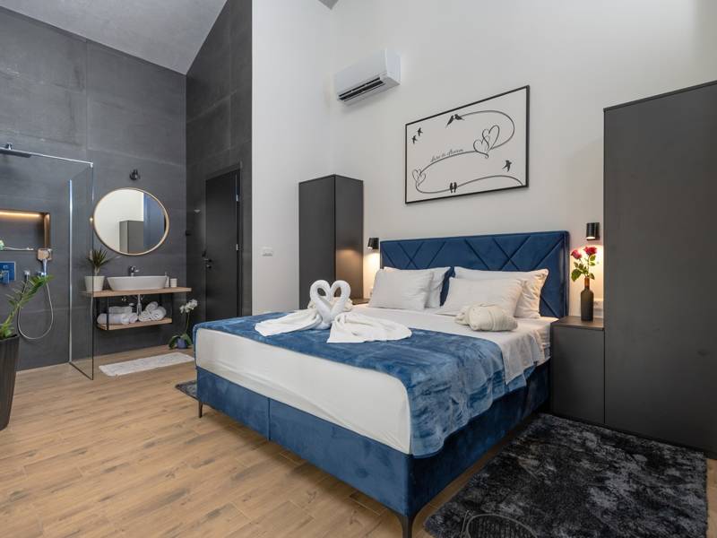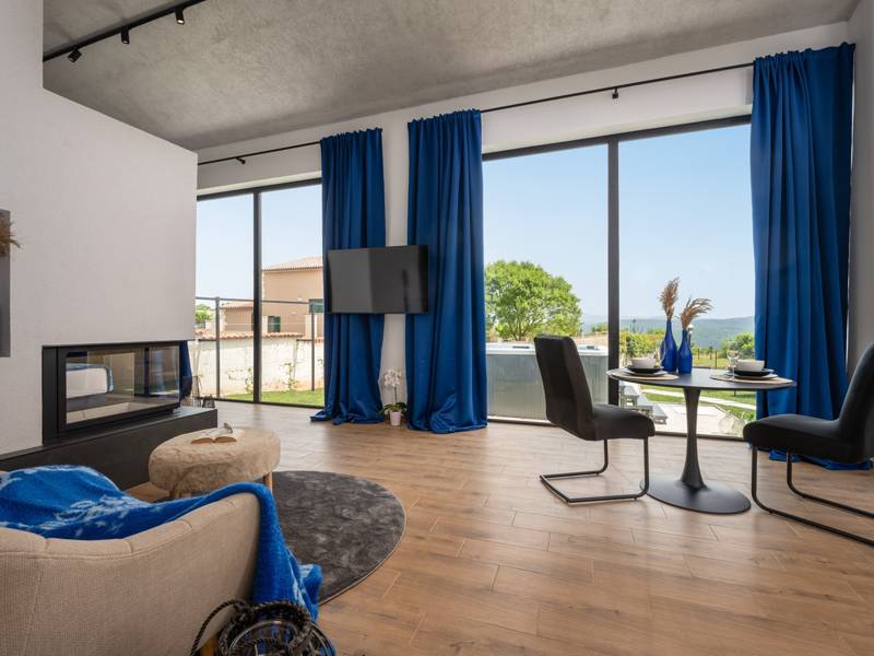 Villa Radola Relaxia is a luxurious and intimate retreat, perfect for couples seeking a peaceful and relaxing escape. Located in a serene setting with stunning views of the surrounding landscape, this modern villa offers the perfect blend of elegance, comfort, and tranquility. Designed with relaxation in mind, it features a private jacuzzi pool with counter-current swimming, allowing guests to unwind in warm, soothing water or stay active at their own pace. The villa’s stylish interior is thoughtfully designed, combining contemporary decor with high-end amenities to ensure a comfortable stay. The spacious and tastefully furnished bedroom creates a cozy and romantic atmosphere, providing the ultimate space for rest and relaxation. Large glass doors allow natural light to flood the villa, seamlessly connecting the indoor and outdoor spaces. Surrounded by unspoiled nature, Villa Radola Relaxia offers an exclusive escape from everyday stress, where guests can enjoy peace, privacy, and total rejuvenation.