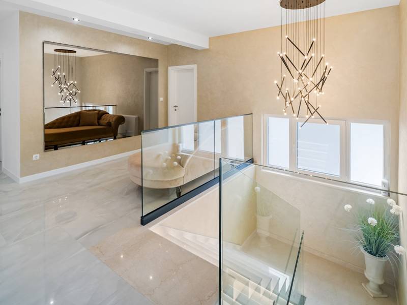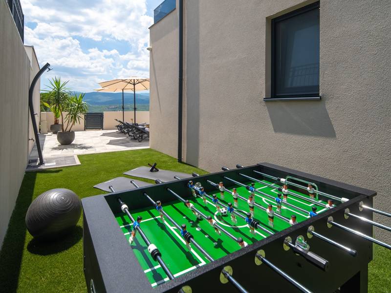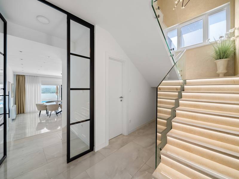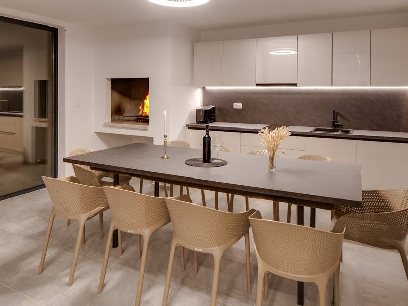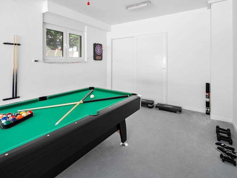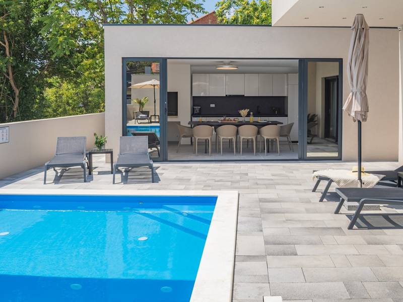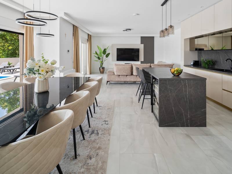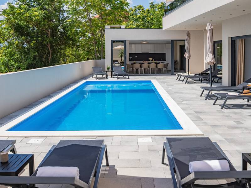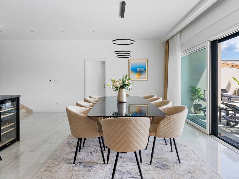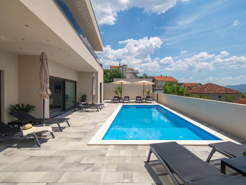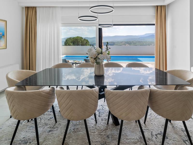 Welcome to Villa Bellezza, an exquisite 5-bedroom haven located in the scenic town of Imotski, where luxury meets comfort. Nestled within a private 500 sqm plot, this stunning villa boasts a high-end furnished and fully air-conditioned interior spanning 300 sqm, providing the perfect blend of elegance and relaxation. Just a short stroll (500m to 1km) from local shops, bars, and restaurants, as well as the breathtaking Blue and Red Lakes (1km), Villa Bellezza is ideally situated for both convenience and leisure.- Outdoor OasisStep outside into your personal paradise. The outdoor area features a private swimming pool measuring 10m x 4m, inviting you for refreshing dips under the sun. Surrounding the pool is a spacious sun deck equipped with 10 stylish deck chairs, perfect for soaking up the sun or enjoying a good book. The covered outdoor dining area accommodates up to 10 guests, complete with a TV and a barbecue grill (wood-charcoal), making it an ideal spot for al fresco dining and entertaining.For families with children, Villa Bellezza offers a delightful play corner featuring a slide and swing, ensuring your little ones have endless fun in a safe environment. An outdoor shower and a separate toilet add to the convenience of outdoor living.-Indoors: A Luxurious EscapeUpon entering the villa, the ground floor unveils a sprawling 65 sqm living and dining area designed for relaxation and social gatherings. The fully equipped kitchen features a luxurious kitchen island, making meal preparation an enjoyable experience. Comfortable sofas are arranged around a flat-screen TV, while large glass doors lead directly to the pool area, blending indoor and outdoor living seamlessly. For your convenience, a fully equipped laundry room is available, complete with a washing machine, dryer, and ironing amenities. Entertainment continues in the villa's fun zone, which includes a pool table, darts, and a multifunctional exercise machine, along with a separate toilet for ease of use.The ground floor also features Bedroom No1 furnished with a sumptuous king-size bed (180cm x 200cm), an en-suite bathroom with a modern shower, air conditioning, and a TV. - Ascending to the first floor, you'll find four additional bedrooms, each featuring a king-size bed (180cm x 200cm), air conditioning, and a TV. Each bedroom includes an en-suite bathroom with a shower — one of which features a luxurious bathtub for relaxation. Three of the bedrooms open onto spacious south-facing balconies, where you can enjoy picturesque views and outdoor furnishings, perfect for savoring the warm Mediterranean evenings.- Amenities and SecurityVilla Bellezza accommodates up to 10 guests, ensuring ample space for families or groups. The property includes a secured parking lot with space for up to four cars, as well as a video surveillance system at the entrance, providing peace of mind during your stay. - Exploring the SurroundingsVilla Bellezza is strategically located for exploration. The nearest highway exit/entrance is Zagvozd, just 15 km away, making access to other destinations convenient. A short 1-hour drive will take you to the historic city of Split, home to the renowned Diocletian Palace. For nature enthusiasts, Krka National Park with its stunning waterfalls is just 90 minutes away, while the iconic city of Dubrovnik awaits around 2 hours and 20 minutes' drive.For a day full of adventure, consider visiting the "Biokovo" Nature Park located above Makarska, where breathtaking views await you. The Skywalk on Biokovo Mountain, perched at 1228 meters above sea level, features a cantilevered structure that provides an exhilarating bird's-eye view of the Adriatic Sea and surrounding islands.You’ll also find opportunities to explore two remarkable sites in Bosnia and Herzegovina: the spiritual sanctuary of Međugorje and the charming old streets of Mostar, famous for its iconic bridge, both easily accessible within a 1-1.5 hour drive.Villa Bellezza is more than just a vacation rental; it’s an exclusive escape that offers luxury, comfort, and the ultimate in relaxation and recreation. With its prime location, stunning amenities, and thoughtful design, this villa promises an unforgettable experience, whether you're basking by the pool, exploring the natural beauty nearby, or enjoying quality time with loved ones. Come and discover the enchanting world of Villa Bellezza in Imotski—your luxury retreat awaits!