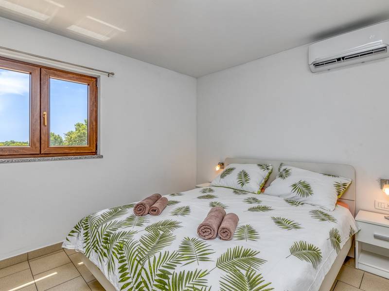 A beautiful, cute tiny vacation home with two bedrooms and a private pool in a secluded location, near Vodnjan.The house is located in an olive grove in a location between Vodnjan and Svetvinčent. It has a fully equipped kitchen, living room, two bedrooms, and two bathrooms. The house is fully air-conditioned. The beautiful covered terrace with a view of the pool and the olive grove will delight visitors. Pets are welcome with an extra charge on-site. Parking is provided, as are bed linen and towels. We recommend it to families or couples who want to spend their vacation in seclusion, without neighbors. The nearest shop is in Juršići, and the nearest beach is 15 km away.