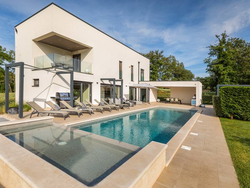 Welcome to our Villa Luce Verde, a luxurious retreat situated in the tranquil village of Kirmenjak, a haven of peace and tranquility yet only a short drive from the bustling tourist center of Poreč and its beaches, located 10 km away. This villa is perfect for those seeking both relaxation and easy access to vibrant town life. Villa Luce Verde is set on a spacious property of 950 sqm where guests can enjoy a beautifully landscaped garden complete with a large swimming pool, perfect for cooling off on sunny days. A covered terrace offers a dining area alongside an outdoor kitchen with a BBQ grill, ideal for enjoying meals in the fresh air and scenic surroundings.Spanning 174 sqm across two elegantly designed and air-conditioned floors, this villa provides both comfort and style. The ground floor is designed with an open plan that includes a fully equipped kitchen, spaciuos dining room, and living room. These areas are adorned with large windows that not only bring in natural light but also provide an exit to the pool terrace, integrating indoor comfort with outdoor leisure. On the same floor is wellness area with indor hot tub and sauna and one cozy bedroom with double bed and private bathroom.On the upper floor, you'll find three bedrooms; two are equipped with double beds, and one of these also provides access to a balcony. The third bedroom contains two single beds. Each bedroom includes its own en-suite bathroom and a TV.On the property is private parking available for up to five vehicles, wich includes an Electric Vehicle charging station enhancing convenience for guests who prefer to travel with electric vehicles.This villa is an excellent choice for families or groups seeking a blend of comfort, luxury, and proximity to tourist attractions while still enjoying the tranquility of a rural setting.