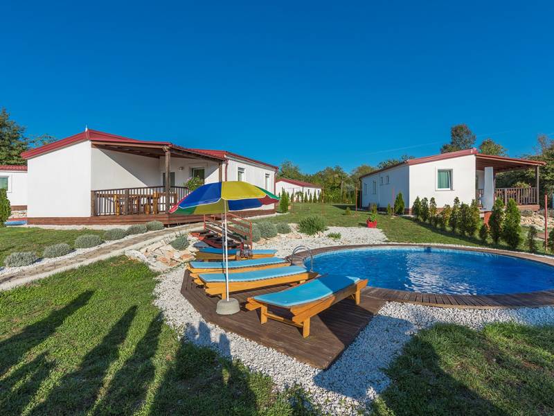 Holiday House Jelovci No.2 with private pool is one of nine holiday houses in Holiday Park Village Jelovci. The house consists of a spacious living room with an equipped kitchen and dining area, three bedrooms and two bathrooms with showers. With its three bedrooms , the house can accommodate up to 6 persons. Guests also have a private garden with a barbecue area and a private swimming pool ( 24m2) , as well as a private terrace with seating furniture at their disposal. All guests of the Village Park Jelovci can also use the shared childrens' playground with a kids' pool and other activities suitable for children. There is also a laundry room available to all guests, and a conference room suitable for different types of gatherings. Holiday House Jelovci No.2 is perfect for a family with children, who will surely enjoy everything Holiday Park Jelovci has to offer and make wonderful holiday memories here. Eco-friendly Park Village Jelovci uses renewable energy, therefore is the air-condition free to use 10 hours daily.