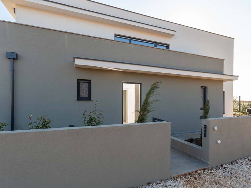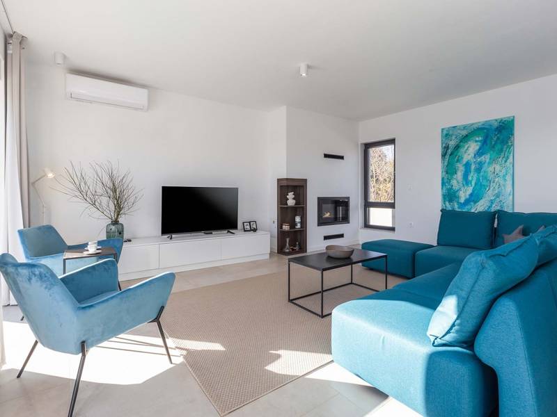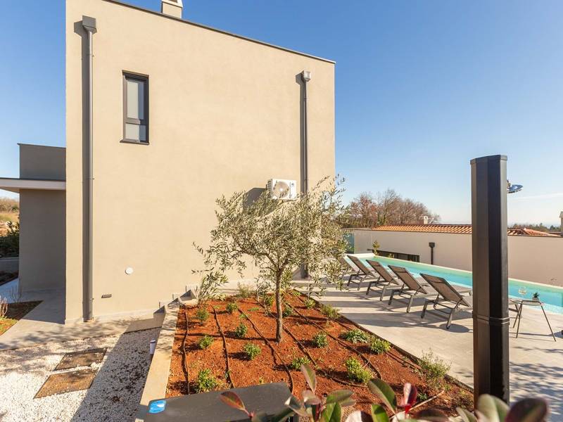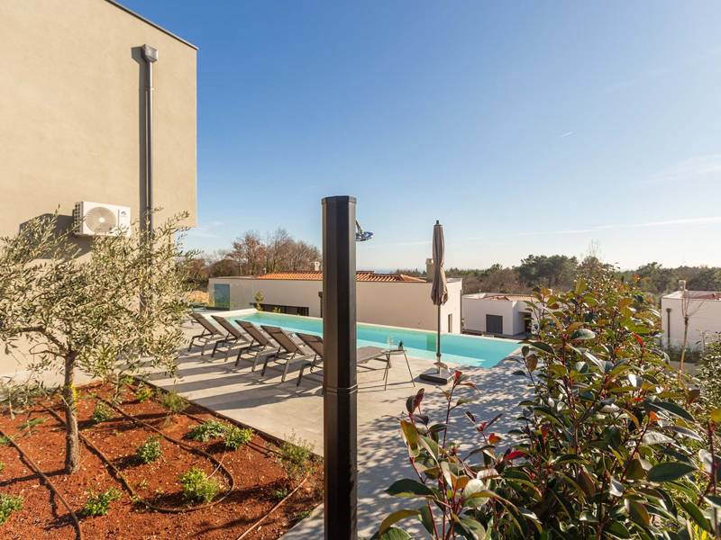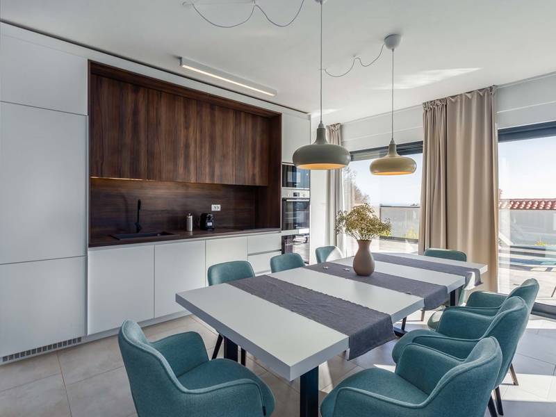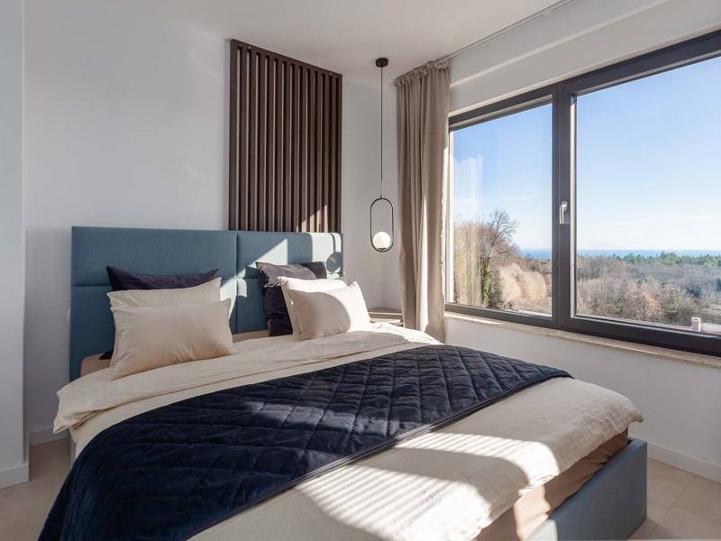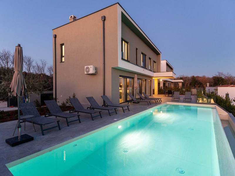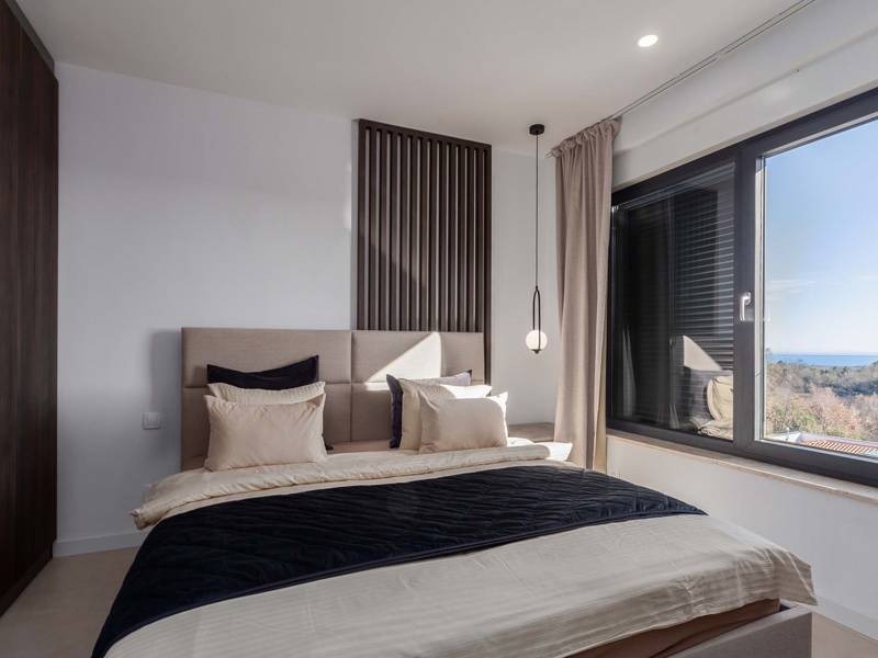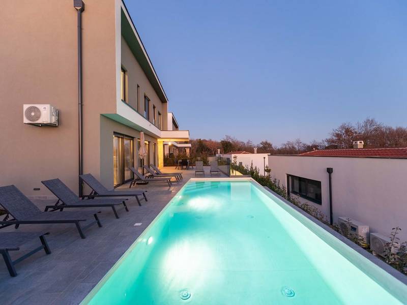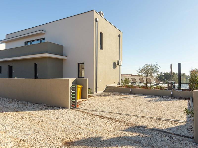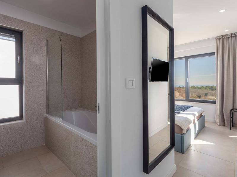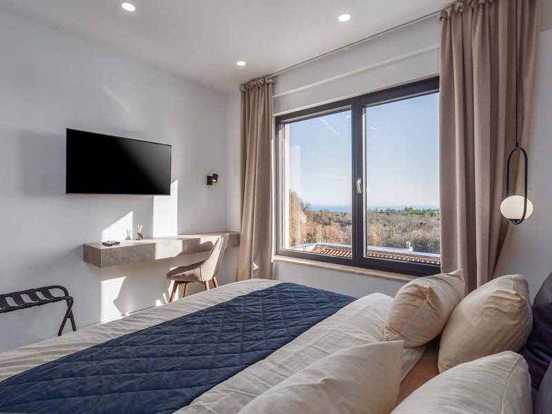 Villa Seastar is where relaxed living, design, and a sense of lightness come together. Located close to the sea, this modern villa is perfect for families and friends who want to enjoy Istria at their own pace. It features three bedrooms with double beds and one with a pull-out bed, comfortably accommodating up to eight guests. The spacious open-plan living area overlooks the infinity pool, the sea, and the island of Cres, creating a bright, connected atmosphere for long breakfasts, sunbathing, or evening relaxation at sunset.For guests who enjoy staying active, Villa Seastar provides exercise mats, several Pilates exercise balls of different sizes, resistance bands, and black rolls for stretching and relaxation. Guests can also take advantage of free bike rentals from a local partner in Krnica — ideal for exploring the area on two wheels.Everything here feels relaxed, modern, and effortless — a touch of luxury balanced with wellness and nature.The VillaSpacious and elegant, the villa spreads over two floors and is filled with natural light thanks to large glass walls facing the sea. The design combines clean lines, neutral tones, and natural materials, creating a soothing and comfortable atmosphere.On the ground floor, the open-plan living room, dining area, and fully equipped kitchen all connect directly to the terrace, providing a seamless transition between indoor and outdoor spaces. Every detail has been carefully selected to combine functionality and elegance, offering guests a true sense of relaxation.Bedrooms and LayoutThe villa offers four bedrooms, each with its own private bathroom.Three bedrooms feature double beds, while the fourth, located on the ground floor, includes an extendable single bed that can become a comfortable double bed.All rooms are air-conditioned, tastefully furnished, and filled with natural light. One bathroom is equipped with a bathtub, while the others feature modern walk-in showers.The refined design and the use of natural materials create a peaceful atmosphere, ideal for unwinding after a day by the sea.Outdoor AreaThe highlight of Villa SeaStar is the stunning infinity pool with sea view, perfectly positioned to overlook the horizon and the island of Cres. Around the pool, there is a spacious terrace with sun loungers, parasols, and an outdoor dining area – the perfect place for morning coffee, relaxation, or dinner under the stars.A barbecue area is also available, while the surrounding Mediterranean greenery ensures privacy and tranquility.Additional InformationThe villa provides Wi-Fi, private parking, air conditioning throughout, a washing machine, and a dishwasher.Guests can use the provided Pilates and fitness equipment, as well as enjoy free bicycles offered by a local partner in Krnica.Pool heating with a heat pump is available on request in April, May, September, and October – at an extra charge of 200.00 EUR per week, depending on weather conditions.The house is not suitable for youth groups.Pets are not allowed.Smoking is not permitted indoors.