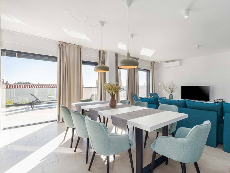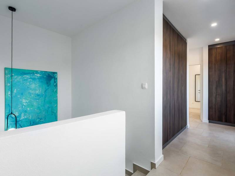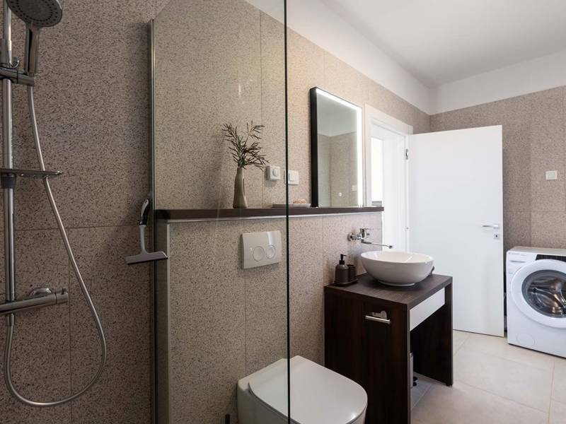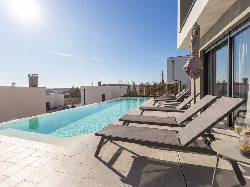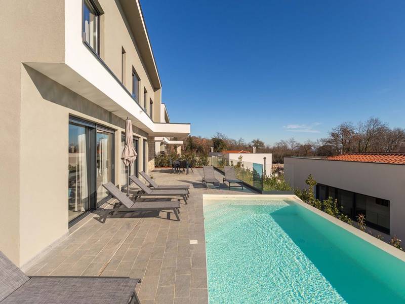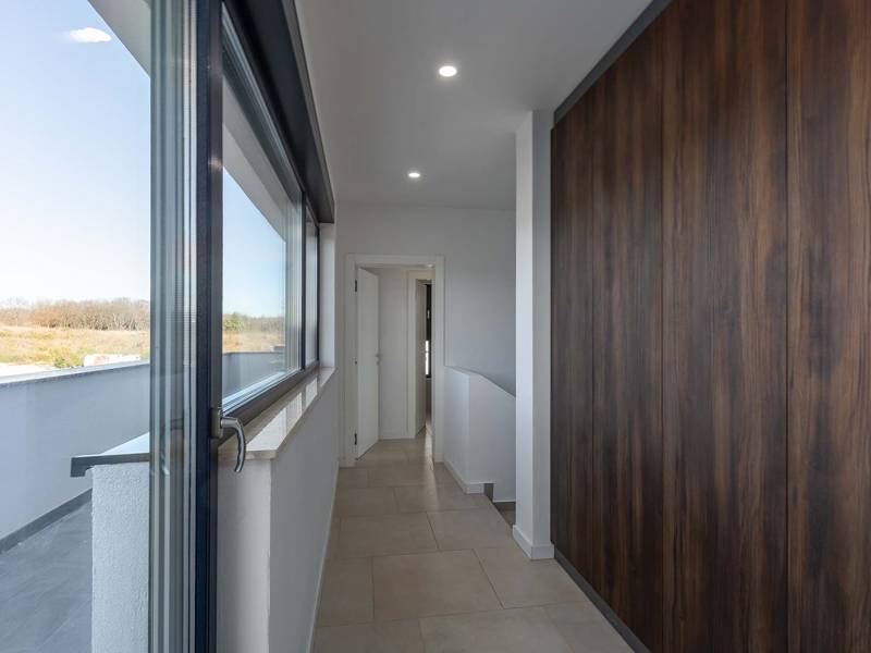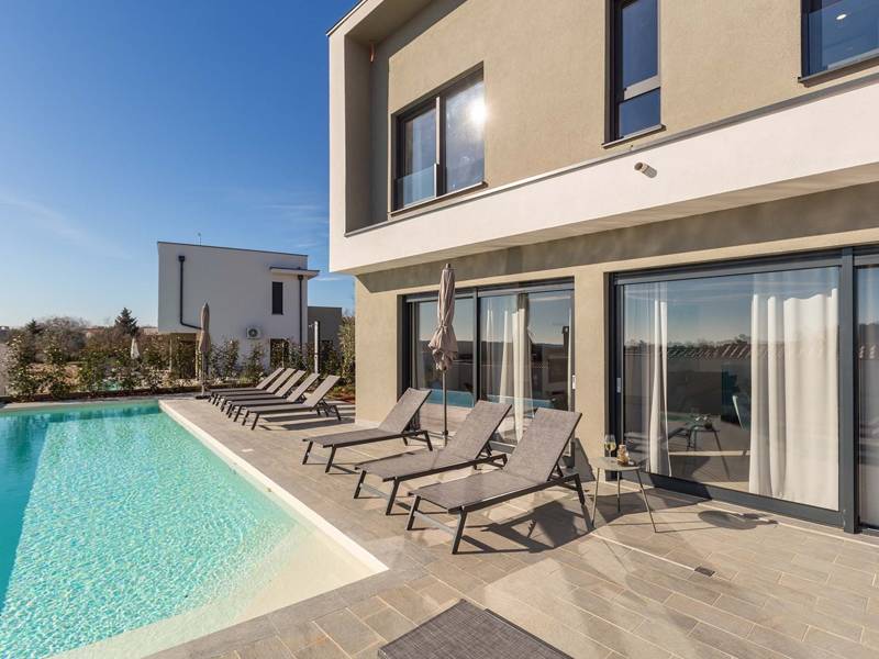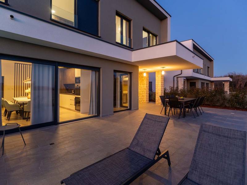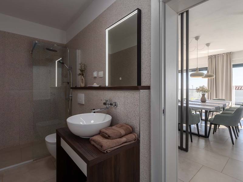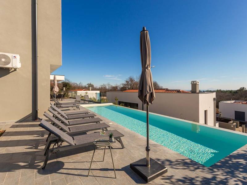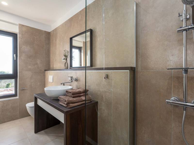 Villa Seastar is where relaxed living, design, and a sense of lightness come together. Located close to the sea, this modern villa is perfect for families and friends who want to enjoy Istria at their own pace. It features three bedrooms with double beds and one with a pull-out bed, comfortably accommodating up to eight guests. The spacious open-plan living area overlooks the infinity pool, the sea, and the island of Cres, creating a bright, connected atmosphere for long breakfasts, sunbathing, or evening relaxation at sunset.For guests who enjoy staying active, Villa Seastar provides exercise mats, several Pilates exercise balls of different sizes, resistance bands, and black rolls for stretching and relaxation. Guests can also take advantage of free bike rentals from a local partner in Krnica — ideal for exploring the area on two wheels.Everything here feels relaxed, modern, and effortless — a touch of luxury balanced with wellness and nature.The VillaSpacious and elegant, the villa spreads over two floors and is filled with natural light thanks to large glass walls facing the sea. The design combines clean lines, neutral tones, and natural materials, creating a soothing and comfortable atmosphere.On the ground floor, the open-plan living room, dining area, and fully equipped kitchen all connect directly to the terrace, providing a seamless transition between indoor and outdoor spaces. Every detail has been carefully selected to combine functionality and elegance, offering guests a true sense of relaxation.Bedrooms and LayoutThe villa offers four bedrooms, each with its own private bathroom.Three bedrooms feature double beds, while the fourth, located on the ground floor, includes an extendable single bed that can become a comfortable double bed.All rooms are air-conditioned, tastefully furnished, and filled with natural light. One bathroom is equipped with a bathtub, while the others feature modern walk-in showers.The refined design and the use of natural materials create a peaceful atmosphere, ideal for unwinding after a day by the sea.Outdoor AreaThe highlight of Villa SeaStar is the stunning infinity pool with sea view, perfectly positioned to overlook the horizon and the island of Cres. Around the pool, there is a spacious terrace with sun loungers, parasols, and an outdoor dining area – the perfect place for morning coffee, relaxation, or dinner under the stars.A barbecue area is also available, while the surrounding Mediterranean greenery ensures privacy and tranquility.Additional InformationThe villa provides Wi-Fi, private parking, air conditioning throughout, a washing machine, and a dishwasher.Guests can use the provided Pilates and fitness equipment, as well as enjoy free bicycles offered by a local partner in Krnica.Pool heating with a heat pump is available on request in April, May, September, and October – at an extra charge of 200.00 EUR per week, depending on weather conditions.The house is not suitable for youth groups.Pets are not allowed.Smoking is not permitted indoors.