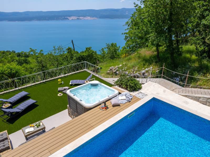 VILLA MARUNCELA - Max 11 people, 5 bedrooms, 4 bathrooms, gym, outdoor BBQ & dining, sea and island viewsVILLA MARUNCELA offers everything you need for a perfect vacation: 5 bedrooms, 4 bathrooms, and one toilet, kitchen, large dining room with wooden table and 12 chairs, living room, gym, large balcony, covered terrace with breath-taking sea view, uncovered terrace with large barbecue. Also, there is an open yard, 24m2 private swimming pool, Jacuzzi, table tennis, and parking for 4 cars, This two-floor house is newly renovated and modernized, and it can accommodate a max of 11 persons. On your use:GROUND FLOOR: 1st bedroom with double bed (160 x 200) with ensuite bathroom with bathtub, A/C; 2nd bedroom with 2 single beds (90 x 200) with ensuite bathroom with shower, A/C; gym room with A/C and 3 mountain bikes for use.FIRST FLOOR: living area with fully equipped kitchen, living room with fireplace and exit to a spacious balcony with sea views, A/C; toilet with washing machine; 3rd bedroom with double bed (180 x 190), A/C; 4th bedroom with double bed (180 x 190), A/C; 5th bedroom with 3 single beds and exit to terrace where is the outdoor dining area, A/C; two bathrooms with shower;OUTDOOR: Private 24 m2 swimming pool with sun deck and comfortable deck chairs; Jacuzzi, covered terrace with dining area and table for 12 people, outdoor traditional barbecue with outdoor dining area and table for extra 12 people; parking area for 4 cars.