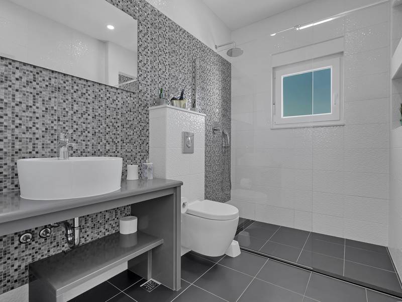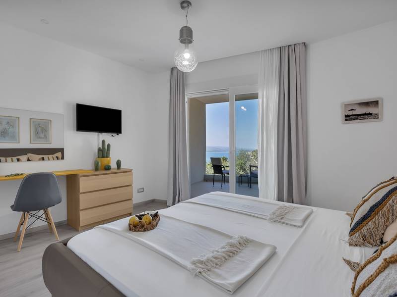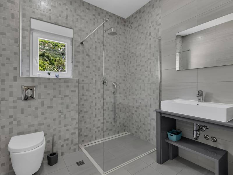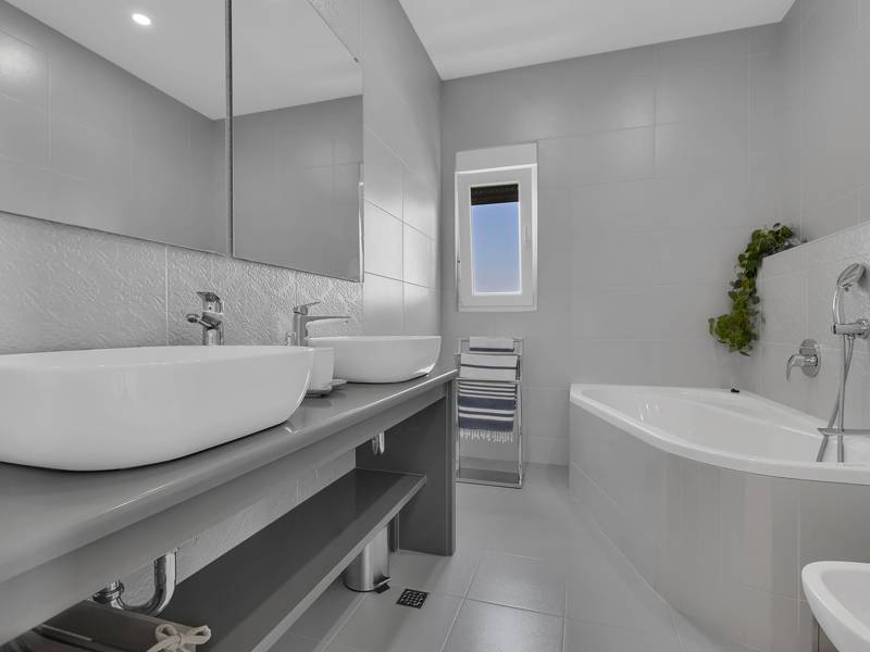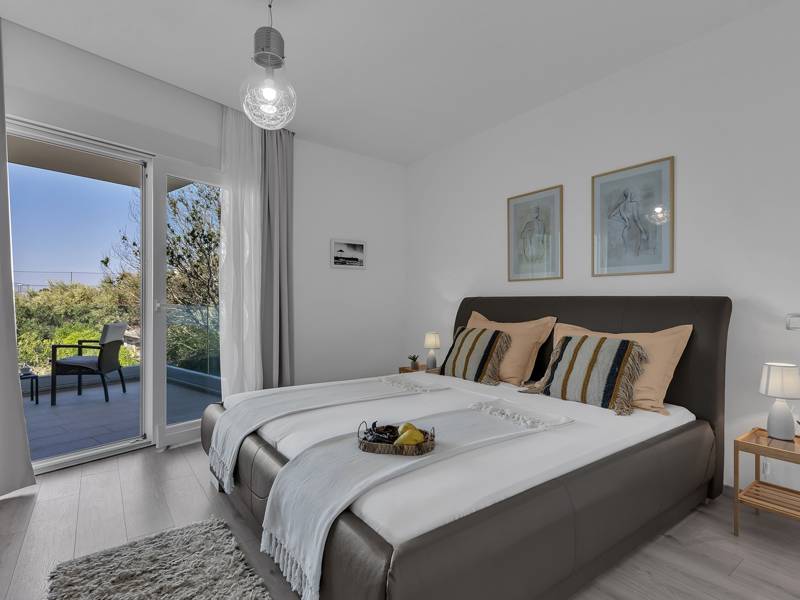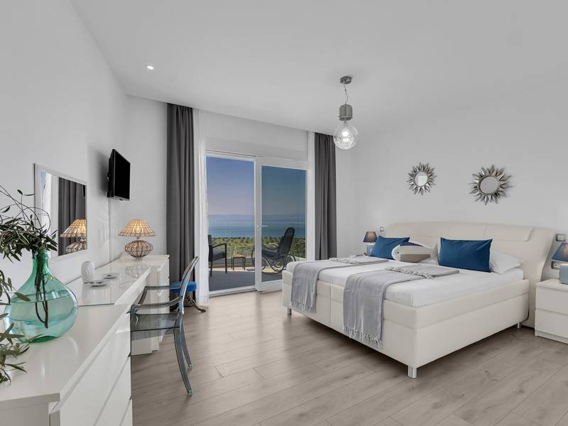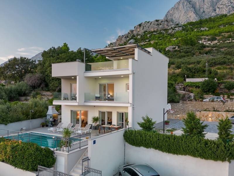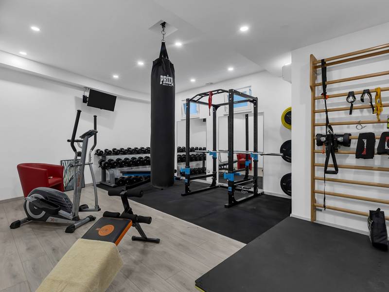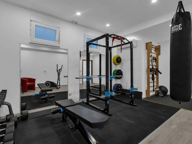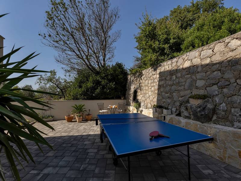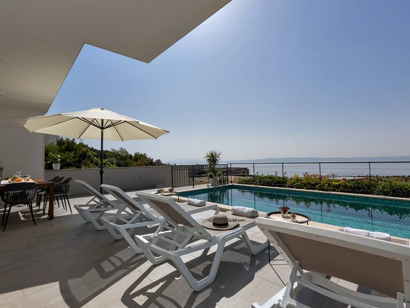 New modern house with private heated pool, surrounded by greenery and private basketball court, with beautiful sea view on south and mountain from the north, is ideal for family vacations. It has 4 floors. In the basement there is a fully equipped gym. On the ground floor there are a spacious living room, kitchen and dining room, as well as a bedroom with a sofa bed and a toilet. On the first floor there are 3 bedrooms with double bed and private bathrooms and balconies. On the second floor there is a sunbathing area of 100 m2, mini kitchen and bathroom.Guests can use the garden furniture, barbecue and outdoor shower.This villa disposes garage and additional entertainment facilities - children's corner, PlayStation, table tennis, social games. Next to the garage you can use private newly build basketball court.This villa is pet friendly, but in case you are traveling with more than one pet, please send us an inquiry first.Object ID: ctma246