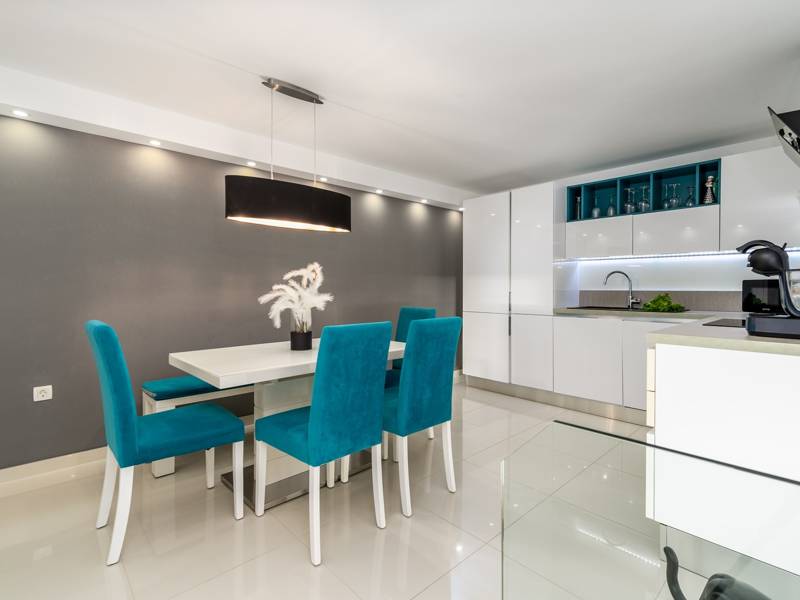 Seaview villa Lea is a high-quality furnished, modern, and comfortable accommodation that boasts 180 sqm of living space and can accommodate 9 people. It consists of two comfortable units on two floors (each 90 sqm) both with a fully equipped kitchen and living area, and both units are offered for one group. It is set on a 340 sqm fully fenced property from where you can admire the beautiful landscape and spend your best vacation ever in this stylish accommodation. Villa Lea offers all modern guest needs for a very comfortable stay, two fully equipped kitchens with all the appliances, each room with a TV, free Wi-Fi, fully air-conditioned, and a Playstation3 with many games for your youngest (or everyone that feels young). Located only 1 km from the beach, 700m from the Makarska center, and 700 m from restaurants and shops, it allows enjoying in quiet and friendly surroundings, still very close to various offers that the town Makarska provides. * The outdoor area offers a private heated 32 sqm swimming pool (6.8 x 4.7m) with a fully automated salt electrolysis system (Chlorine - Free) and amazing views on the Makarska riviera, a sun deck area with 6 deck chairs, an outdoor shower, a lounge corner for relaxing in the sunset views, a covered outdoor dining area with a barbecue, surrounded with olive trees. From the outdoor dining area, there is a direct approach to the living area. There is also a separate toilet. From the pool area, you are directly approaching the ground floor interior.* The ground floor (pool level) offers a spacious and modern living room with amazing pool and sea views, comfy sofas, a TV, A/C, and a fully equipped kitchen with all needed appliances like a microwave, a Kettle, an ice machine, a filter coffee machine together with a Dolce Gusto coffee maker, there is a dining area for 8. A family bathroom with a shower and a washing machine. Bedroom No1 with king-size bed 180 x 200 cm, a TV, A/C, and views on the sea and the pool area. Bedroom No2 with double bed 160 x 200 cm, en-suite bathroom with a shower, a TV, A/C, and view of the garden with olive trees. The outdoor and covered staircase takes you to the first-floor flat.* The first floor offers a stylish and comfortable living area with sea and pool views, a TV, A/C, a fully equipped kitchen with a dining area. Bedroom No3 with a double bed 160 x 200 cm, with en-suite bathroom with a shower, a TV, A/C. Bedroom No 4 with a queen bed 140 x 200 cm, TV, A/C, and sea and pool views. Bedroom No5 with a king-size bed 180 x 200cm, a TV, A/C, and sea, and pool views. A family bathroom with a shower.There is an outdoor parking lot for 3 cars with video surveillance for your safety. From the parking lot, a few steps below you are approaching the 1st floor, and the outdoor staircase takes you down to the ground floor and the pool area.Seaview villa Lea is very well organized and has several relaxing outdoor areas. The furniture is very carefully selected and the quality of the furnishing is high-level. The owner has provided all so you could feel at home, so there are very comfortable beds, high-quality mattresses, and bed linen. Two floors organization of this accommodation offers a very comfortable stay for two families, a few generation families, or a group of friends that are searching for a nice and relaxing vacation close to some history and other attractions that Makarska riviera offers.Upon arrival, the owner will provide much useful information about places to visit, nearest or recommended restaurants, shops, and other important information about places to visit together with some contacts for additional services that can be provided.