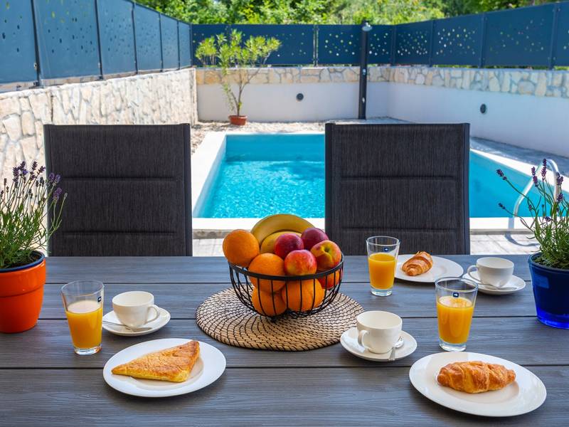 Located in Malinska on the island of Krk, just 800 meters from the sea, this modern villa offers the perfect vacation with a private hydromassage pool. Elegantly decorated, the villa can accommodate up to six people and offers three spacious bedrooms located on the 1st floor, two bathrooms and an additional toilet. On the ground floor there is a spacious living room with a fully equipped kitchen and dining area, while the balcony reveals a captivating panoramic view of the sea and the surrounding landscape. The villa's outdoor area is perfectly arranged for relaxation, with sun loungers by the pool, a barbecue and private parking. Ideal for families and friends looking for a comfortable and luxurious vacation on the Adriatic.