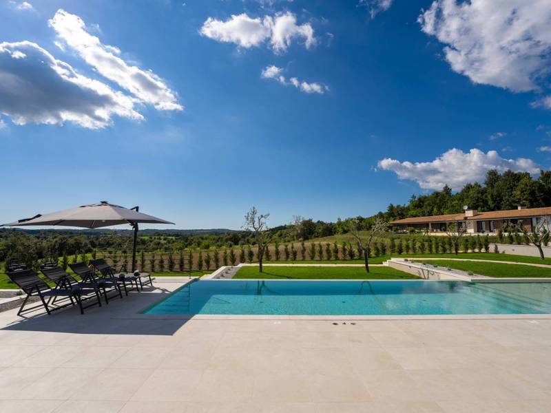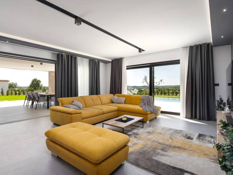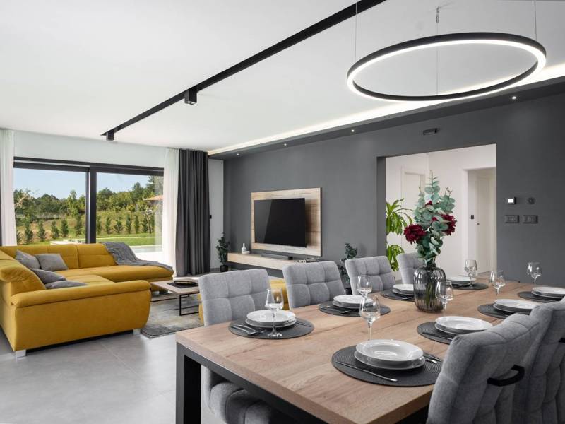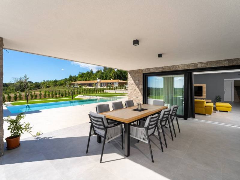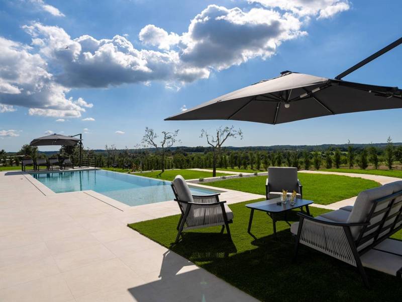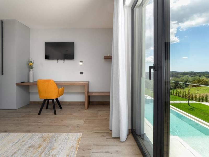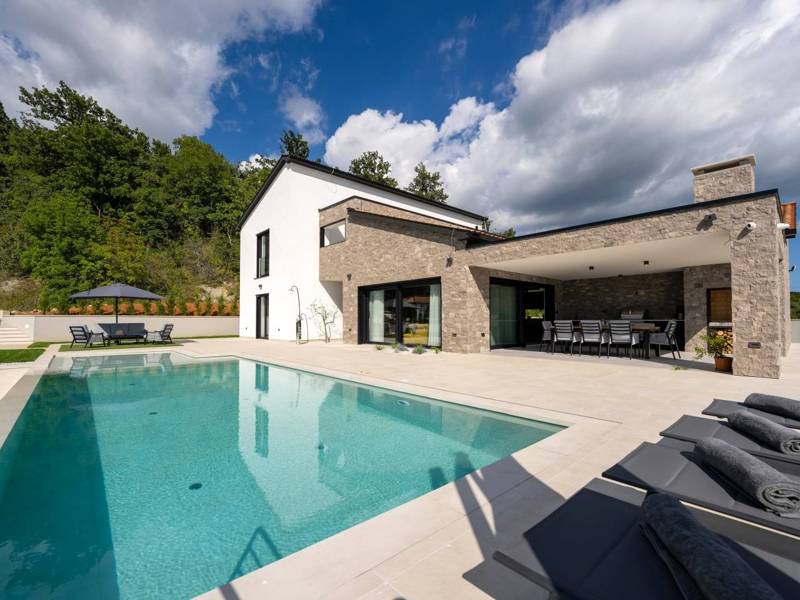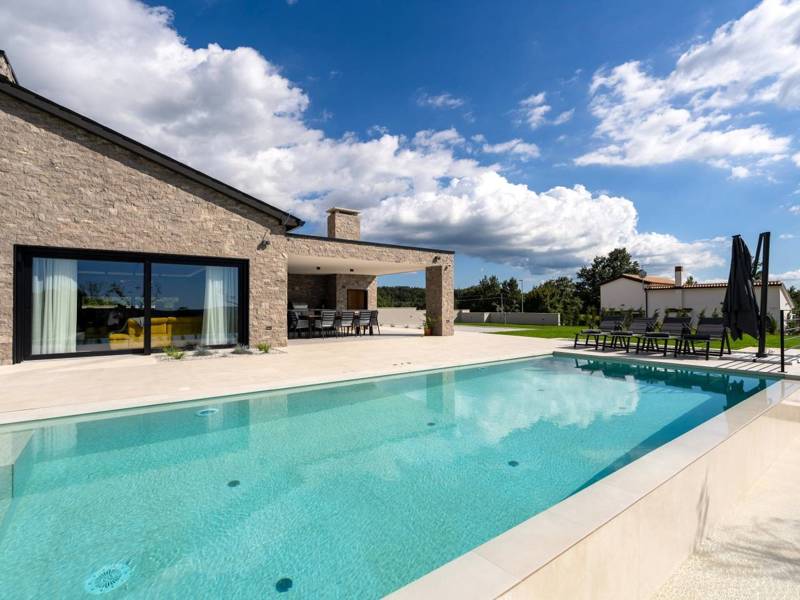 Villa Angelina is a beautiful and luxurious retreat nestled amidst unspoiled nature, offering panoramic views of the surrounding hills. Centrally located in the small village of Mandalenčići in Central Istria—just a few minutes’ drive from the town of Pazin—this villa is an ideal choice for families seeking a peaceful countryside vacation while still being close to beaches and all major attractions Istria has to offer.This exquisite villa features four elegant en-suite bedrooms, ensuring privacy and comfort for every guest. Thoughtfully decorated with great attention to detail, the interior is spread across two floors.The ground floor includes a spacious living room, a fully equipped kitchen with a dining area, a separate toilet, and a dedicated media room equipped with a large TV and game console—a perfect space for movie nights, gaming, or simply relaxing together. On this floor you will also find two beautifully decorated bedrooms, each with a double bed, TV, and private bathroom.The upper floor hosts the remaining two bedrooms, also featuring double beds, TVs, and private bathrooms. A small balcony on this level offers a lovely view of the surrounding hills.The outdoor area—where you’ll likely spend most of your time—features a covered terrace with a dining table, charcoal and gas barbecues, and a welcoming space for enjoying alfresco meals. The highlight is the 40 m2 swimming pool with a shallow section ideal for children. Surrounding the pool are eight inviting sun loungers and a spacious sun deck, creating your private oasis for relaxation.For additional fun, enjoy friendly games of billiards or make the most of the villa’s standout feature—the spacious media room, offering entertainment for all ages. The villa is fully air-conditioned, provides free Wi-Fi, and the completely enclosed property includes four private parking spaces. With its serene setting, modern comforts, and excellent entertainment options, Villa Angelina ensures an unforgettable and enjoyable stay.A baby cot and high chair are available upon request. Please let us know in advance if you need them so the owner can prepare everything for your arrival.Youth groups are not allowed at this property. A youth group is one comprised of individuals aged 26 or under. If you are a youth group please note that the reservation might be rejected post-booking, which may include on arrival at the property or during your stay and you might not be refunded.