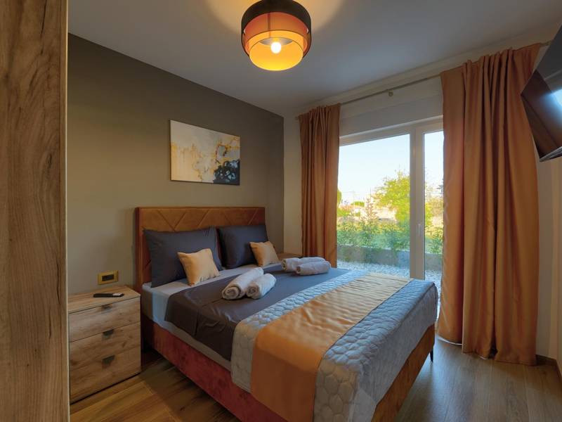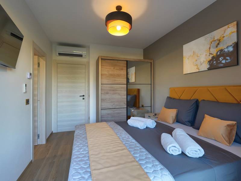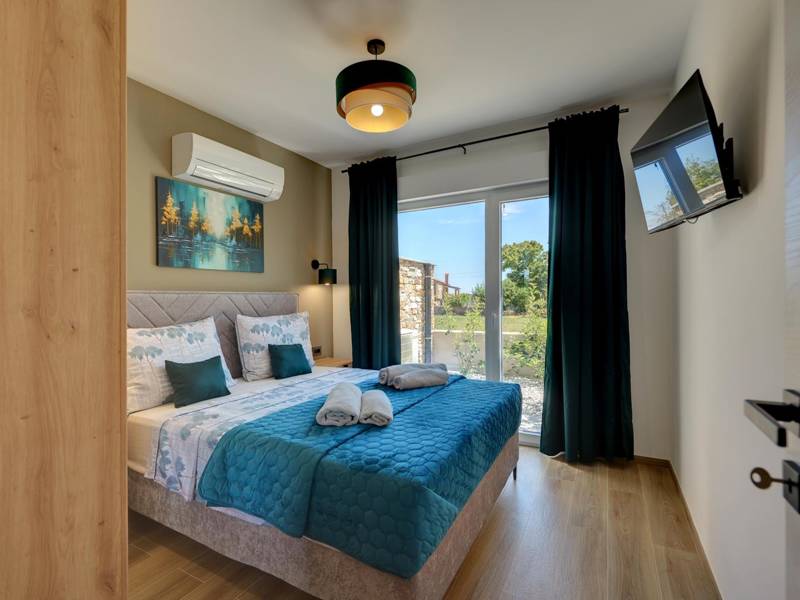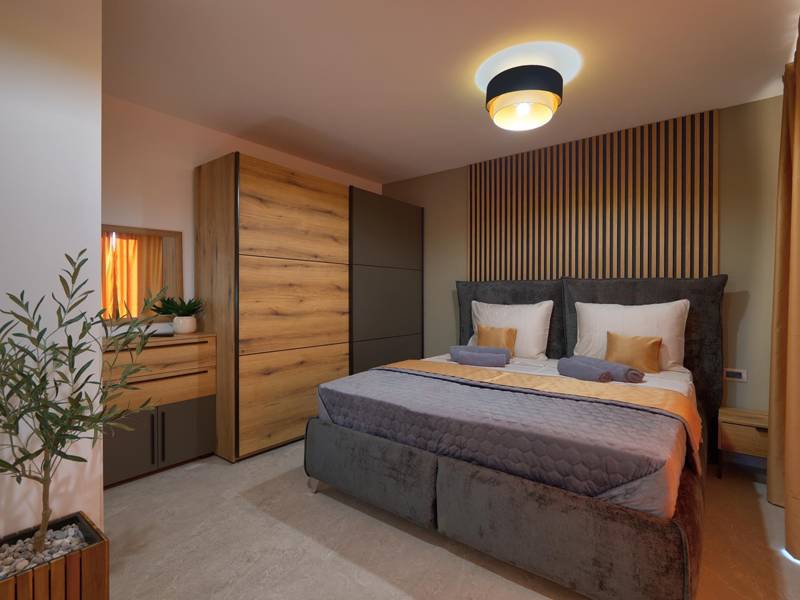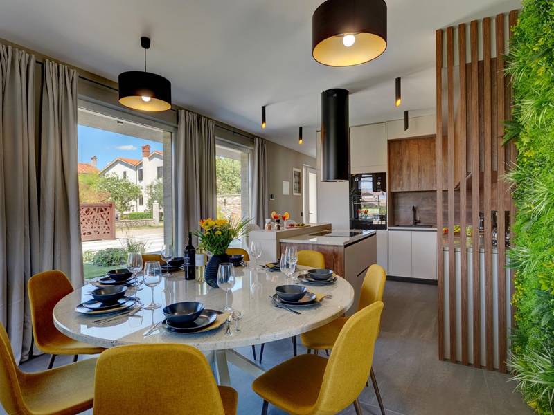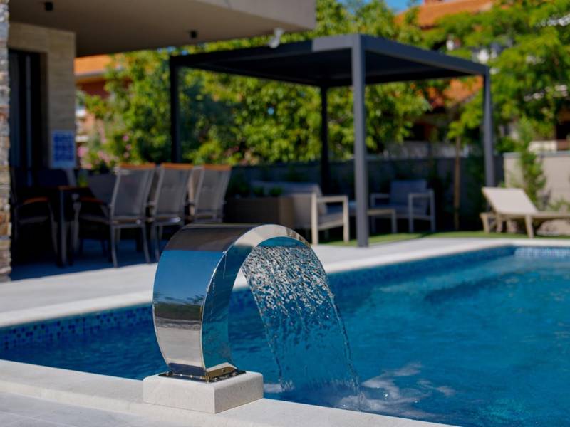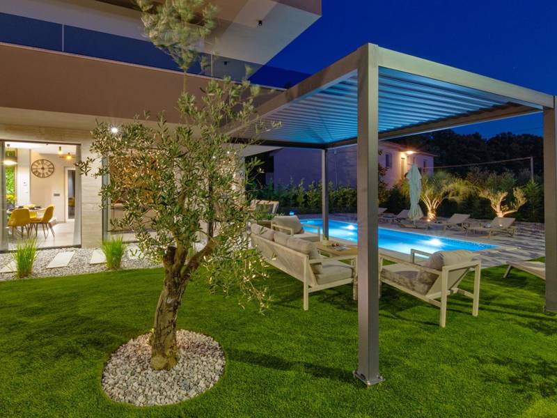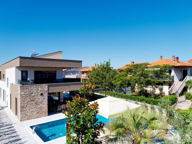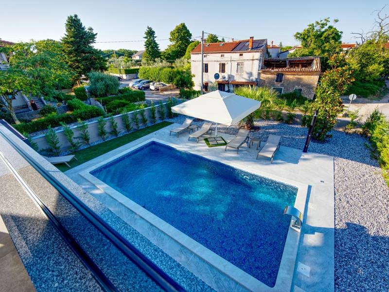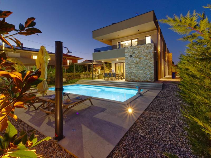 These two modern villas, Villa Bavigo and Villa Pieron, located near Pula, are perfect for a private and comfortable vacation. Connected only by the back wall, they can be rented individually or together, making them ideal for larger families or groups of friends.Both villas offer luxurious accommodation with four bedrooms, four bathrooms, a spacious living room, and a fully equipped kitchen. The outdoor area features a private pool with a waterfall, a cozy dining space, a barbecue, and a summer kitchen. For additional entertainment, there are table tennis and table football.On the first floor of each villa, there is a living room with access to the terrace, one bedroom with a double bed and bathroom, while the second floor includes three more bedrooms, each with a private bathroom and access to the terrace. The wellness area with a hot tub and sauna is also located on this floor, allowing you to relax completely during your stay.Each villa is air-conditioned and suitable for up to eight people, while both villas together can accommodate up to 16 guests. The yard features a private pool, sun loungers, umbrellas, and a covered terrace, perfect for evening gatherings and barbecues. The enclosed yard ensures complete privacy, and there are two private parking spaces available per villa.Book one or both villas and ensure an unforgettable vacation in beautiful Istria. Note: Pets and youth groups are allowed only upon request.