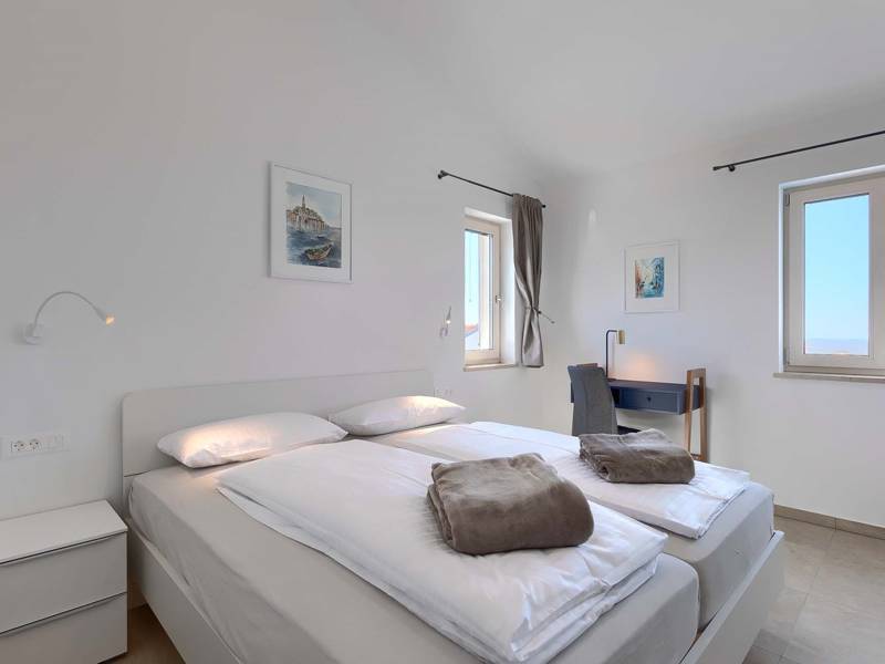 Experience relaxation at its highest level in the beautiful Villa Lisetta, located in the peaceful surroundings of Markovac, not far from the picturesque Višnjan. This villa ensures an unforgettable stay for 4 guests, offering a unique combination of comfort and a spectacular sea view. Enjoy the breathtaking panoramic views from the spacious terrace, balcony, or the refreshing pool. This heavenly spot provides complete privacy. On the ground floor of the villa, you will be greeted by a hallway leading to an elegant living room and a guest WC. On the upper floor, two luxurious bedrooms await you with their own ensuite bathrooms and walk-in shower cabins. The balcony offers an incredible sea view, perfect for relaxation and enjoyment.