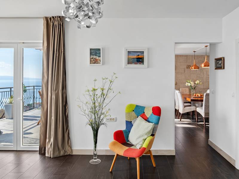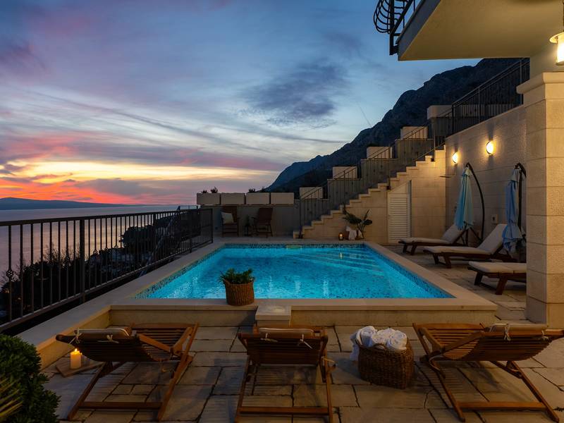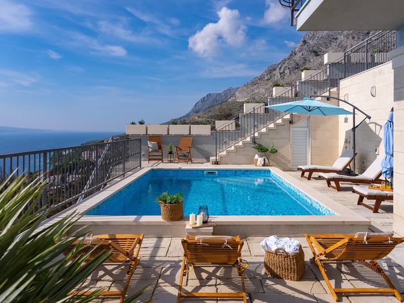 **Villa S&A** - a comfortable retreat with heated private pool Discover Villa S&A, an ideal accommodation for up to 6 guests, featuring a heated private pool and breathtaking panoramic views of the crystal-clear turquoise waters of the Adriatic Sea and the island of Brač. This villa guarantees your privacy and is situated in a peaceful and quiet area, ensuring a relaxing stay. The property is set on a slope and consists of multiple levels, covering a total area of 500 sqm, with the villa itself spanning 200 sqm. A car is recommended, and two parking spaces are reserved for your convenience. The villa is fully air-conditioned and offers complimentary Wi-Fi. **Villa Layout:** *First Level:* - The main entrance leads to the bedroom area, which includes: - **Bedroom 1**: Master bedroom with a king-size bed (180cm x 200cm), a balcony with open sea views, an en-suite bathroom with a shower, air-conditioning, and a TV. - **Bedroom 2**: Queen-size bed (160cm x 200cm), a balcony with open sea views, air-conditioning, and a TV. - **Bedroom 3**: Two single beds (90cm x 200cm), a balcony with open sea views, air-conditioning, and a TV. - A family bathroom with a shower is available for bedrooms 2 and 3. Each bathroom is stocked with toiletries, including shampoo, conditioner, shower gel, bathrobes, slippers, and hairdryers. *Lower Level:* - An internal staircase leads to the spacious, open-plan living room area, which boasts stunning sea views and connects to the outdoor dining space. The living room features comfortable sofas, a TV, air conditioning, and a fully equipped kitchen with a dining area for 8 people, plus a cozy fireplace. The kitchen includes modern appliances, including a DeLonghi espresso machine, a blender, a microwave, and a kettle. Additionally, there is a family bathroom with a shower and a washing machine. *Outdoor Area:* - The outdoor dining area is conveniently connected to the kitchen and living room, featuring a covered space with a gas barbecue and stunning sea and island views for you to enjoy at any time of the day or night. Adjacent to this is a playground for children, complete with a trampoline, a wooden playhouse with a slide, and a swing. The property also includes 3 mountain bikes for your use. *Pool Area:* - Descend outdoor stairs to the pool area, which offers a private 25 sqm heated pool with a counter-current program, providing absolute privacy. Here, you’ll find 6 deck chairs and a lounge corner perfect for relaxing with a glass of wine and a good book while enjoying the spectacular views. Villa S&A is a unique and spacious retreat, well-equipped for your comfort, and managed by friendly owners eager to provide information on local attractions and activities. This villa is truly a perfect location for your ideal holiday. Welcome to Villa S&A in Mimice!