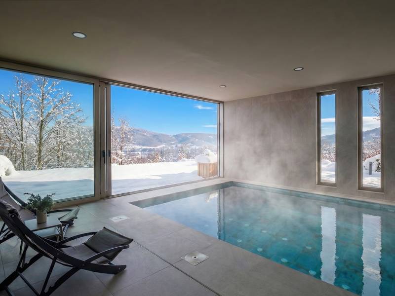 This beautiful luxury house with indoor swimming pool is located in Mrkopalj. It has 3 bedrooms and it can accommodate up to 9 people. It spreads over 3 floors: ground floor, first floor and attic. On the ground floor there is a fully equipped kitchen, a spacious living room and wellness with heated pool with jets at 32 degrees, Finnish sauna and tea corner. The house consists of 3 bedrooms, each with its own bathroom. The first bedroom features a double bed (king size) and two bunk beds, the 2nd bedroom features double bed (king size) while the 3rd bedroom has a double bed (king size) and couch/bed for 1 person. Each bathroom features a shower. In the attic there is a cinema hall and board games. Outside you can enjoy in BBQ facilities surrounded with evergreen trees and a children playground. In the courtyard, there are 6 parking spots, and also the guests have an electric socket on their disposal, where they can charge their electric car.