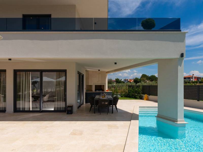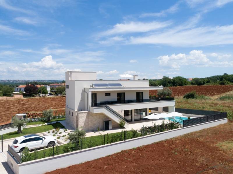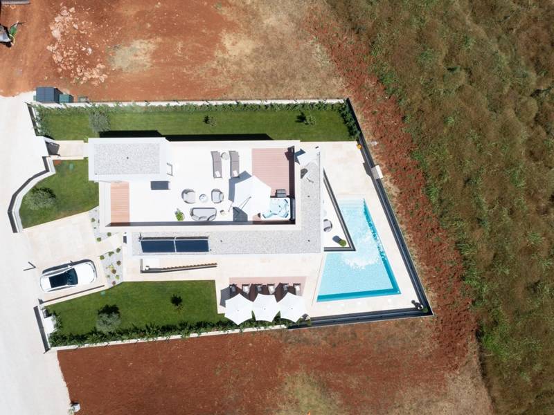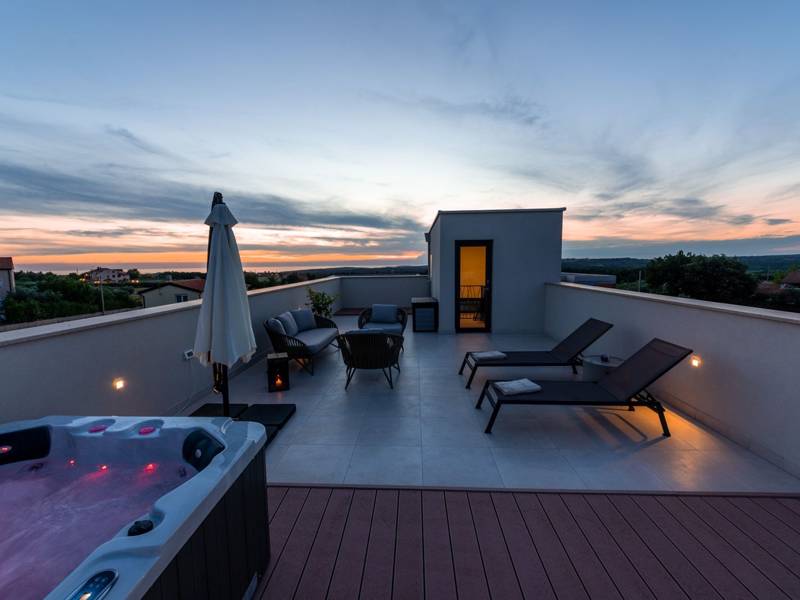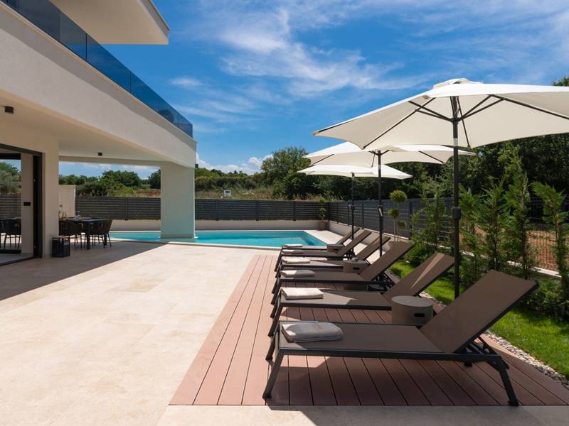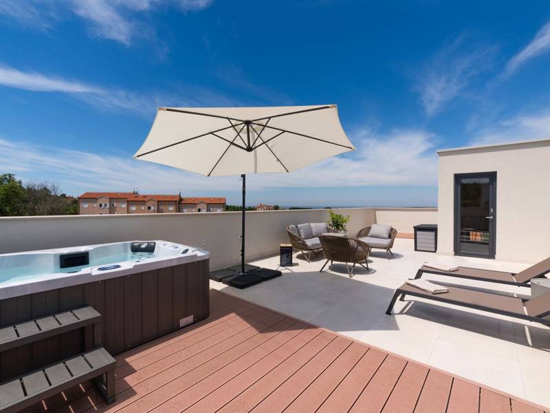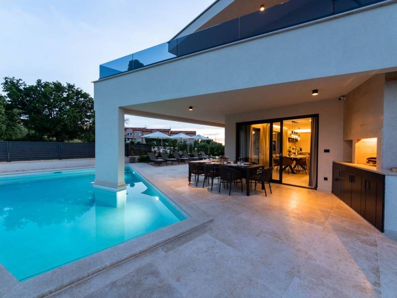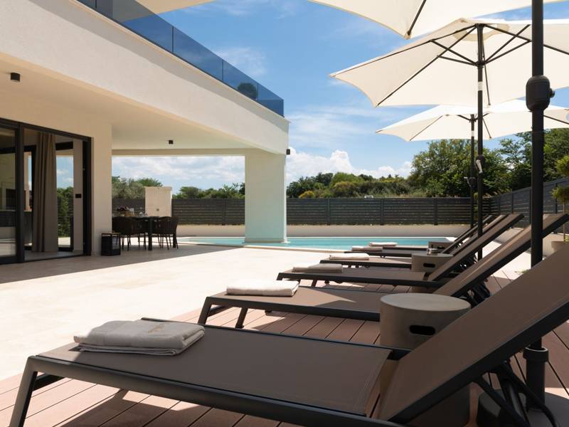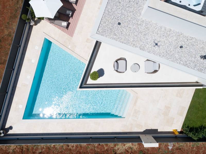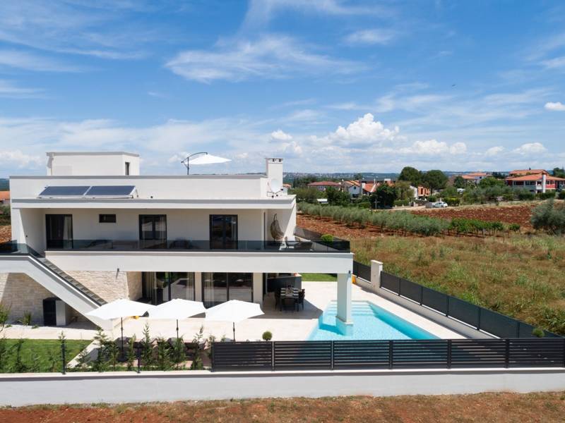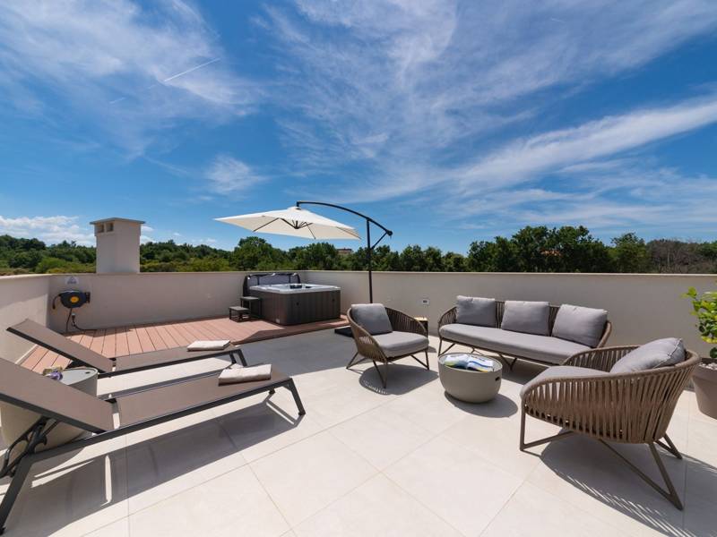 Villa Perla, luxurious modern holiday home with pool and jacuzzi near Porec.The holiday home is particularly attractive because of the one floor of the house that "ends" in the pool, the external stairs leading to the terrace from the bedrooms and the large roof terrace with wonderful panoramic view of the sea, with Jacuzzi, lounge set and sun loungers. Villa Perla is situated on its own enclosed property of 620 sqm where guests have an outdoor pool of 50 sqm, covered terrace with barbecue fireplace and dining table, sun deck with sun loungers, well-maintained lawn and parking for two vehicles.Holiday home of 220 sqm on two air-conditioned floors with 75 sqm roof terrace. On the ground floor is a luxuriously furnished living room with sitting area, dining table and fully equipped kitchen, a shower/toilet and a laundry room. On the first floor are three bedrooms, one with a double bed, the second with two single beds and the third with a double bed and shower/toilet, another shower/toilet is in the hallway.Youth groups are strictly forbidden!NOTE: The pool can be used in the period 01.05. - 31.10.