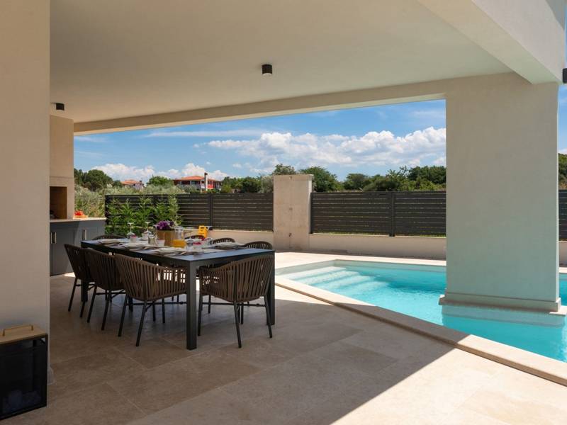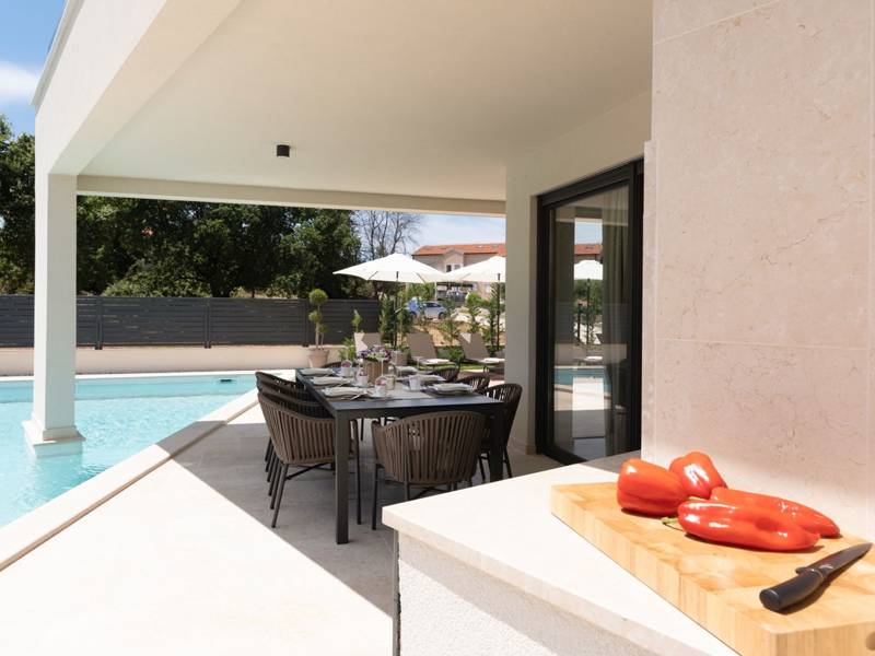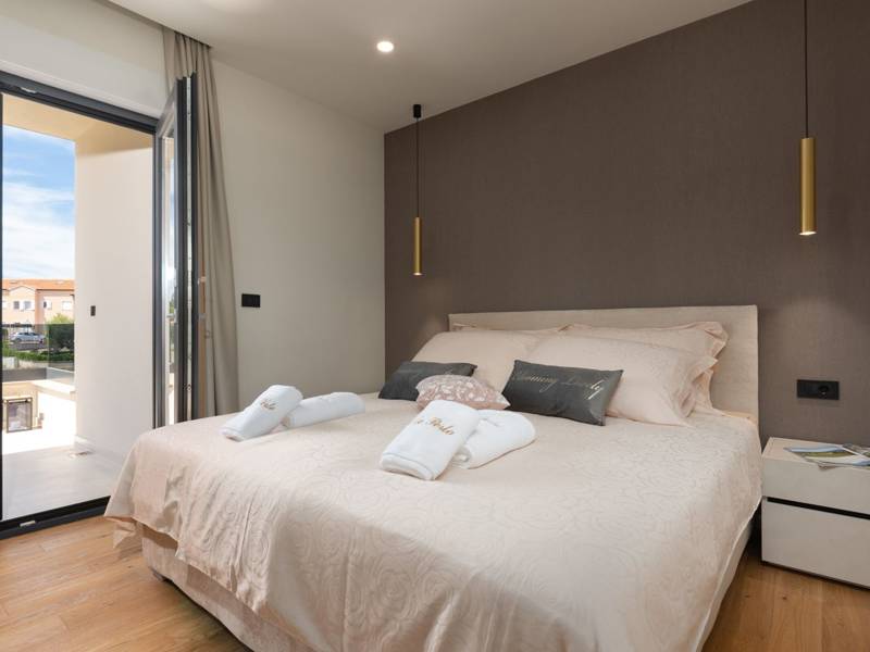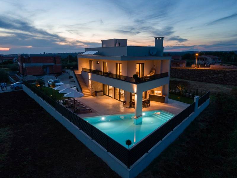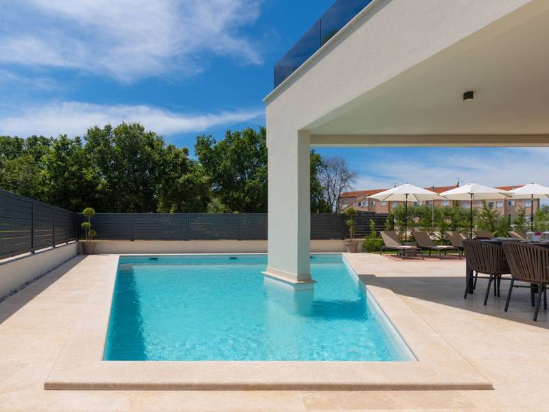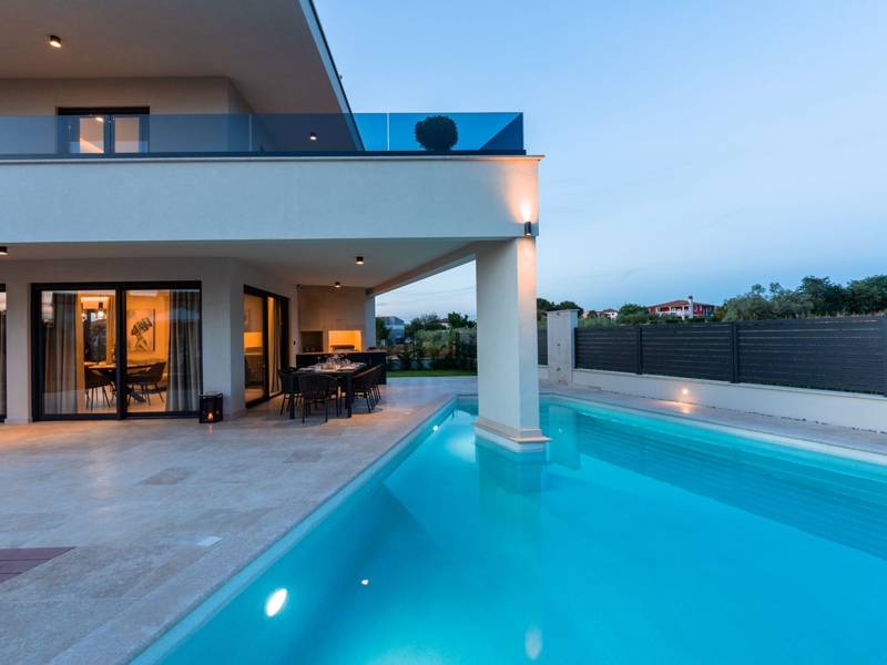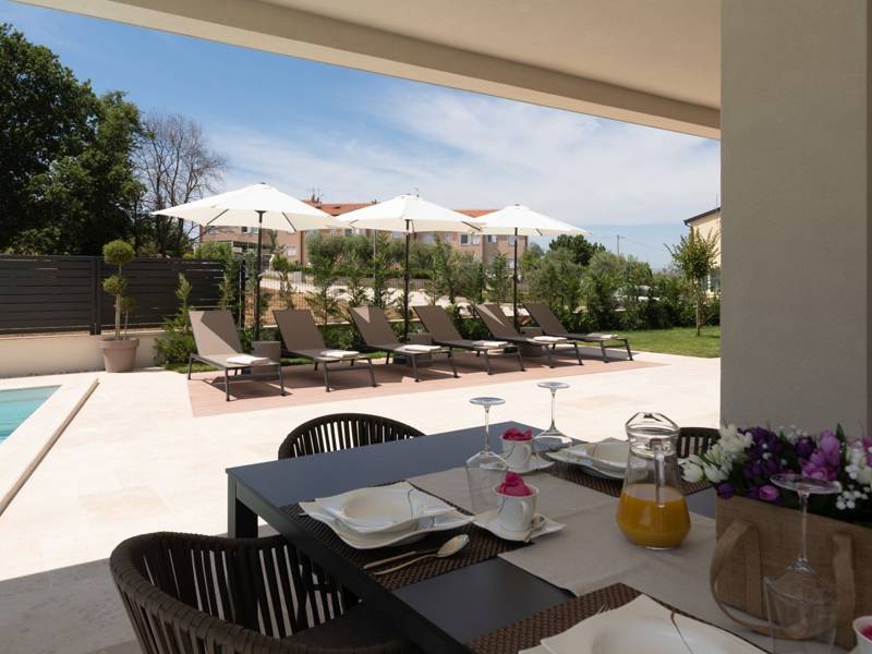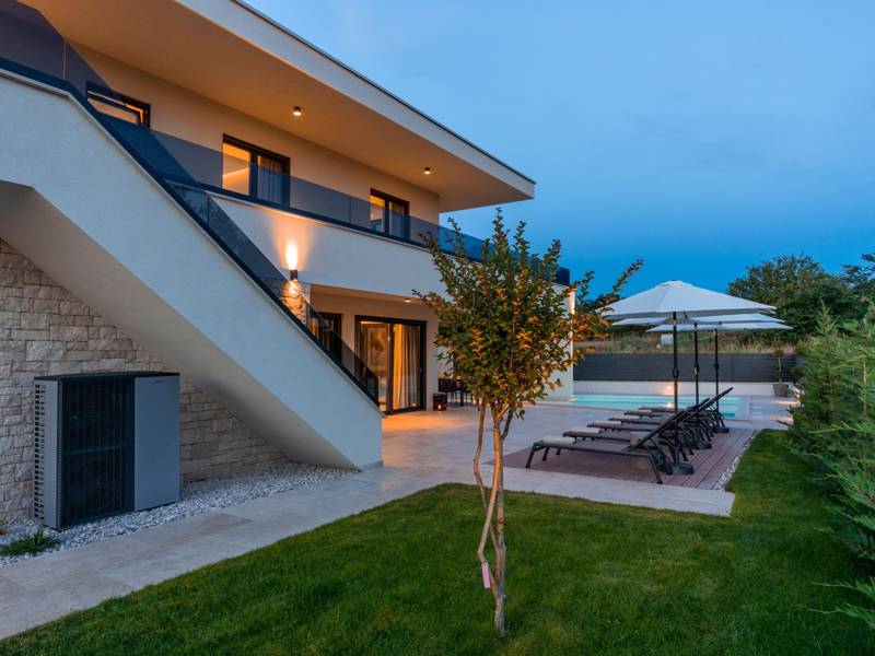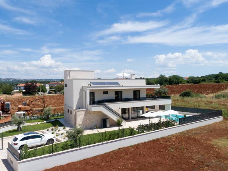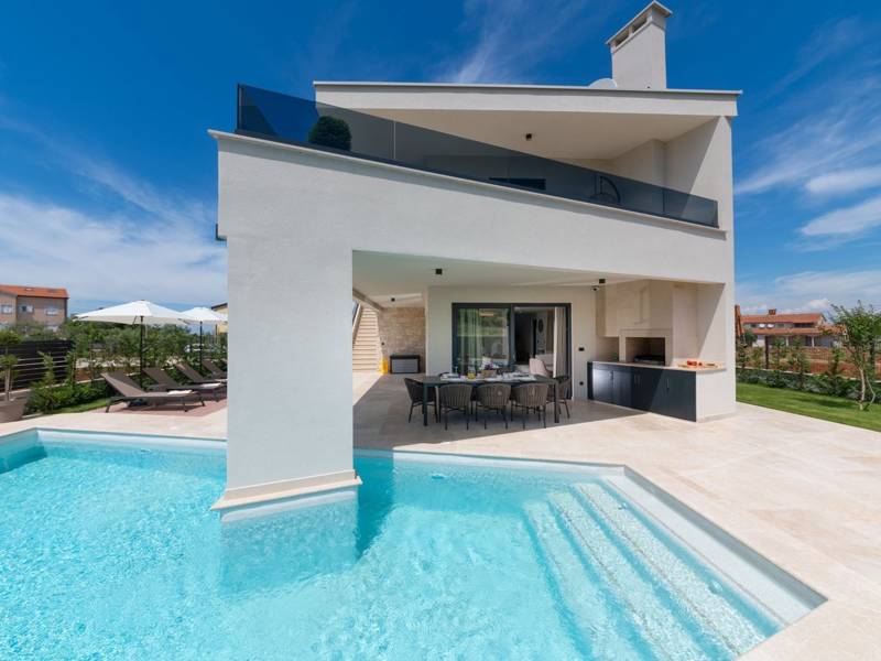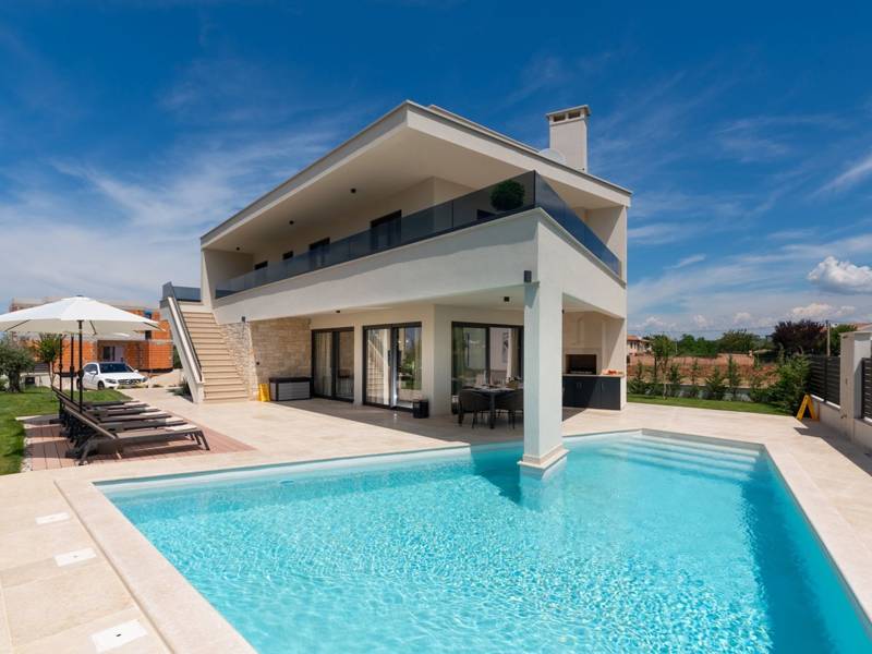 Villa Perla, luxurious modern holiday home with pool and jacuzzi near Porec.The holiday home is particularly attractive because of the one floor of the house that "ends" in the pool, the external stairs leading to the terrace from the bedrooms and the large roof terrace with wonderful panoramic view of the sea, with Jacuzzi, lounge set and sun loungers. Villa Perla is situated on its own enclosed property of 620 sqm where guests have an outdoor pool of 50 sqm, covered terrace with barbecue fireplace and dining table, sun deck with sun loungers, well-maintained lawn and parking for two vehicles.Holiday home of 220 sqm on two air-conditioned floors with 75 sqm roof terrace. On the ground floor is a luxuriously furnished living room with sitting area, dining table and fully equipped kitchen, a shower/toilet and a laundry room. On the first floor are three bedrooms, one with a double bed, the second with two single beds and the third with a double bed and shower/toilet, another shower/toilet is in the hallway.Youth groups are strictly forbidden!NOTE: The pool can be used in the period 01.05. - 31.10.
