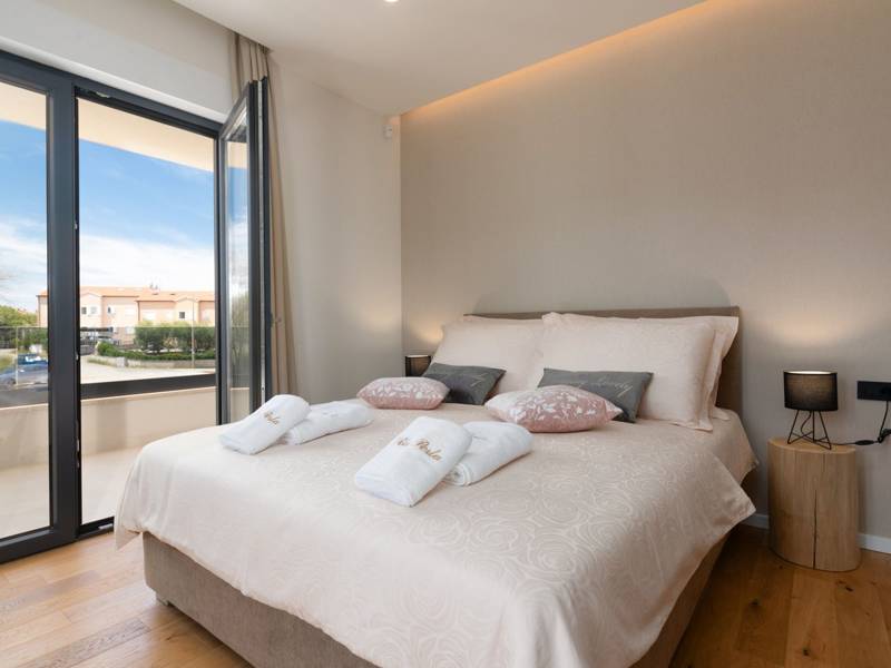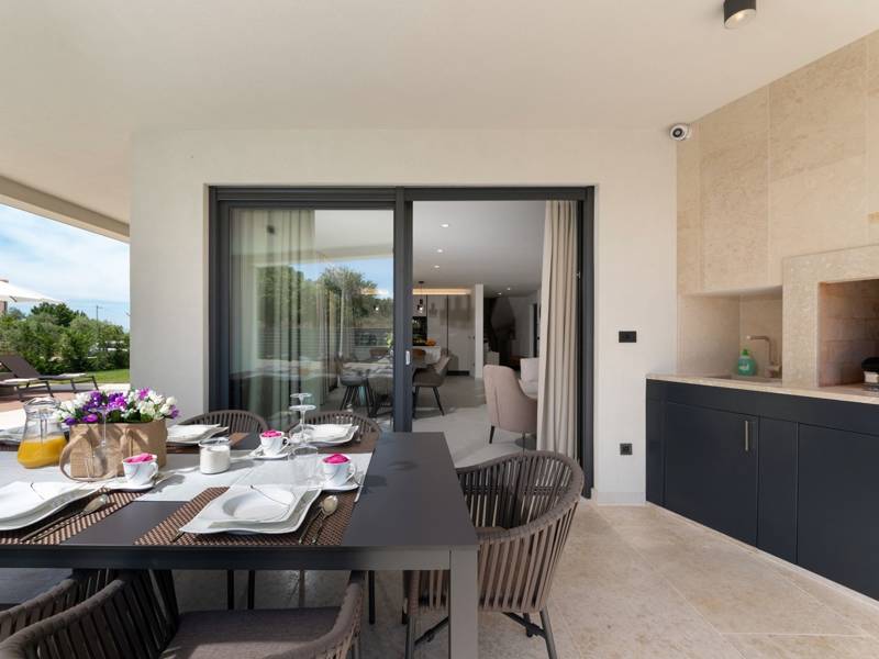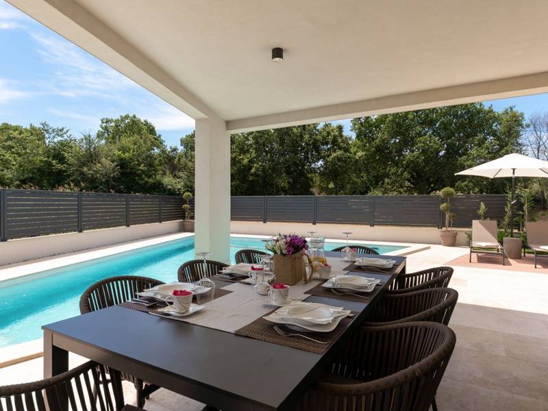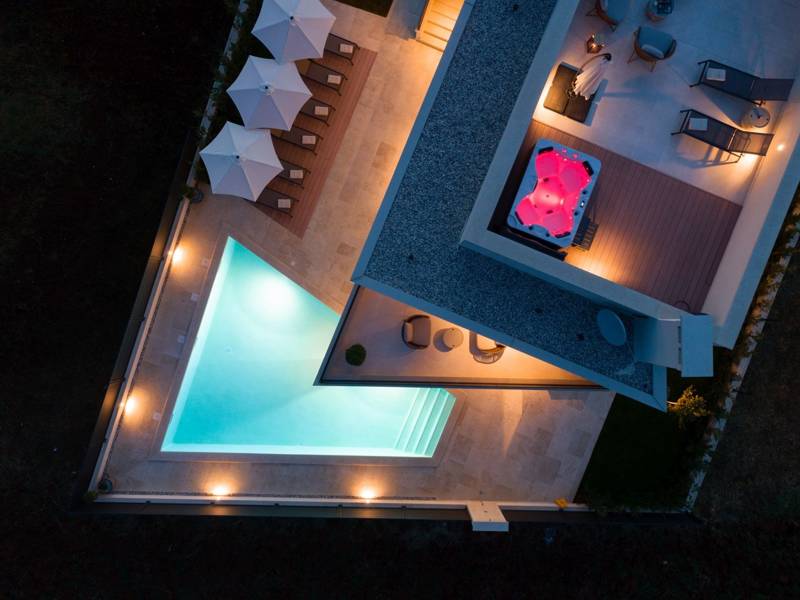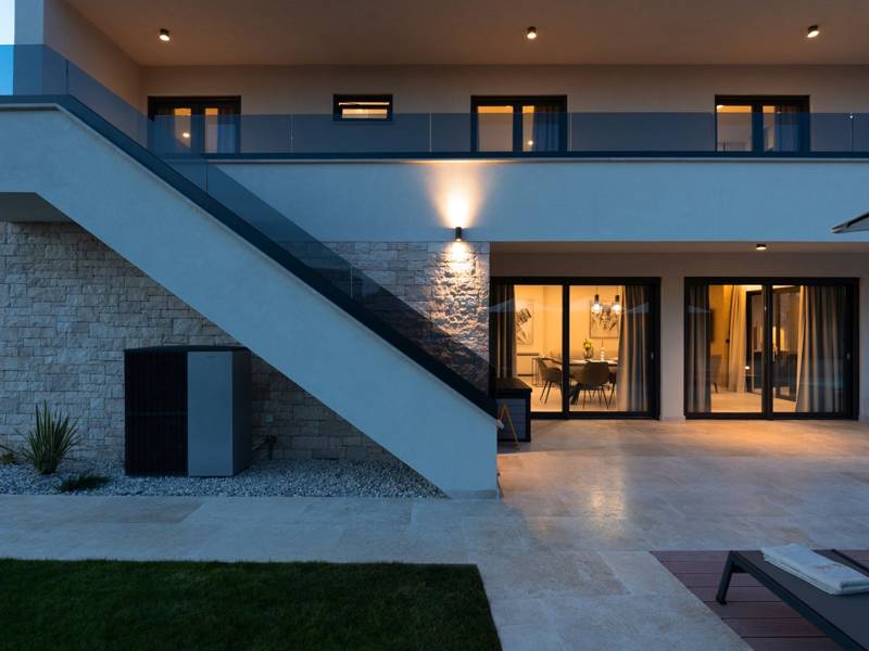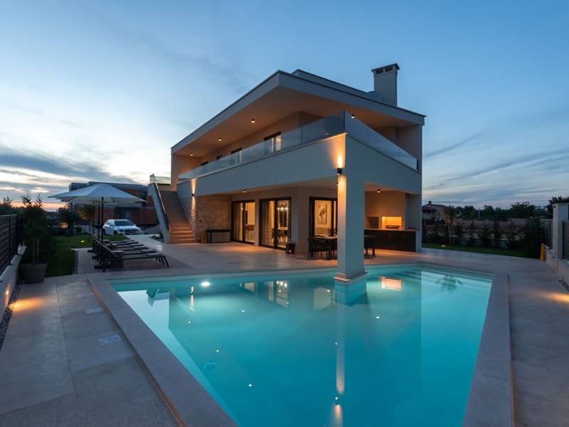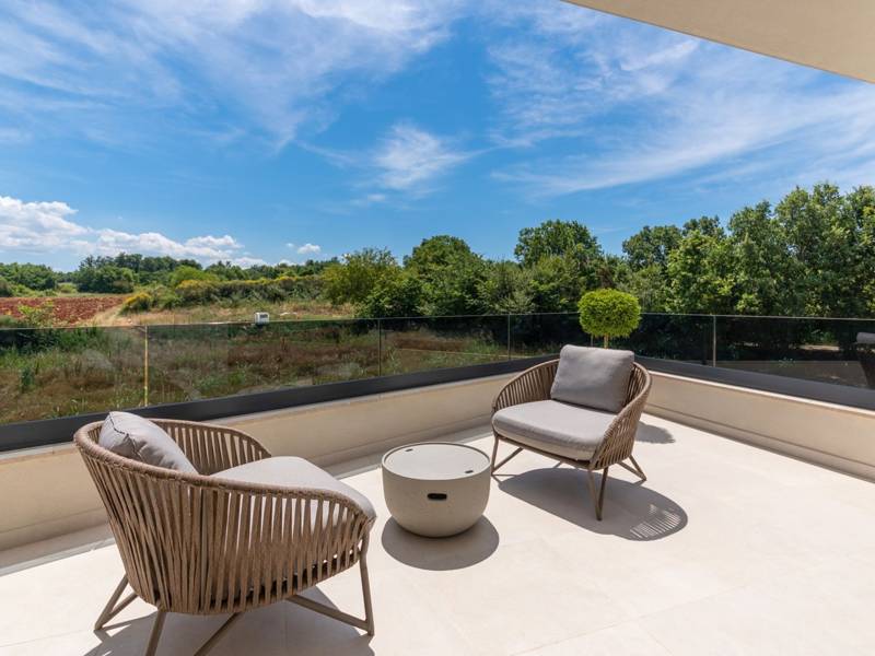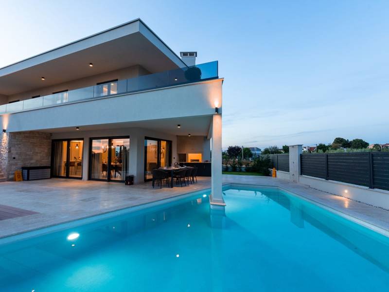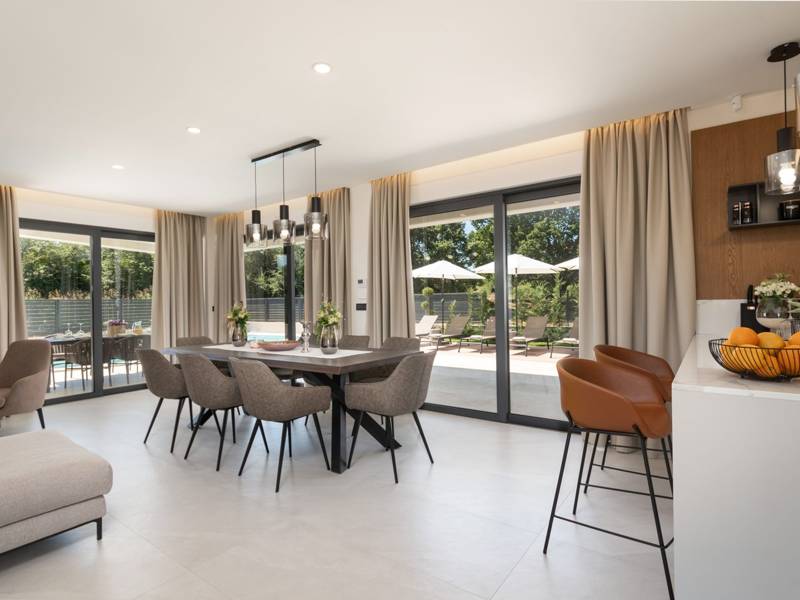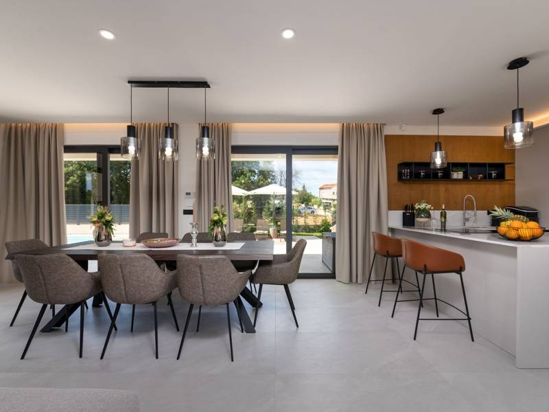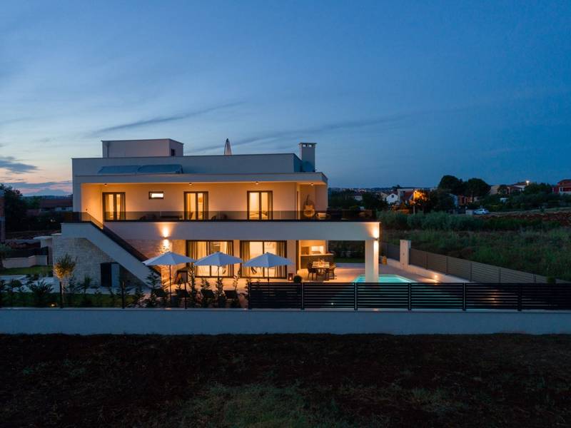 Villa Perla, luxurious modern holiday home with pool and jacuzzi near Porec.The holiday home is particularly attractive because of the one floor of the house that "ends" in the pool, the external stairs leading to the terrace from the bedrooms and the large roof terrace with wonderful panoramic view of the sea, with Jacuzzi, lounge set and sun loungers. Villa Perla is situated on its own enclosed property of 620 sqm where guests have an outdoor pool of 50 sqm, covered terrace with barbecue fireplace and dining table, sun deck with sun loungers, well-maintained lawn and parking for two vehicles.Holiday home of 220 sqm on two air-conditioned floors with 75 sqm roof terrace. On the ground floor is a luxuriously furnished living room with sitting area, dining table and fully equipped kitchen, a shower/toilet and a laundry room. On the first floor are three bedrooms, one with a double bed, the second with two single beds and the third with a double bed and shower/toilet, another shower/toilet is in the hallway.Youth groups are strictly forbidden!NOTE: The pool can be used in the period 01.05. - 31.10.