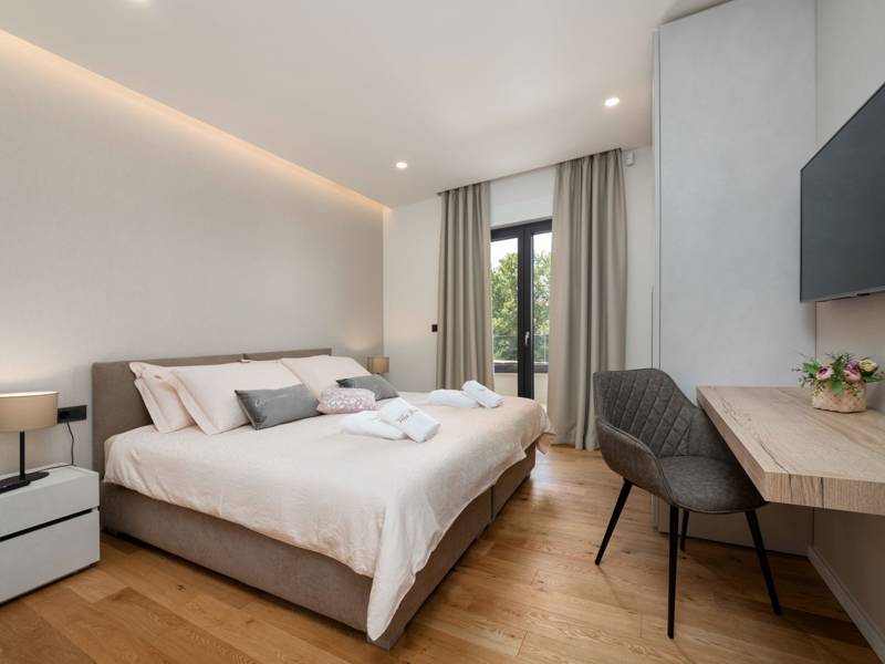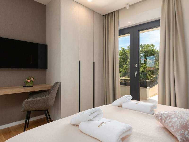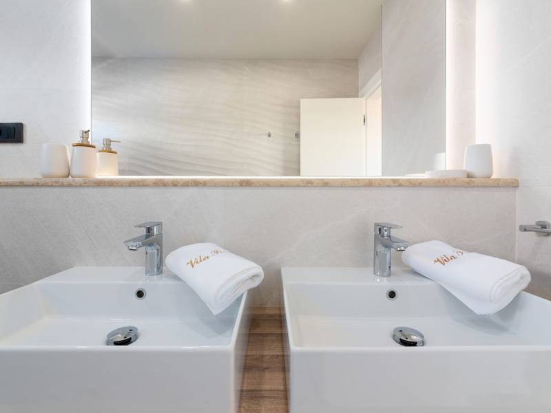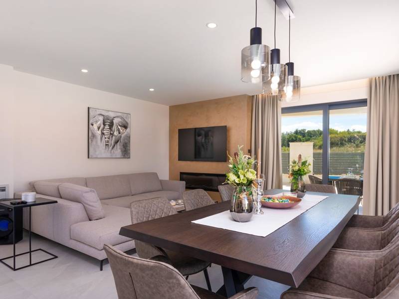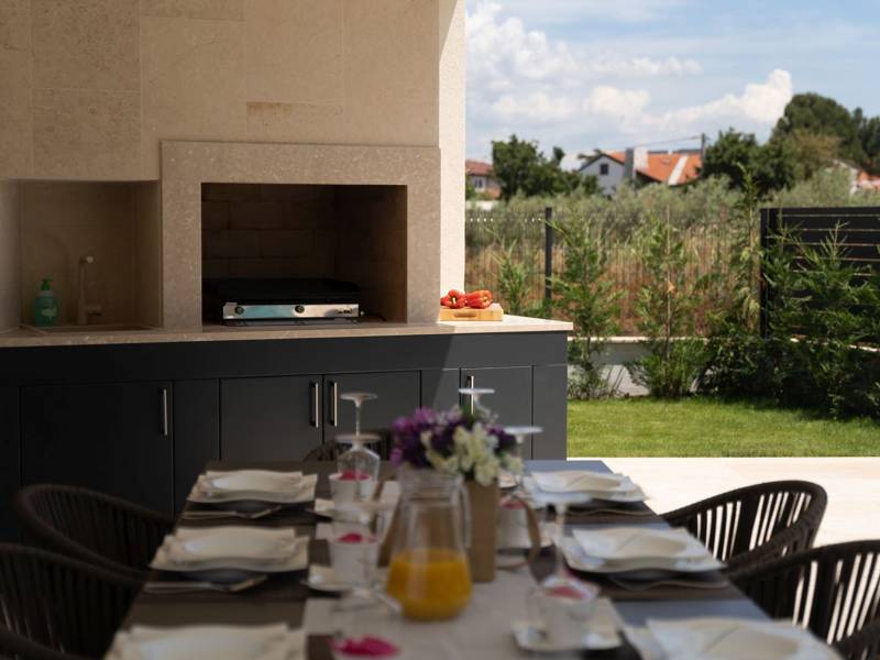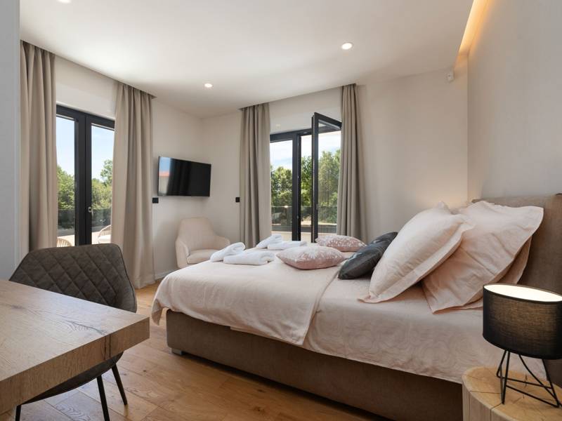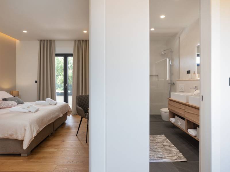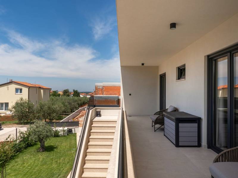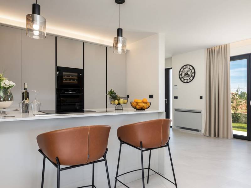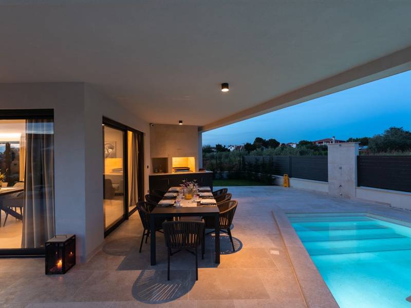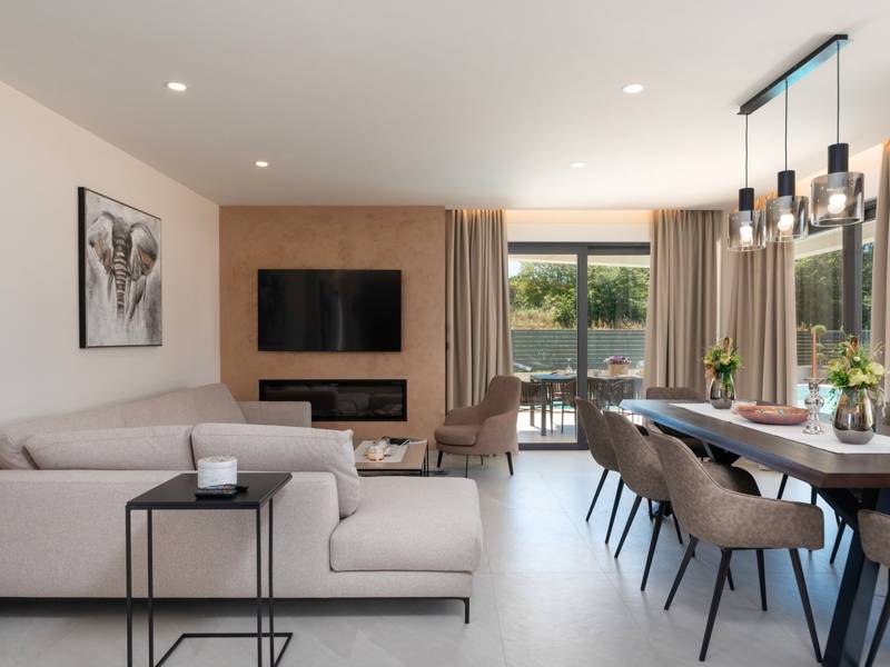 Villa Perla, luxurious modern holiday home with pool and jacuzzi near Porec.The holiday home is particularly attractive because of the one floor of the house that "ends" in the pool, the external stairs leading to the terrace from the bedrooms and the large roof terrace with wonderful panoramic view of the sea, with Jacuzzi, lounge set and sun loungers. Villa Perla is situated on its own enclosed property of 620 sqm where guests have an outdoor pool of 50 sqm, covered terrace with barbecue fireplace and dining table, sun deck with sun loungers, well-maintained lawn and parking for two vehicles.Holiday home of 220 sqm on two air-conditioned floors with 75 sqm roof terrace. On the ground floor is a luxuriously furnished living room with sitting area, dining table and fully equipped kitchen, a shower/toilet and a laundry room. On the first floor are three bedrooms, one with a double bed, the second with two single beds and the third with a double bed and shower/toilet, another shower/toilet is in the hallway.Youth groups are strictly forbidden!NOTE: The pool can be used in the period 01.05. - 31.10.