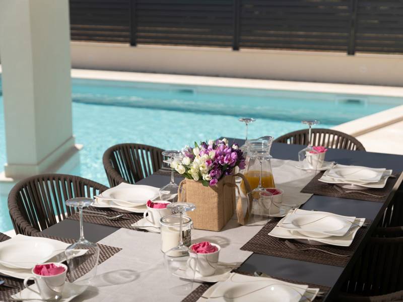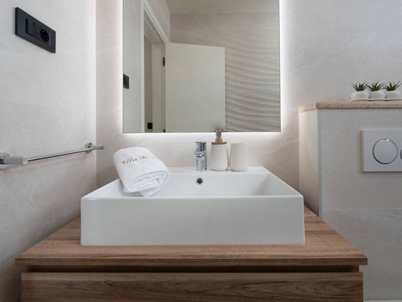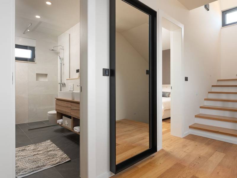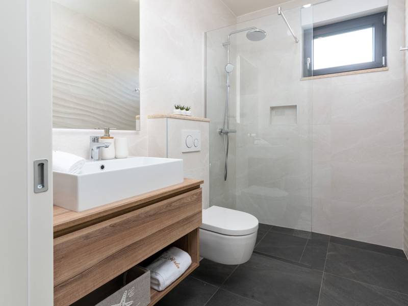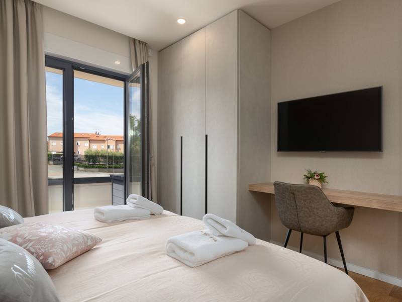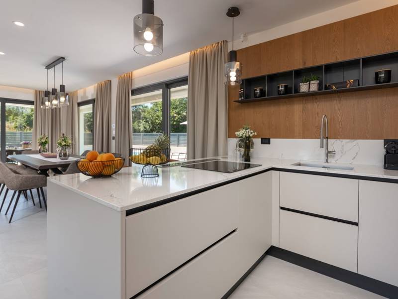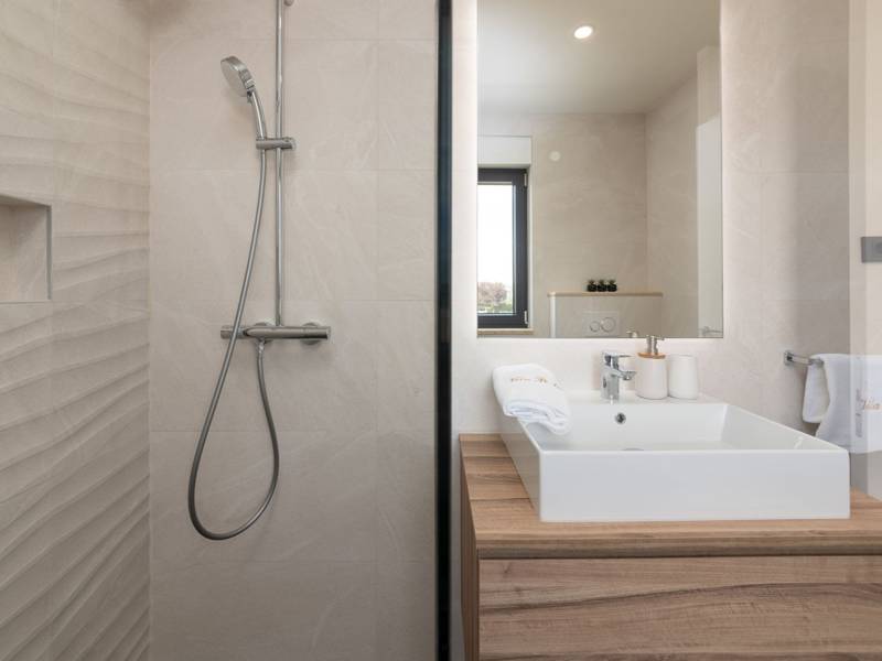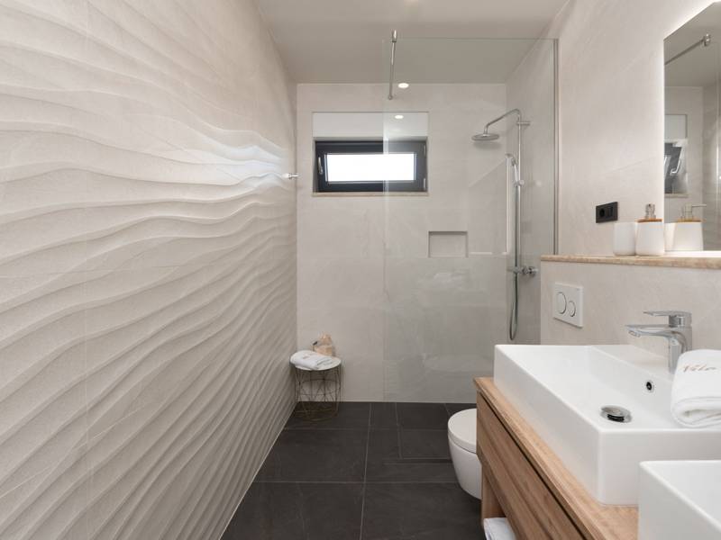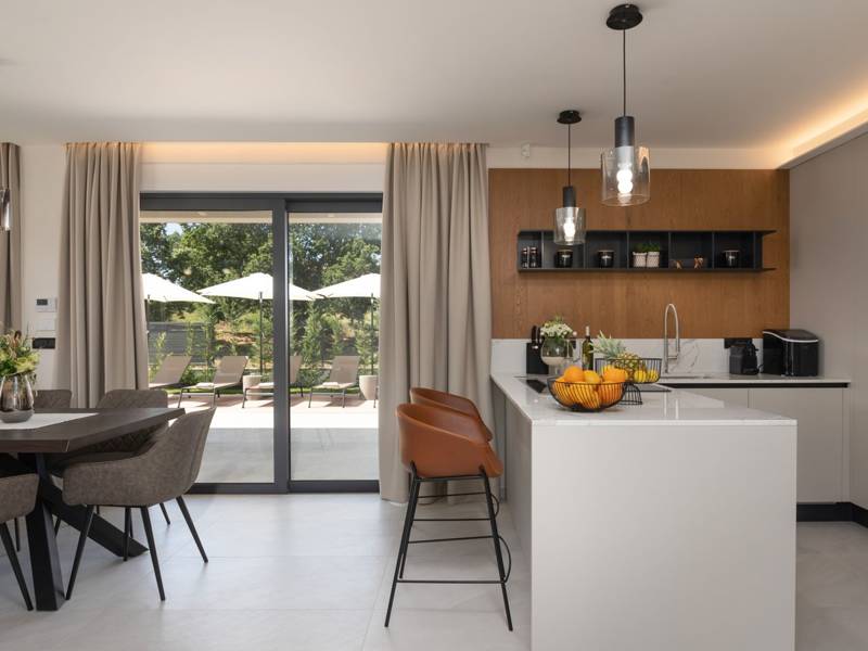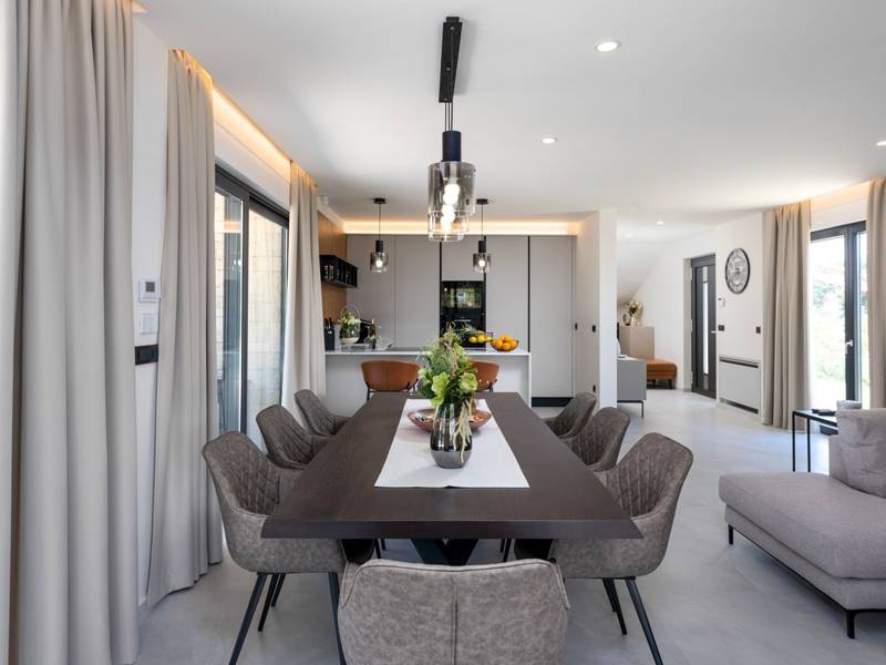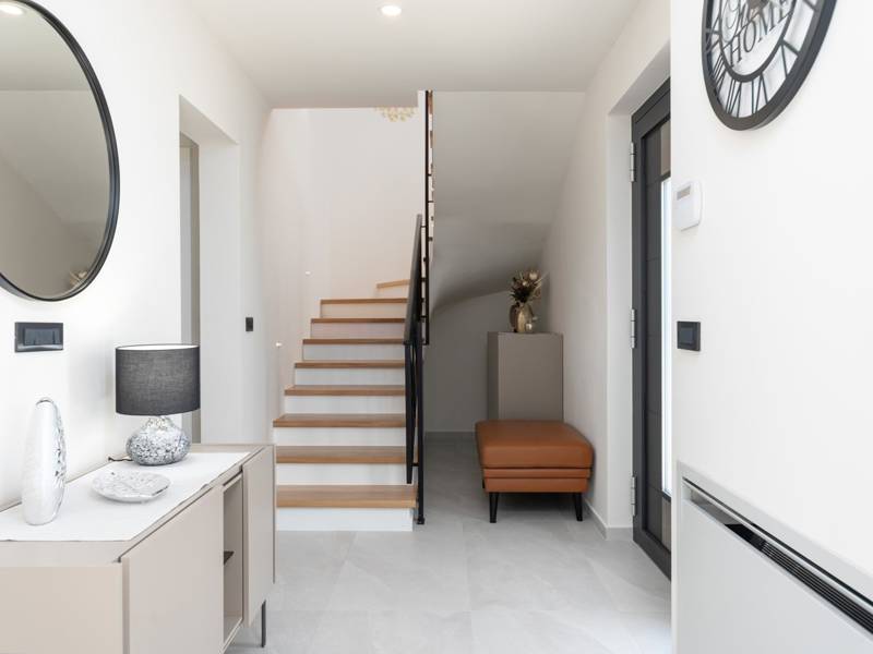 Villa Perla, luxurious modern holiday home with pool and jacuzzi near Porec.The holiday home is particularly attractive because of the one floor of the house that "ends" in the pool, the external stairs leading to the terrace from the bedrooms and the large roof terrace with wonderful panoramic view of the sea, with Jacuzzi, lounge set and sun loungers. Villa Perla is situated on its own enclosed property of 620 sqm where guests have an outdoor pool of 50 sqm, covered terrace with barbecue fireplace and dining table, sun deck with sun loungers, well-maintained lawn and parking for two vehicles.Holiday home of 220 sqm on two air-conditioned floors with 75 sqm roof terrace. On the ground floor is a luxuriously furnished living room with sitting area, dining table and fully equipped kitchen, a shower/toilet and a laundry room. On the first floor are three bedrooms, one with a double bed, the second with two single beds and the third with a double bed and shower/toilet, another shower/toilet is in the hallway.Youth groups are strictly forbidden!NOTE: The pool can be used in the period 01.05. - 31.10.