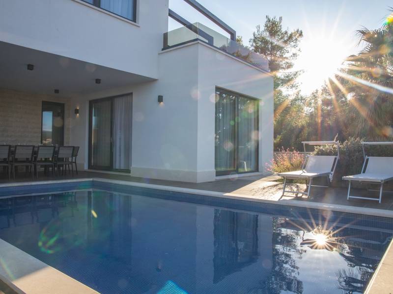 Villa Sunce will make all your holiday wishes come true. It provides the perfect five-star accommodation where you can relax, enjoy and soak up the warm Dalmatian sun. Located on the Island of Ciovo, this stylish villa can accommodate up to 11 persons and is just steps away from the nearest pebble beach. The villa has an indoor and an outdoor private pool (32 sqm). The interior of the villa offers beautiful, stylish furniture and modern design. In the lower ground floor of the villa, you will find a wellness area with a heated indoor pool, a sauna, a fitness room and an activity room with a pool table. The villa consists of 6 bedrooms, each with an en-suite bathroom, air-conditioning and Sat-TV. Two bedrooms are located on the ground floor, along with the living and dining area and the fully equipped kitchen. The remaining 4 bedrooms are spread over the top floor. From the living room there is an exit to the terrace with a beautiful sea view and with garden furniture, sun loungers, parasols and barbecue area. The villa has WiFi, private parking for 4 cars, a completely fenced garden and on top of everything, offers a magnificent view from the terrace on the sea and the town of Trogir.