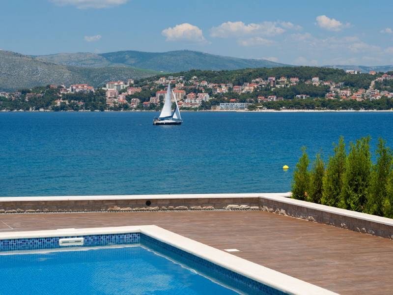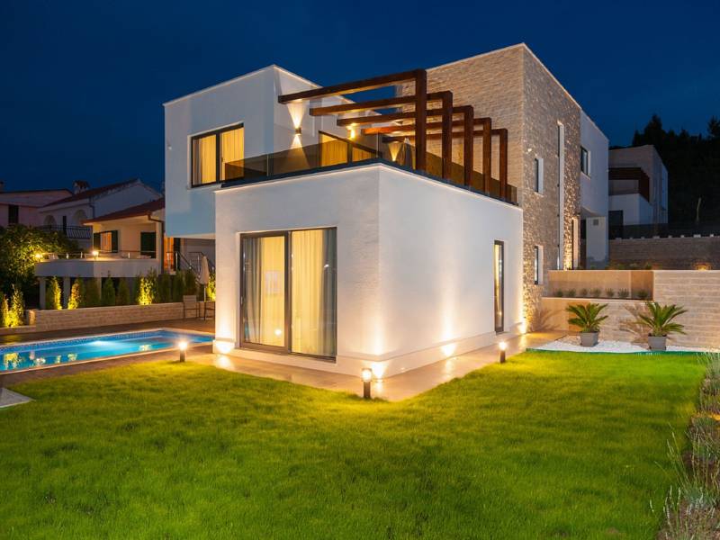 On the beautiful island of Ciovo, more precisely in Okrug Gornji, near the sea, is located the beautiful luxury Villa More with an enchanting view of the sea and the city of Trogir, which can be seen in the distance. The villa can accommodate up to eleven people and has an indoor and outdoor private pool. The villa is modernly decorated with simple and elegant lines of furniture and is fully air conditioned. On the lower ground floor of the villa there is a wellness center with a heated pool, sauna, fitness room and pool table. It has six bedrooms and each has its own bathroom. Two bedrooms are located on the ground floor, along with a living room, dining room and fully equipped kitchen. The remaining four bedrooms are located on the first floor of the house. From the living room there is an exit to the terrace with a beautiful sea view and with garden furniture, sun loungers and parasols and a barbecue in the background. Private parking for four cars is located next to the villa.