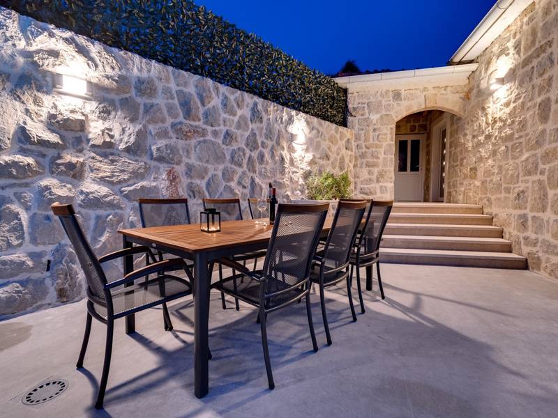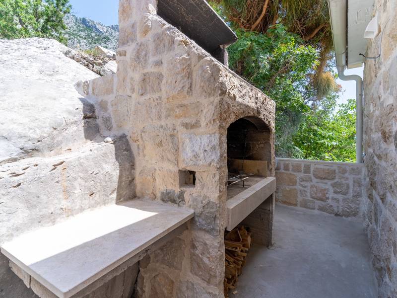 This beautiful stone villa is newly built on an old family stone house, following the traditional architecture and stone facade, connecting it with modern and very pleasant details to make your stay very comfortable and unforgettable. Villa The King is a well-equipped 135sqm house organized on two floors connected by an internal staircase, and a separate apartment connected with the outdoor staircase (all offered exclusively for onegroup). It is nestled on a 340sqm fenced property, and it is situated at the end of the street in a quiet area named Borak above small town Omiš (3km). Villa is offering breathtaking views over the small Church of St. Stephen, the Omiš city, Adriatic sea, the coast, the islands and the Omiška dinara hills, with attractive walking trail to the highest summit of Omiska Dinara named Kula (863m above sea level). The nearest minimarket is 2km far, and supermarkets, restaurants, pharmacy and the nearest beach is 3km far from villa. The car is needed as you are located up on the hills, 3km above the coastal road. 3 parking places are secured in front of the property. Villa The King offers modern and comfortable accommodation for max 8 persons in 4 bedrooms which is ideal for a family or a group of friends who will enjoy this quiet and traditional environment. It is fully air-conditioned, with free WiFi, with 2 living areas with a PlayStation 5 in one living room, 4 bedrooms, 2 kitchens, 2 family bathrooms and one toilet. Here is the detailed floor organisation: * The OUTDOOR area offers a stunning 24.5 sqm (7x3.5m) swimming pool with hydromassage overlooking the sea and Omiš. The outdoor area (West orientation) includes a spacious sun deck area with 8 lounge chairs, an outdoor shower, 2 sun-umbrellas, and an outdoor dining area for 8 people where you can relax at any time of day or night. There is a small playground with a slide and some tos for your youngest. A traditional barbecue is located next to the main entrance to the house, next to the outdoor dining area.* The GROUND floor includes a very light and pleasant living area with a comfortably furnished and fully equipped kitchen with all the needed amenities you would need (microwave oven, toster, kettle, Nesspresso coffee machine, fridge with ice maker...), Air-condition, a spacious dining area for 8, and a living room with smart TV, there is a balcony connected to additional terrace with lounge corner (South orientation), a perfect spot for evenings enjoying a nice glass of Croatian vine. There is also a Bedroom No1 (12sqm) with a king size bed 180cm x 200cm, A/C, amazing sea views and an exit toward the balcony and South terrace. Bedroom No2 (8sqm) with a bunk bed with one bed size is140cm x 200cm, and the one above is 90cm x 200cm, Air condition and sea views. A Family Bathroom with a shower is on the ground floor. * The 1st FLOOR is reached with an indoor staircase that leads you up to an opened and very cute attic Bedroom No3 (15sqm) with 2 single beds 80cm x 200cm and a separate Toilet with a sink.* The LOWER GROUND floor offers a separate apartment that is located above the parking lot, below the sun terrace and reached with an outdoor staircase. There is a fully equipped and air conditioned living area that offers a kitchen (fridge, oven, stove...), a washing machine, a dining table for 2 people, a sofa with a smart TV and a Playstation 5. Bedroom No4 (12sqm) with a king size bed 180cm x 200cm, air-condition and sew views. A separate family bathroom with a shower. The owner lives next door and is there at your disposal if needed. You have absolute privacy and all listed is only for your use exclusively. Once you come to this property, you will feel the traditional easy way of living that all of us need at least while on vacation.