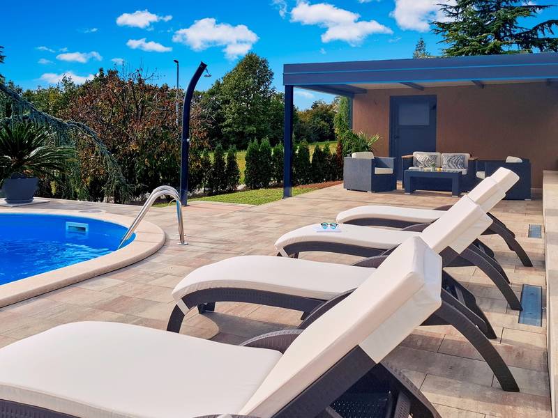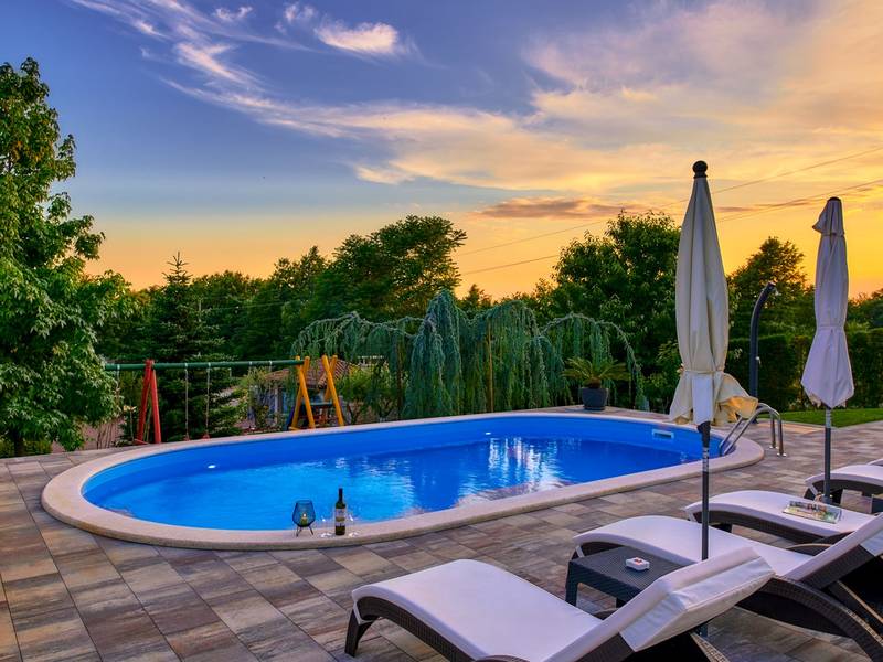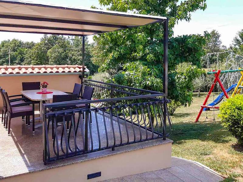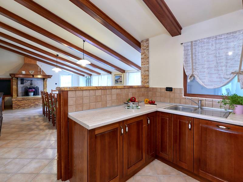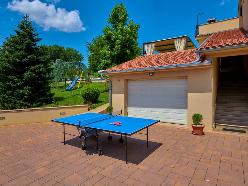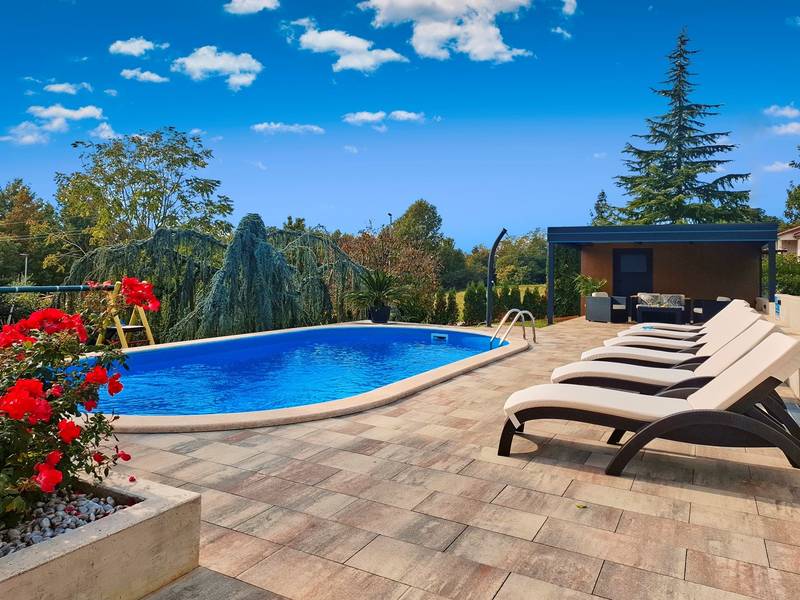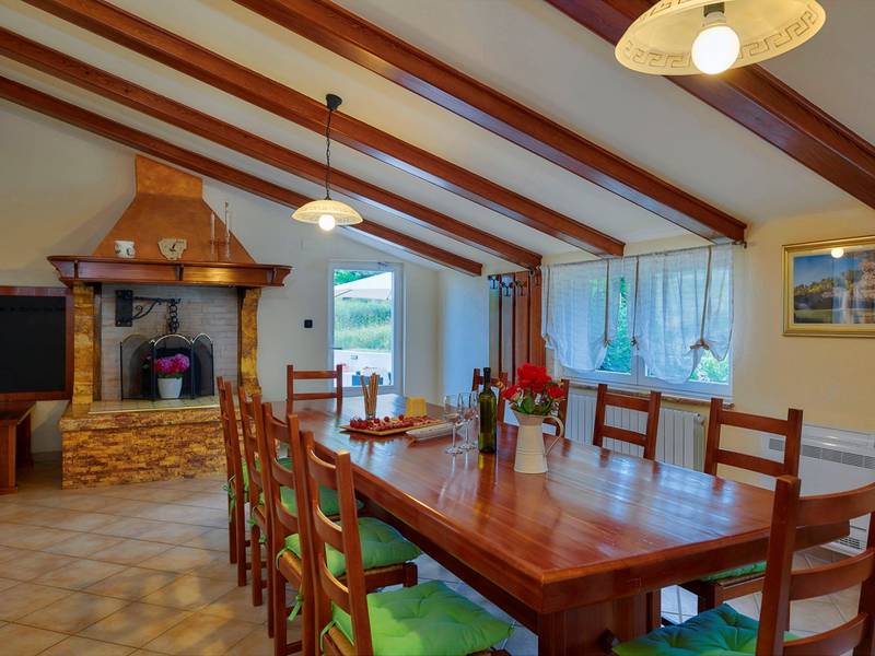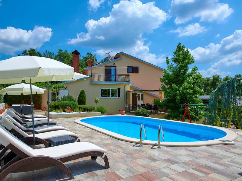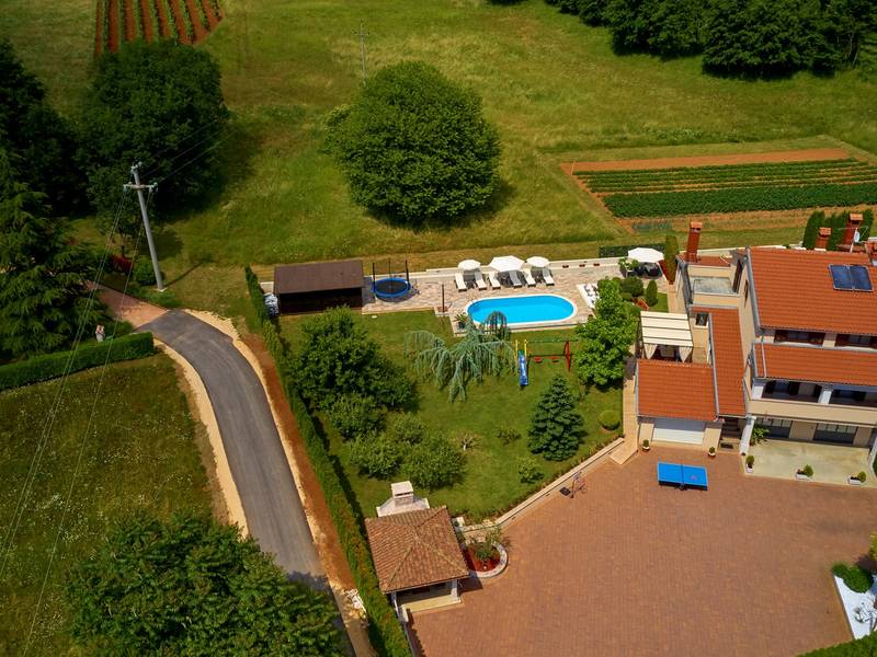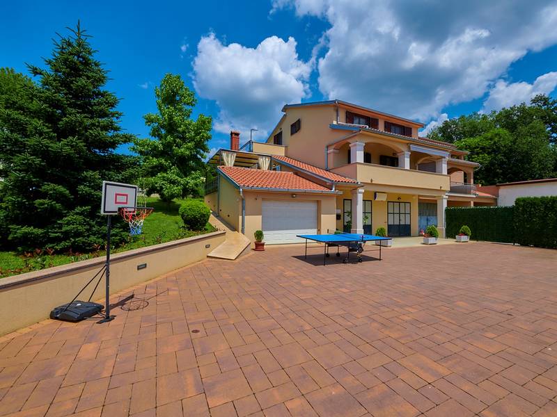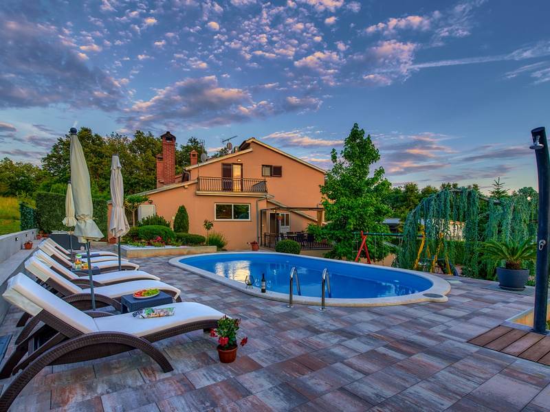 Holiday House Mikela is situated in central Istria, in the peaceful village of Žbrlini near Pazin, offering privacy, comfort, and excellent amenities for families and active travellers. The fully fenced 1,100 m2 garden ensures safety and seclusion and features a private 32 m2 outdoor swimming pool with sun loungers, parasols, and quality outdoor furniture. A covered terrace with an outdoor fireplace creates the perfect setting for barbecues and relaxed evenings. The property offers numerous leisure facilities including a swing, slide, basketball hoop, table tennis, table football, and darts. The house extends over two floors. The ground floor includes a living room, kitchen, bathroom, covered terrace, and an additional kitchen with a spacious gathering area with direct pool access. Upstairs are three bedrooms (two double, one twin), a bathroom, and a terrace with views of the pool and greenery. It accommodates up to 8 guests (6+2). All rooms are air-conditioned and fitted with mosquito screens. A small family printing shop operates on the ground floor in the mornings, and the monitored parking area is shared during those hours. Nearby are cycling and hiking trails, wineries, agrotourism farms, horse riding opportunities, and the Pazin Cave adventure attractions just 6 km away.