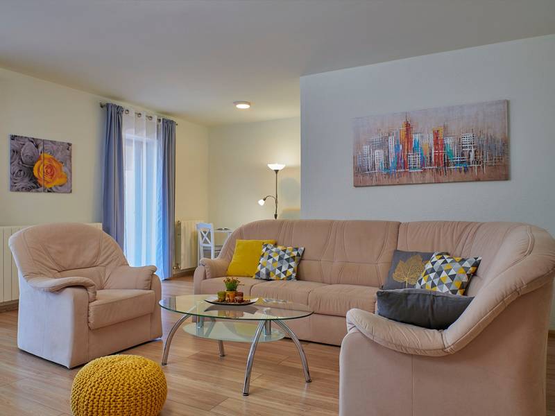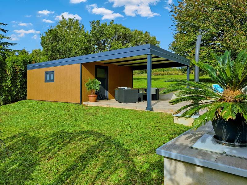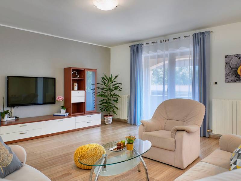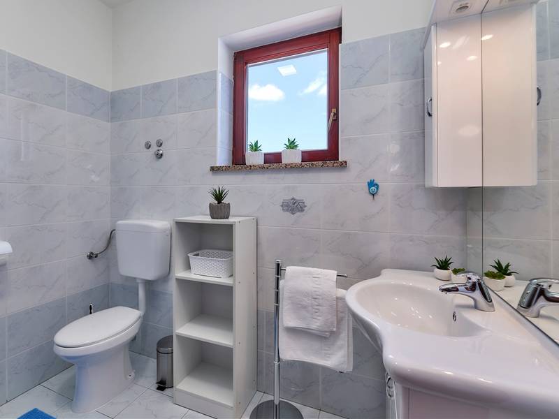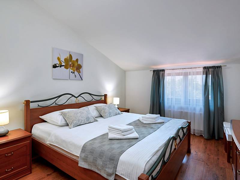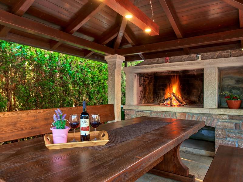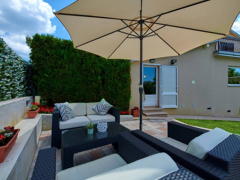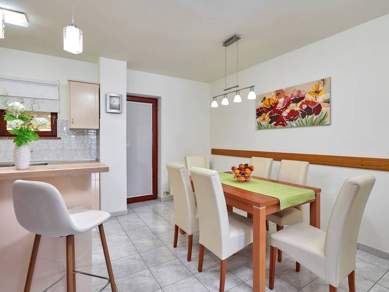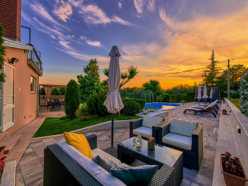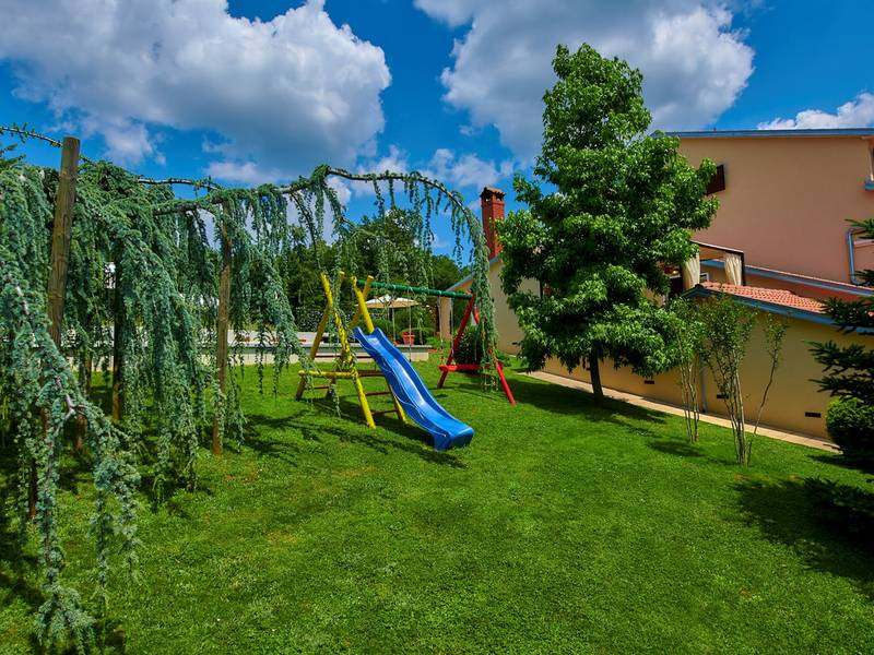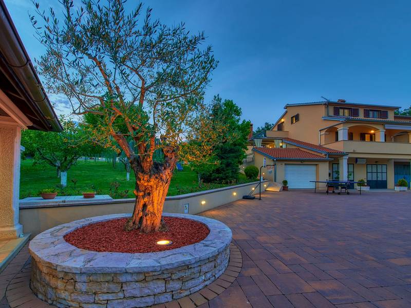 Holiday House Mikela is situated in central Istria, in the peaceful village of Žbrlini near Pazin, offering privacy, comfort, and excellent amenities for families and active travellers. The fully fenced 1,100 m2 garden ensures safety and seclusion and features a private 32 m2 outdoor swimming pool with sun loungers, parasols, and quality outdoor furniture. A covered terrace with an outdoor fireplace creates the perfect setting for barbecues and relaxed evenings. The property offers numerous leisure facilities including a swing, slide, basketball hoop, table tennis, table football, and darts. The house extends over two floors. The ground floor includes a living room, kitchen, bathroom, covered terrace, and an additional kitchen with a spacious gathering area with direct pool access. Upstairs are three bedrooms (two double, one twin), a bathroom, and a terrace with views of the pool and greenery. It accommodates up to 8 guests (6+2). All rooms are air-conditioned and fitted with mosquito screens. A small family printing shop operates on the ground floor in the mornings, and the monitored parking area is shared during those hours. Nearby are cycling and hiking trails, wineries, agrotourism farms, horse riding opportunities, and the Pazin Cave adventure attractions just 6 km away.