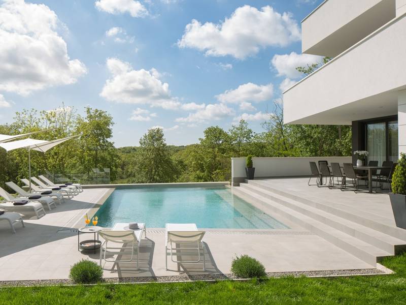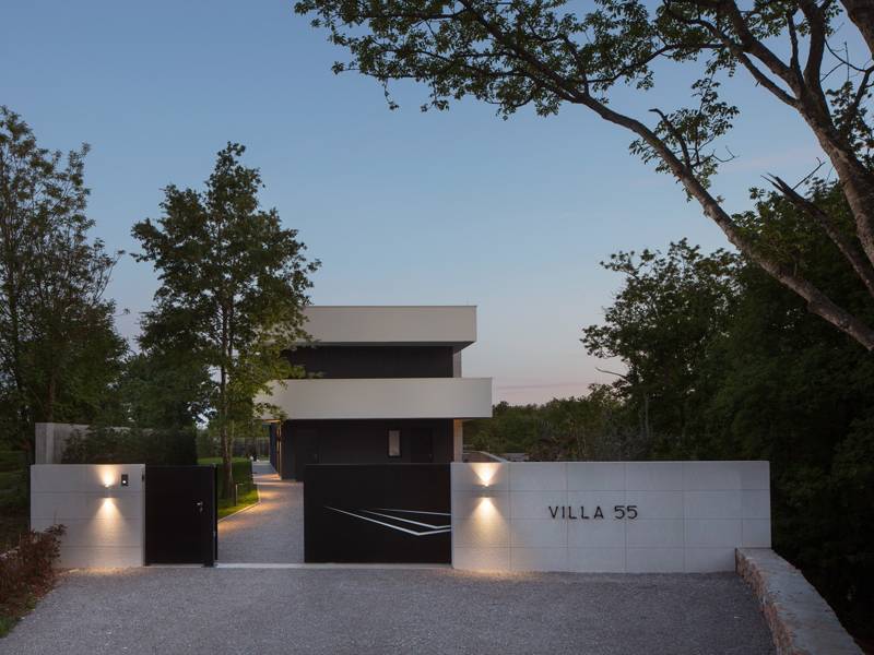 Newly built, luxurious Villa 55 is located in Vela Traba in central Istria, near Pazin. A stylish and elegant exterior and interior, will surely delight all guests with its urban look and interesting construction. Surrounded by greenery, Villa 55 offers a beautiful view of the surrounding nature. The villa is luxuriously furnished, and with 433 m2 of space has 4 comfortable bedrooms, each one equipped with a double bed and access to its own private bathroom. Guests also have two separate bathrooms providing them with absolute comfort. On the ground floor of the house is a spacious kitchen equipped with everything that guests could need during their stay, including two refrigerators and two ovens. Another small kitchen unit that will surely appeal to wine lovers is located in the tavern. All guests can comfortably dine in the dining room, while in the spacious living room they can relax at any time of the day. In a completely fenced yard with a surface of 3400 m2, there is a beautiful infinity, heated swimming pool (55 m2) and a children's pool (16 m2) for the youngest guests. The pool can be heated on request. You can relax on the sun loungers by the pool or in the wellness area with a sauna and a jacuzzi. Guests of the villa also have outdoor exercise machines available, an outdoor dining table, a beautiful sitting-room for relaxation in complete privacy and a barbecue area. The villa also has 4 private parking spaces and a charger for electric cars.