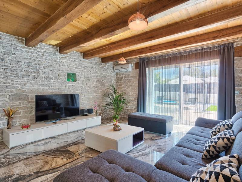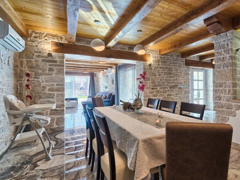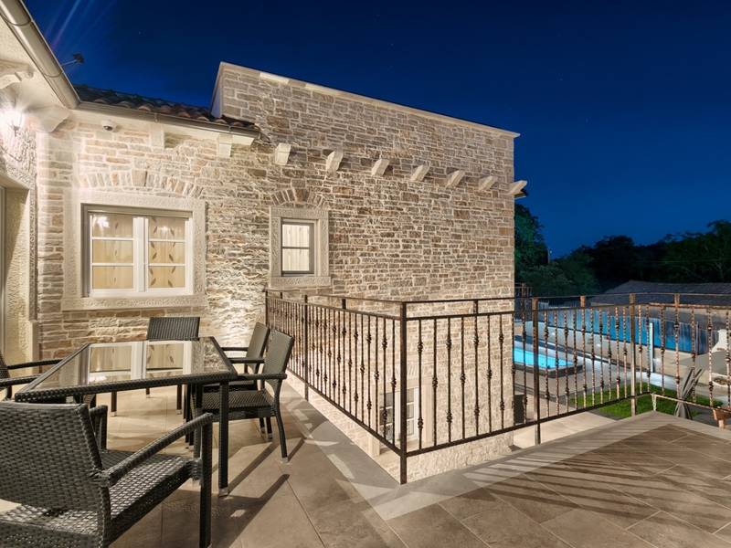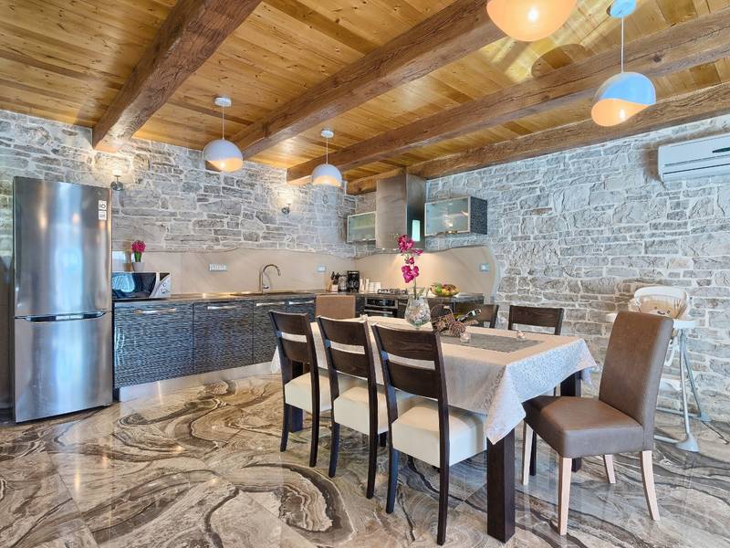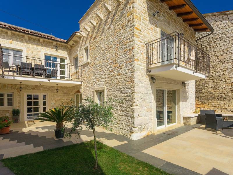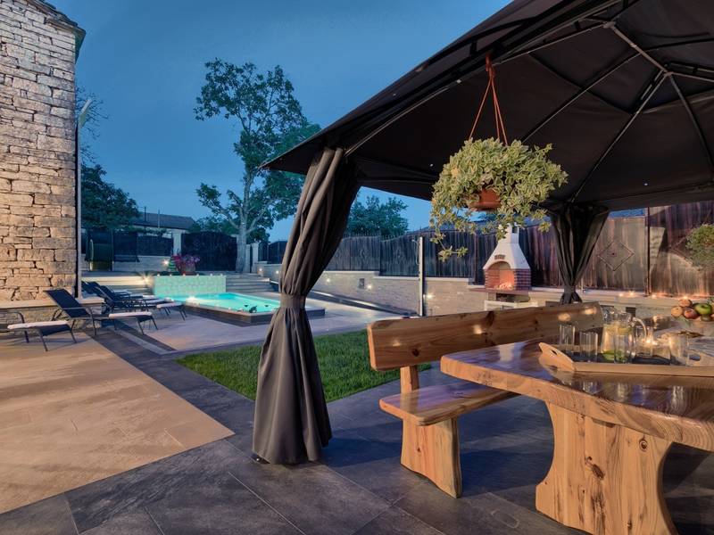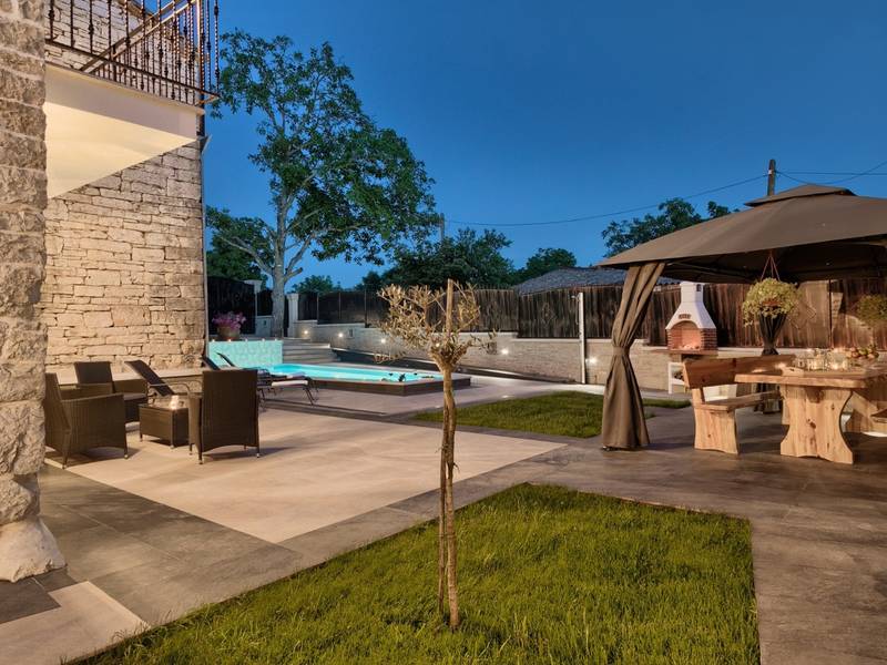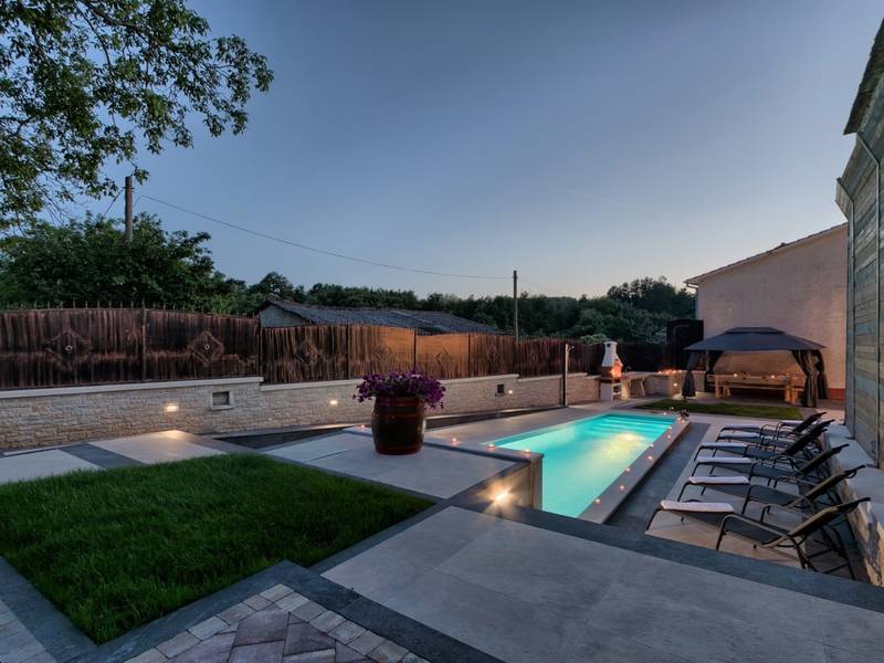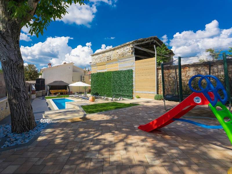 Located in a peaceful and authentic Istrian village near Pazin, this charming stone villa perfectly combines traditional architecture with modern comfort. Carefully renovated with attention to original details, the house offers a warm and relaxing atmosphere, ideal for a family holiday or a stay with friends.The spacious interior is designed to ensure maximum comfort and functionality. Guests have access to four elegantly furnished bedrooms, each with a private bathroom, air conditioning, and a TV, while the shared living room with a fireplace creates a cozy space for gathering throughout the year. A modern, fully equipped kitchen is connected to the dining area, providing the perfect setting for shared meals.The outdoor area further enhances the sense of privacy and relaxation. The fenced garden with a swimming pool, sun loungers, and covered terraces offers ideal conditions for enjoying the outdoors. Guests can also use the BBQ, children’s playground, and secured parking within the property.Thanks to its central location, the villa is an excellent starting point for exploring Istria – from picturesque towns and historical landmarks to outstanding restaurants and wine roads. It is the perfect choice for those seeking an authentic Istrian experience combined with privacy and comfort.