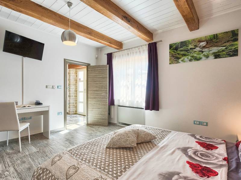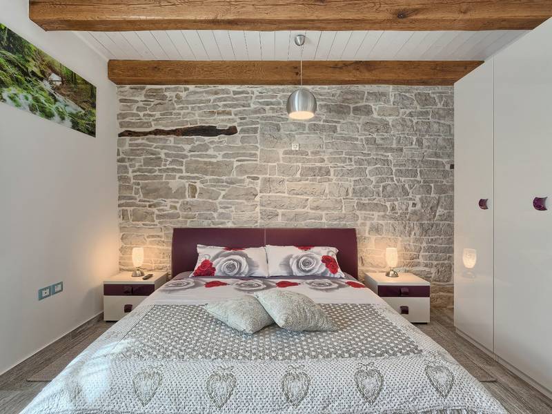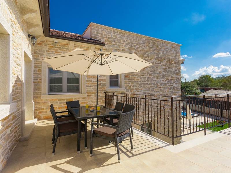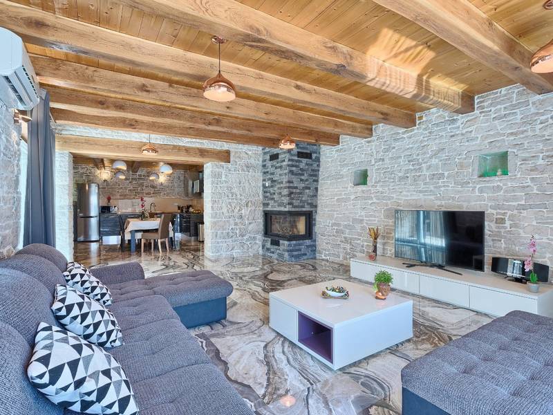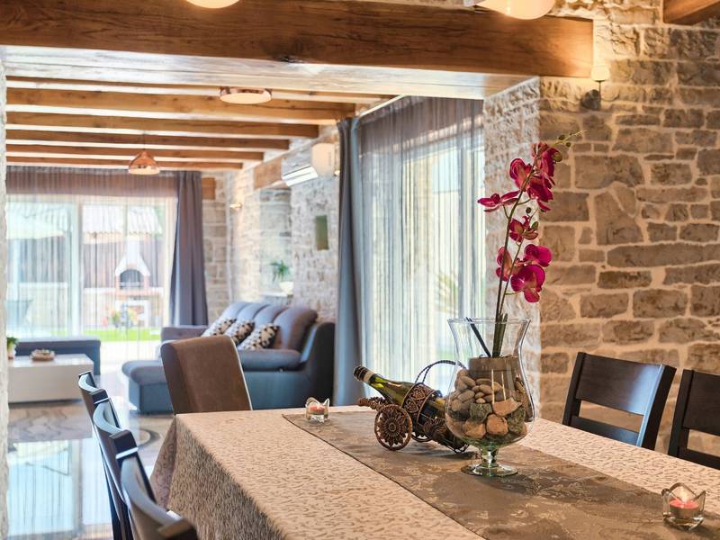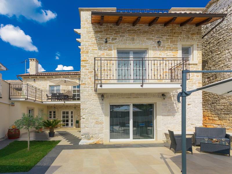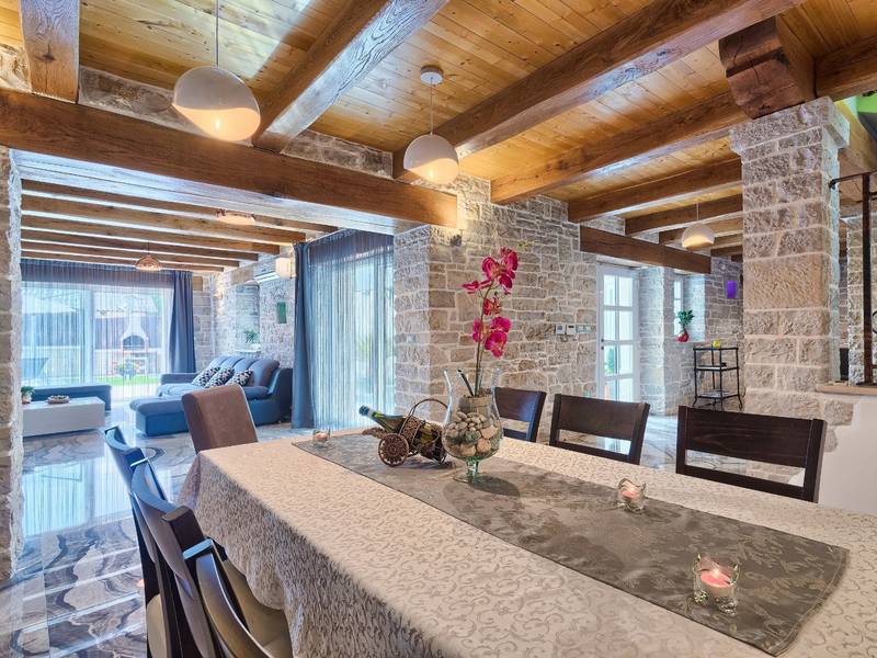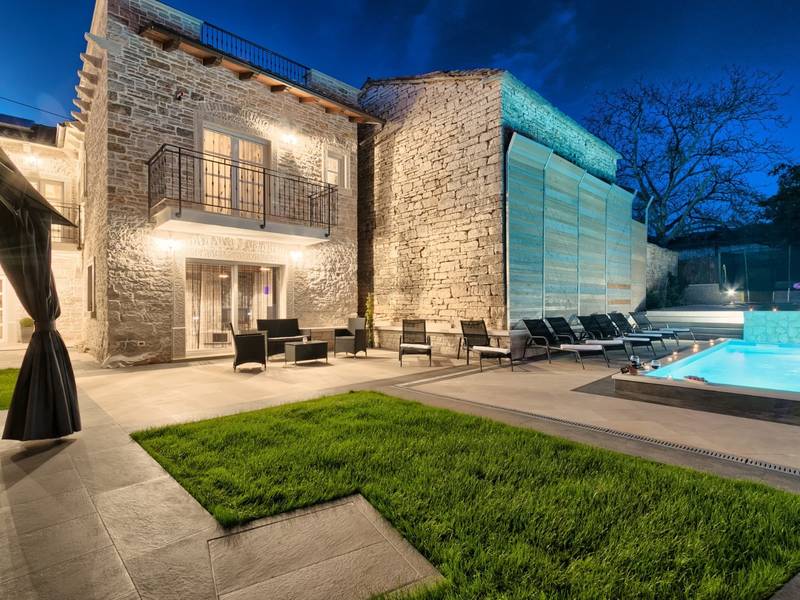 Located in a peaceful and authentic Istrian village near Pazin, this charming stone villa perfectly combines traditional architecture with modern comfort. Carefully renovated with attention to original details, the house offers a warm and relaxing atmosphere, ideal for a family holiday or a stay with friends.The spacious interior is designed to ensure maximum comfort and functionality. Guests have access to four elegantly furnished bedrooms, each with a private bathroom, air conditioning, and a TV, while the shared living room with a fireplace creates a cozy space for gathering throughout the year. A modern, fully equipped kitchen is connected to the dining area, providing the perfect setting for shared meals.The outdoor area further enhances the sense of privacy and relaxation. The fenced garden with a swimming pool, sun loungers, and covered terraces offers ideal conditions for enjoying the outdoors. Guests can also use the BBQ, children’s playground, and secured parking within the property.Thanks to its central location, the villa is an excellent starting point for exploring Istria – from picturesque towns and historical landmarks to outstanding restaurants and wine roads. It is the perfect choice for those seeking an authentic Istrian experience combined with privacy and comfort.