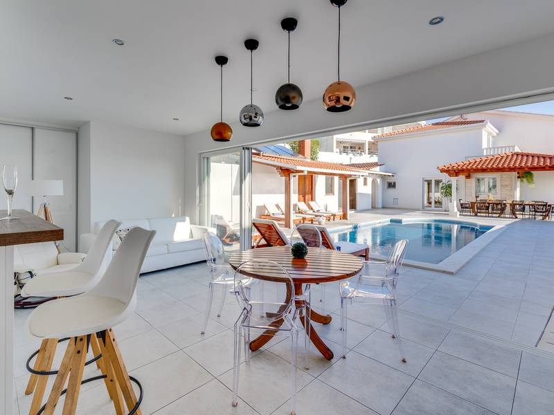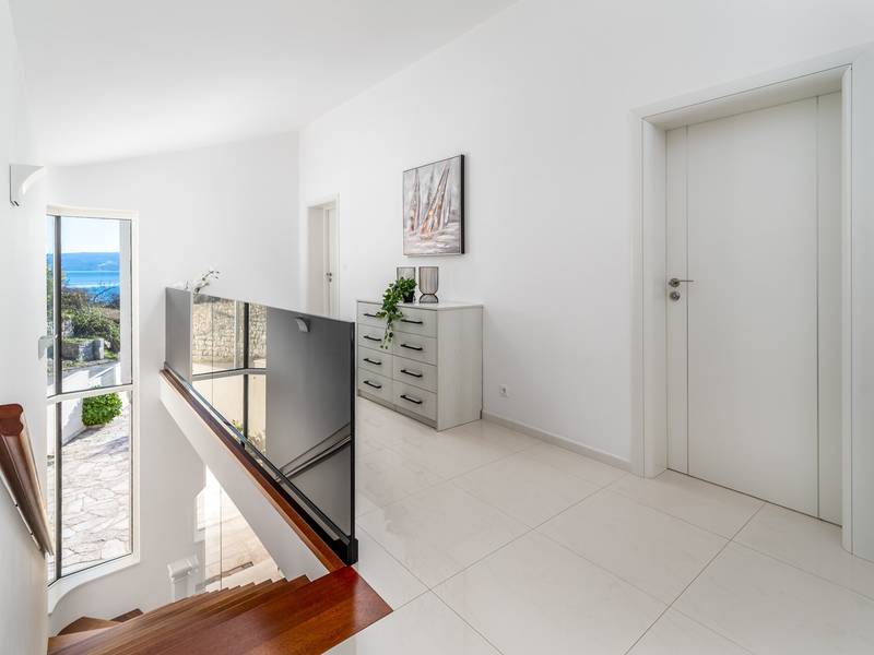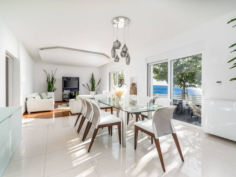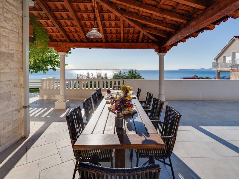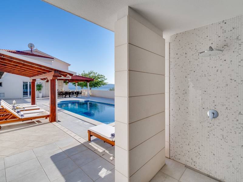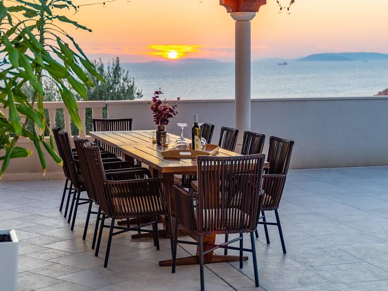 Villa MaToLi is a stylish and comfortable 250 sqm property on an 850 sqm fenced plot and can accommodate 8+1 people. Villa MaToLi offers a private and heated pool 10m x 5m, a summer kitchen, an outdoor dining area, a fully air-conditioned interior with free WiFi, a stylish living room, a fully equipped kitchen, 4 bedrooms (each with sea views and a balcony), and 3 bathrooms.Villa MaToLi is located in Podstrana at the most beautiful part of the Dalmatian coast, above the coastal road in a quiet area between the famous town Split (10 km to center) and small-town Omiš and Cetina river (13 km), so staying here offers amazing sea views and unforgettable sunsets, very comfortable and stylish accommodation, besides that you can also experience a well wide spectrum of opportunities for an active holiday. Several restaurants and shops are within a short driving distance (200m - 2km). The car is recommended, and there is a secured and fenced parking lot at the property for 2-3 cars and a garage for 1.Seaview Villa MaToLi offers:* The outdoor offers a private and heated swimming pool 10m x 5m, a very spacious sun deck area with 8 deck chairs and two covered areas, a covered outdoor dining area for 10 people, a summer kitchen, a traditional barbecue area, an outdoor shower, and a separate toilet. There is also a comfortable lounge corner in front of the living room, so there are multiple areas where you can enjoy your privacy, read a book, or simply enjoy and dine alfresco with your family/friends.* The ground floor offers a fully air-conditioned living and dining area that has glass doors on the Southside, offering indeed amazing sea views and a lot of daylight inside. There is a fully equipped and modern kitchen with all the amenities that a modern guest needs for a relaxing stay, a direct approach to an outdoor dining area, a stylish dining area, comfortable sofas, a flat-screen TV, and a PS4 for your youngest members. On the Westside, there is a Bedroom No1 with a double bed of 140cm x 200cm, an air-conditioned, TV, a direct approach toward the pool area, and an en-suite bathroom with a shower. There is also a separate toilet, and a washing machine is next to it.* Indoor staircase with a glass wall offers daylight in every corner of this lovely property interior, and it takes you to the first floor that offers a Bedroom No2 (South-East) with a Queen size bed 160cm x 200cm, an air conditioner, en-suite bathroom with a shower, a balcony with sea views. A Bedroom No3 (South) with a King size bed 180cm x 200cm, a sofa that converts into a sofa bed for 1 person, a balcony with a sea view. A Bedroom No4 (South-West) with a Queen size bed 160cm x 200cm, an air conditioner, and a balcony with sea views. Bedrooms No3 and No4 share a family bathroom with two sinks and a shower. There is a separate toilet next to it.This villa is a perfect choice for a family or friends' vacation close to the beach, where you can try it all or just enjoy and experience the relaxing mode of life, staying at this amazing villa.Extra services (not included) recommended by our agency, Feriehome:- You can order a grocery delivery from the comfort of your sofa, delivered to your villa at the agreed time;- Enjoy a culinary experience with an in-villa private chef who can prepare everything, from a romantic dinner to a family-friendly dinner;- You can have an in-villa massage with our professional masseuse who can show their therapeutic skills;- Get a feel for the Adriatic and some sailing experience with a sailing boat (+skipper);- Take a boat tour to explore the middle Dalmatian coast and islands...for more information, we are at your disposal and will gladly help.Looking forward to your inquiry,Your Feriehome agency team :)